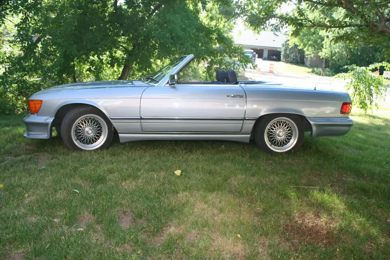 A very fast, safe and heavy convertible, this 1984 model 500 SL roadster is in great running condition. This is a great touring or highway car, smooth riding and agile, with a wonderful throaty roar. The deep blue cloth top is recent, the original hardtop plus hoist and pulley to hang it are also included. A small backseat has safety belts, and folds down for extra luggage space. Wide radial tires are recent, and this sports car has "Zender" bumpers.