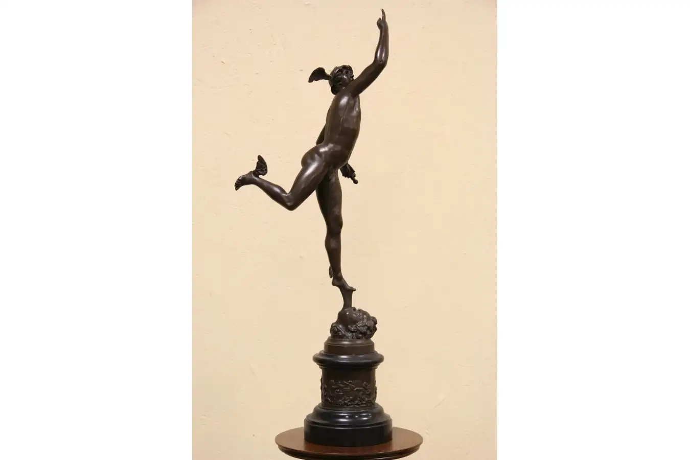 One of the most famous sculptures of the Renaissance, the god "Mercury" by Giambologna is represented in this bronze statue from about 1900.
