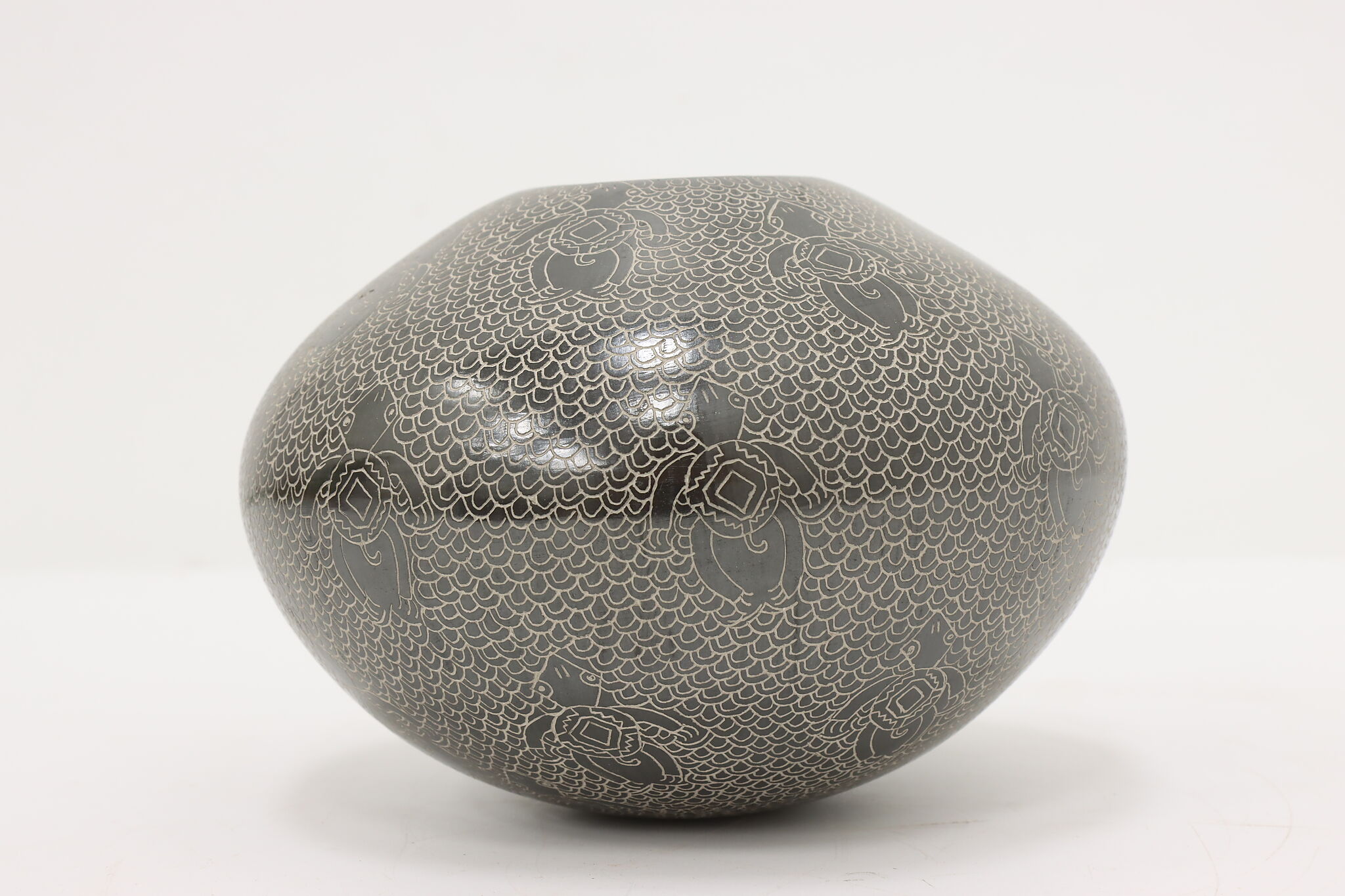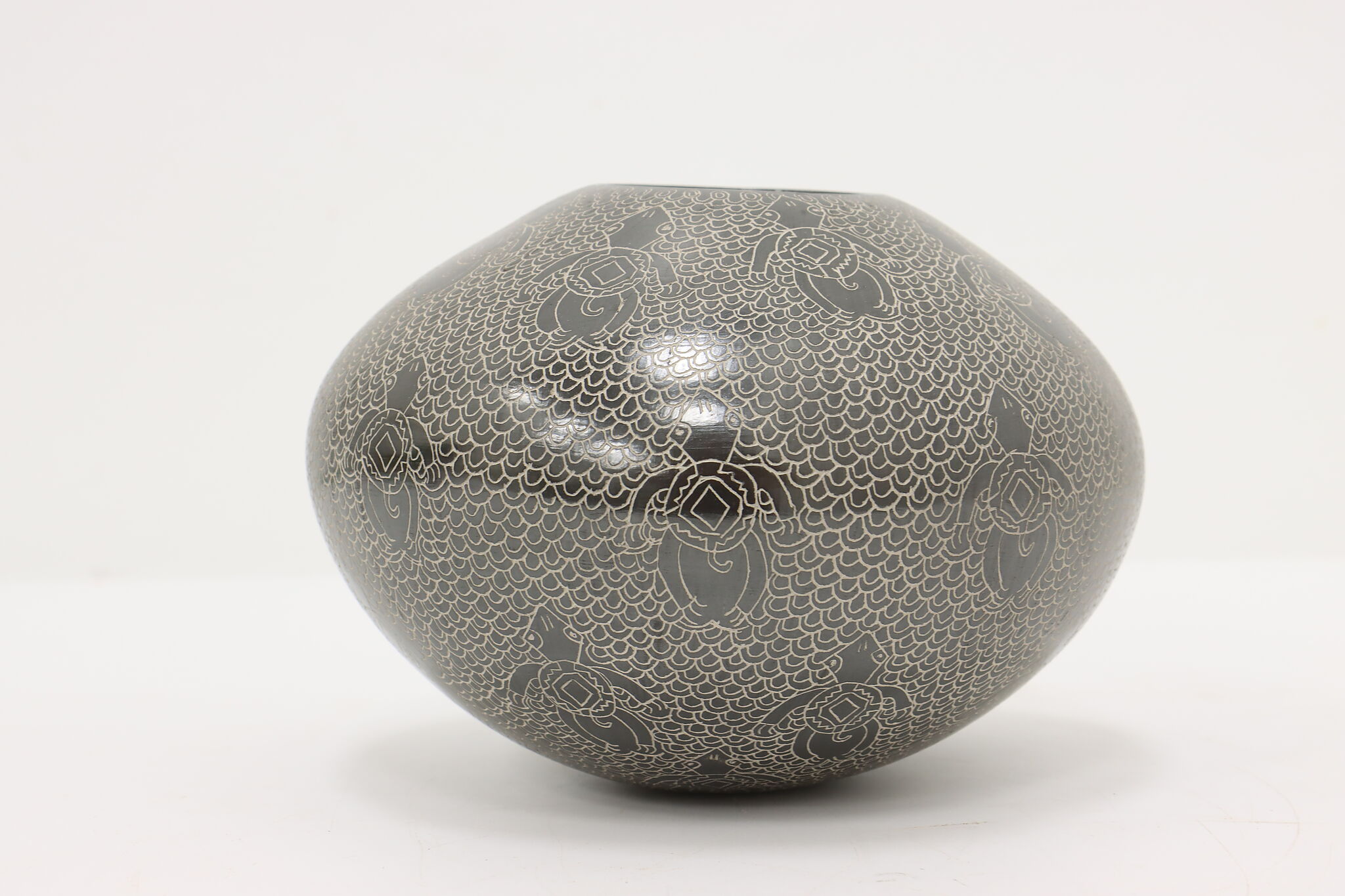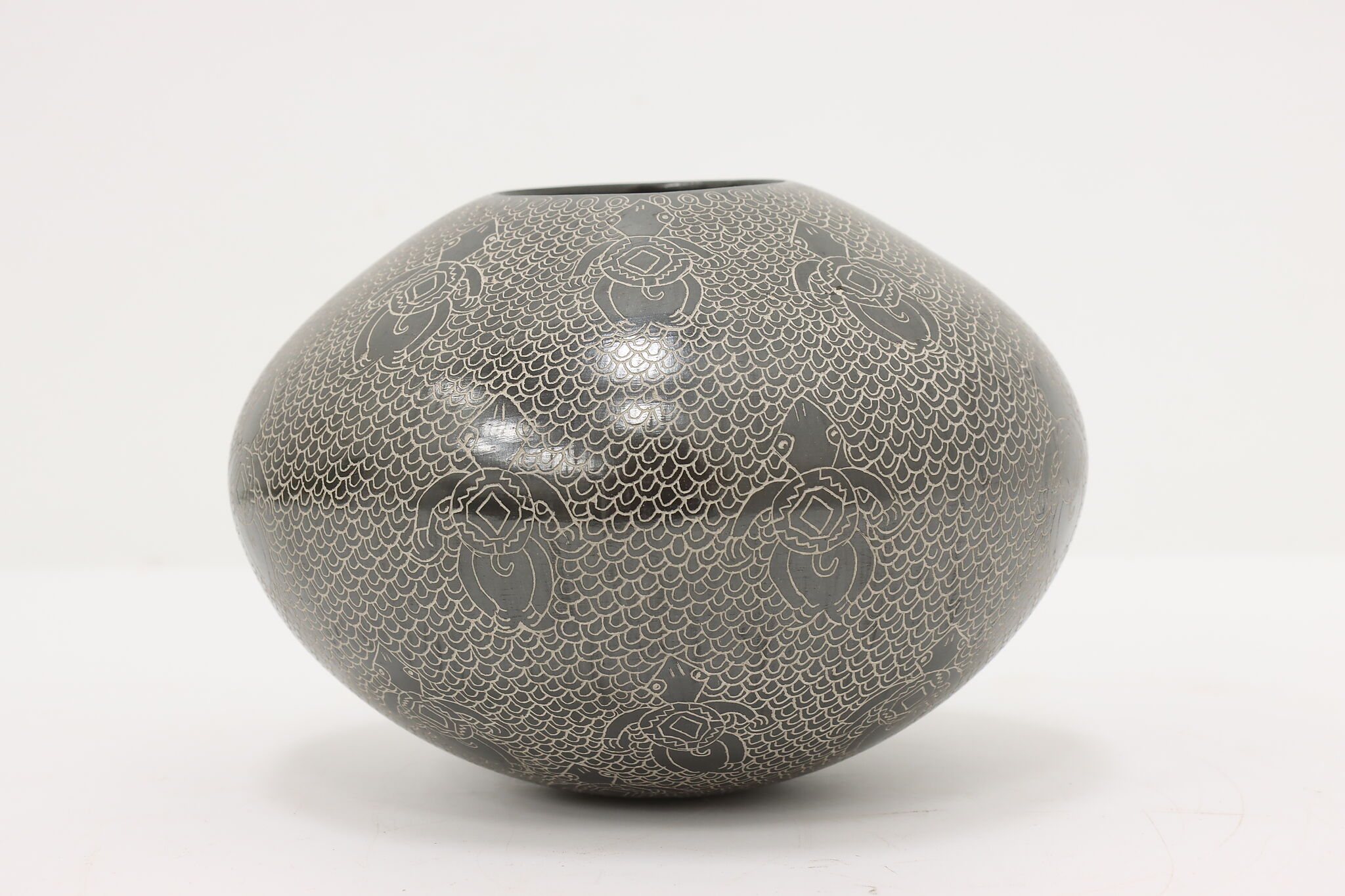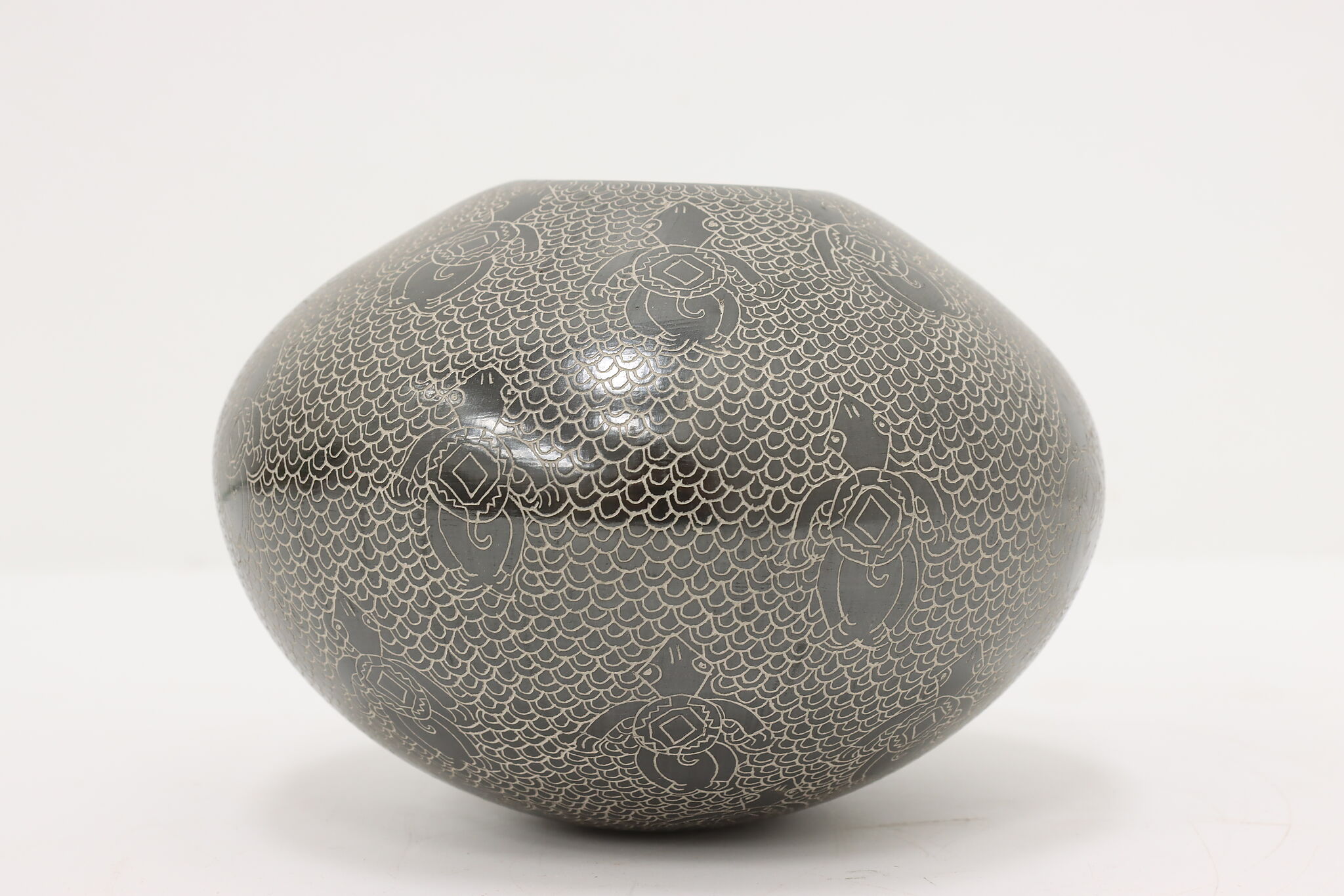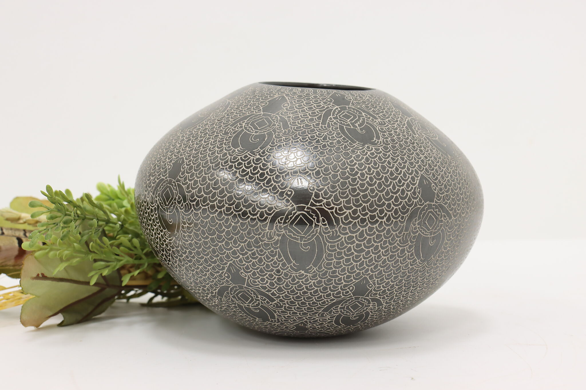 This stunning vase with turtles was handmade in the Mata Ortiz Pueblo of Mexico, a famous location for antique pottery and ceramic traditions.