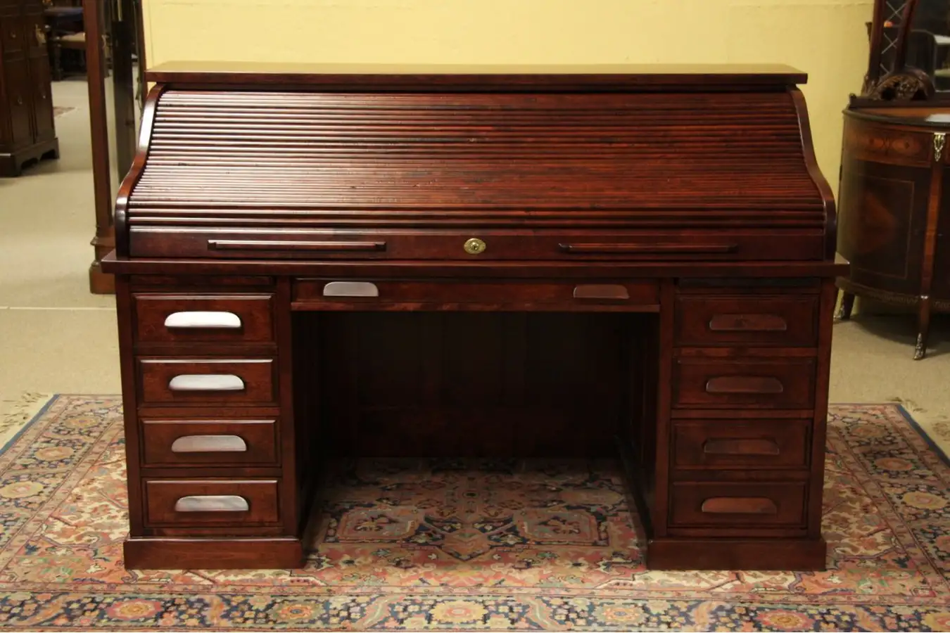 An outstanding antique roll top desk is signed "Michigan Desk," and has raised panels on all sides. The "S" curve top slides smoothly, inside are tiny cubicles and drawers with original pulls and label holders, plus a tiny pencil drawer.