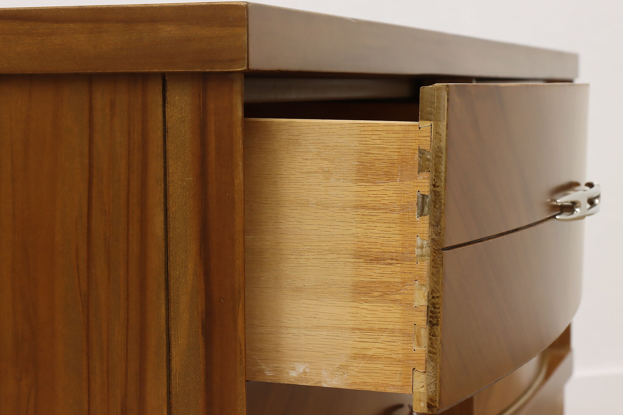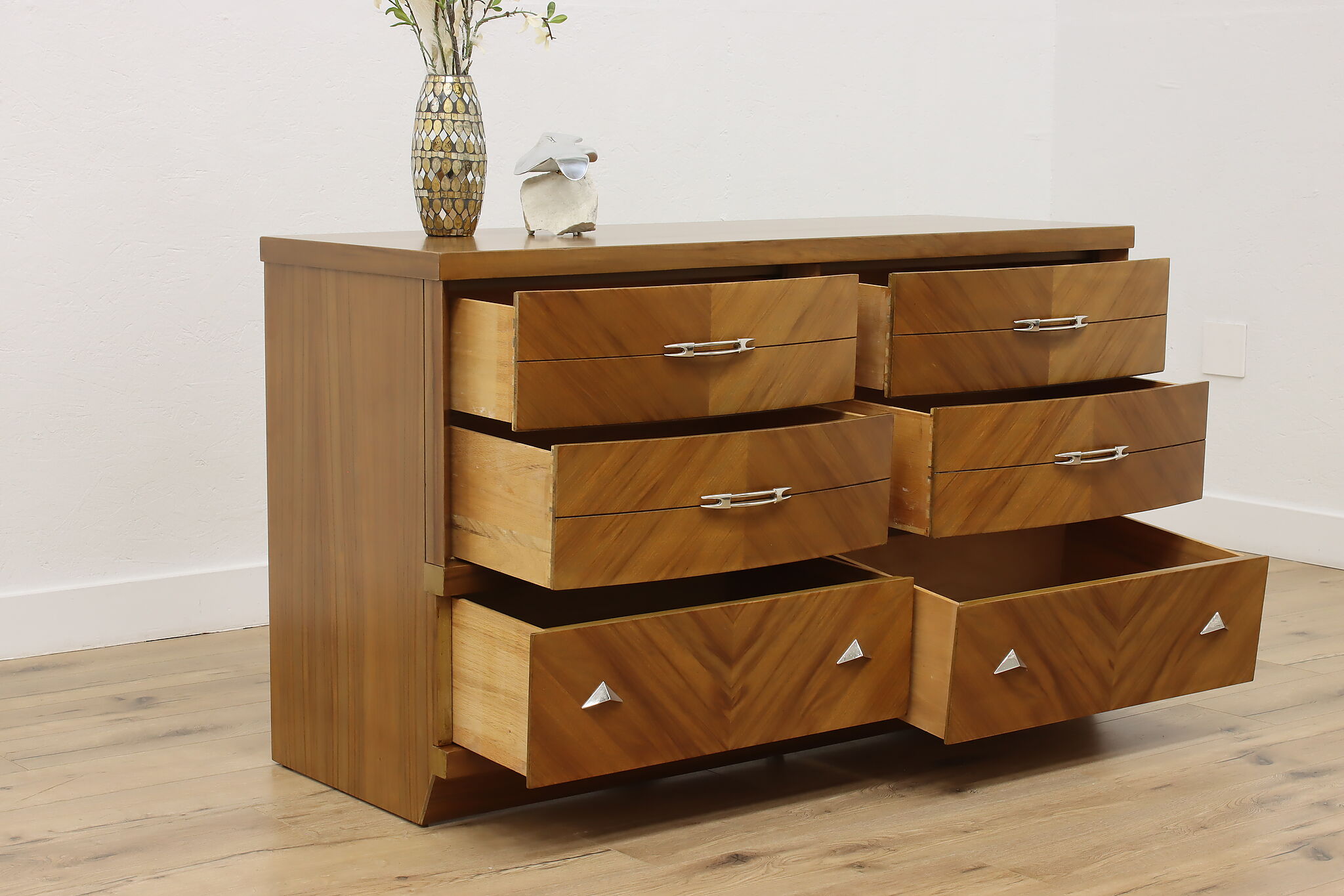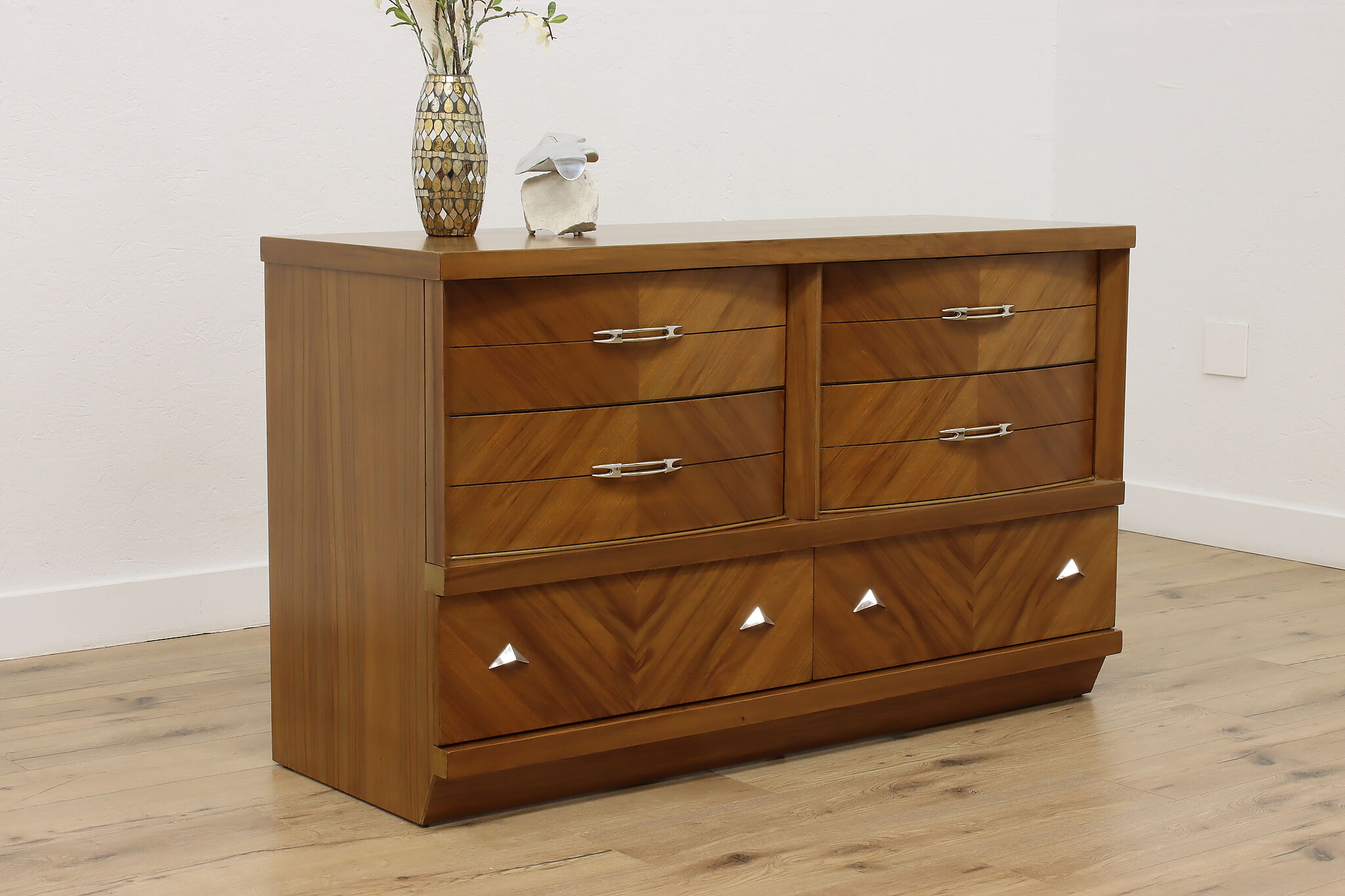 The polished nickel drawer pulls give this low chest or dresser marvelous Midcentury Modern charm.