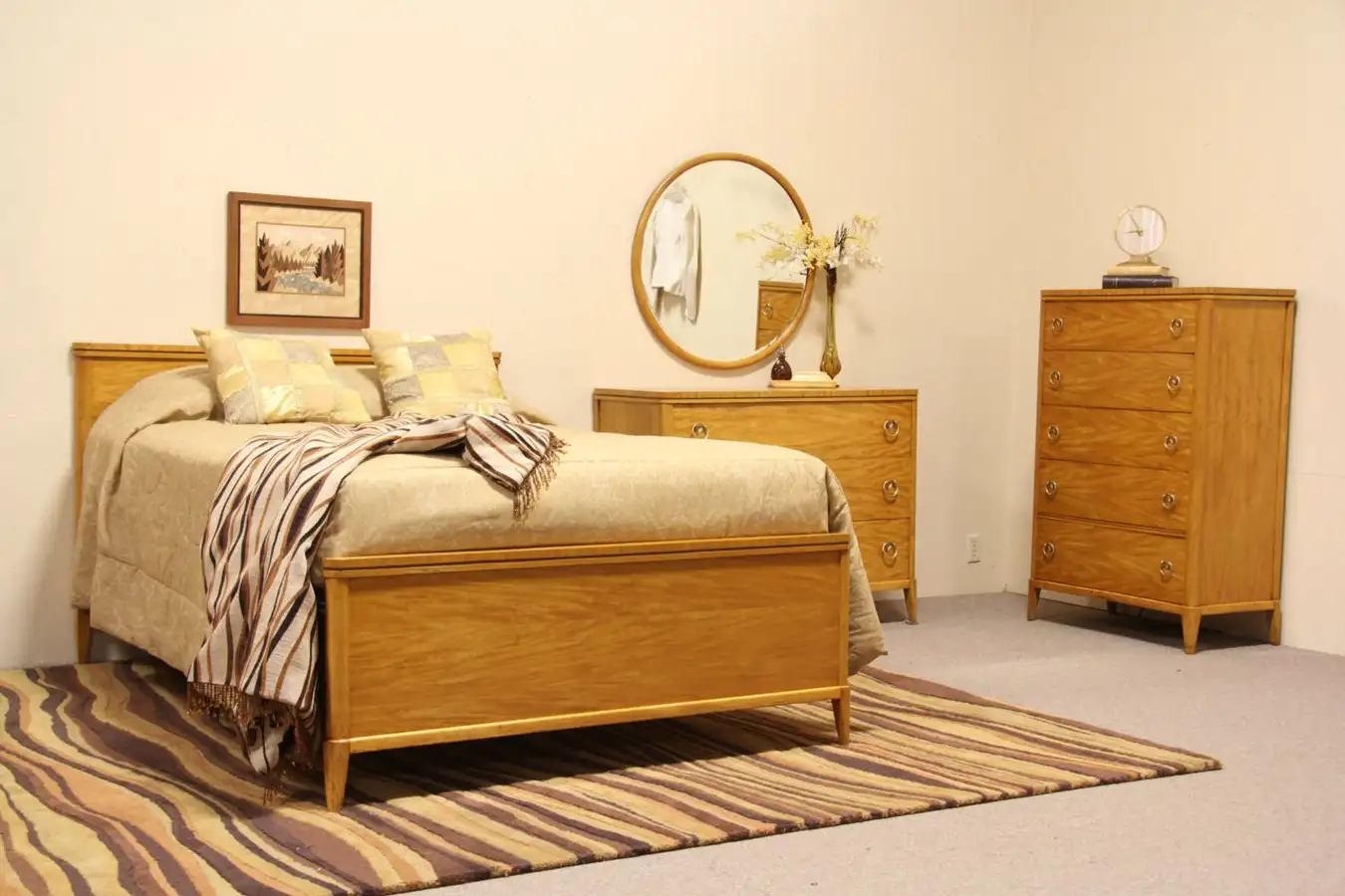 A striking Midcentury Modern 3 piece bedroom set includes a full size bed, tall chest of drawers and a dresser with wall mirror from the 1950's.