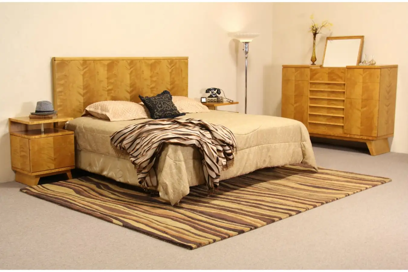 A dazzling four piece Midcentury Modern bedroom set was signed by the maker in Sweden about 1950. The set includes a king size headboard, large dresser or chest with folding dressing mirror and two nightstands.