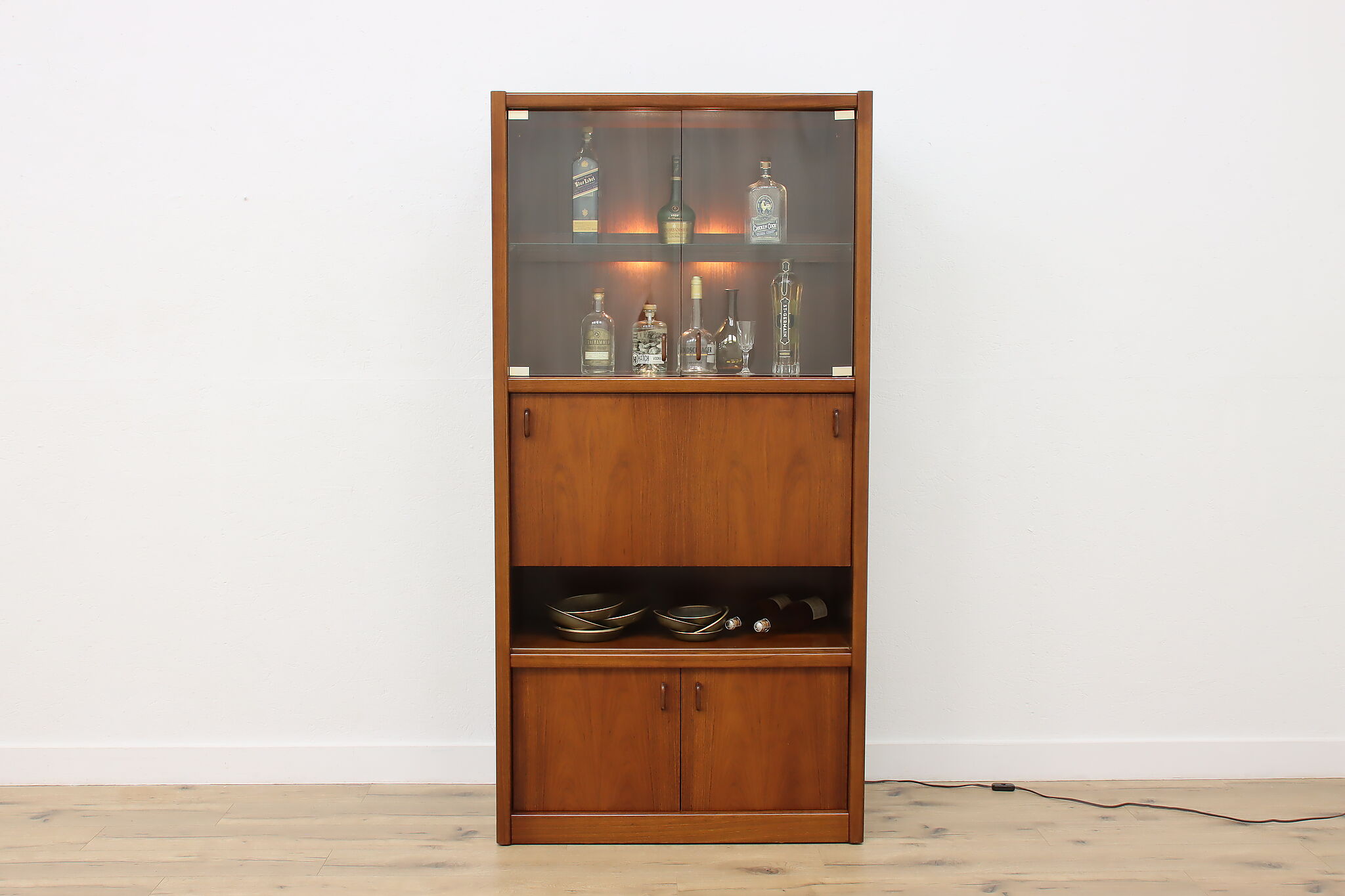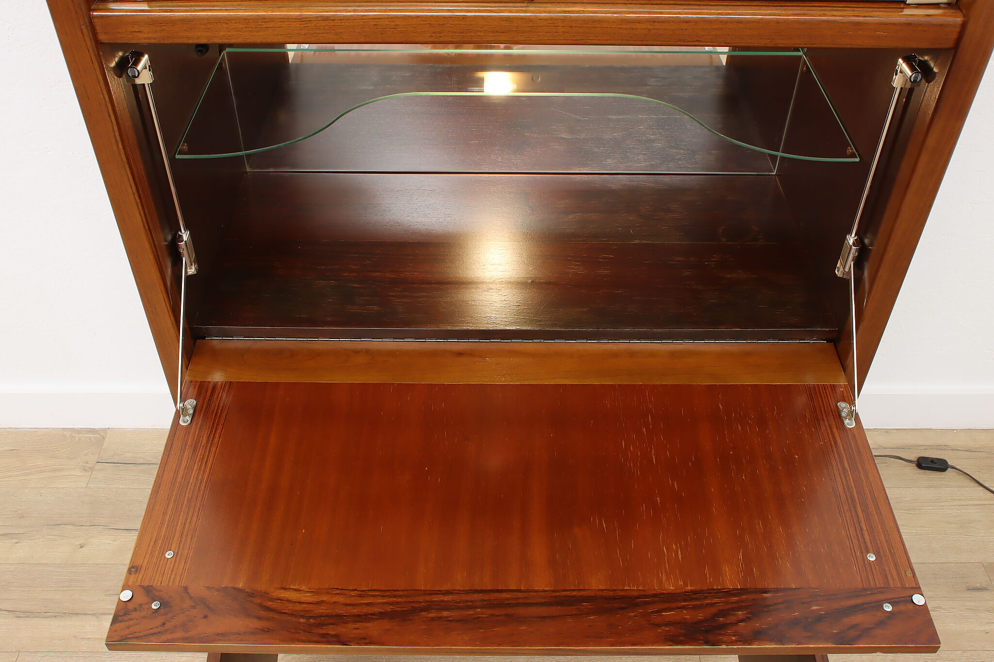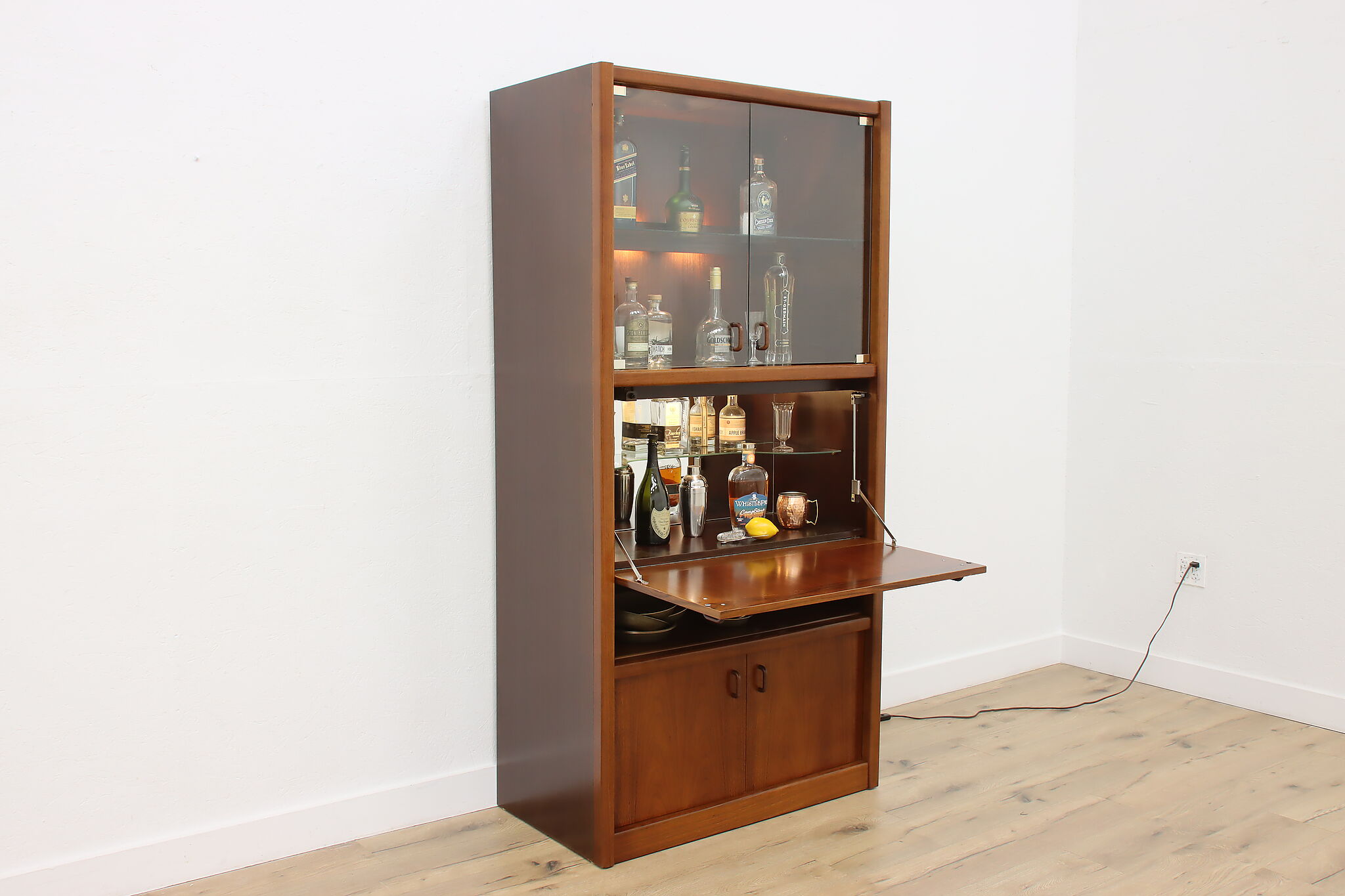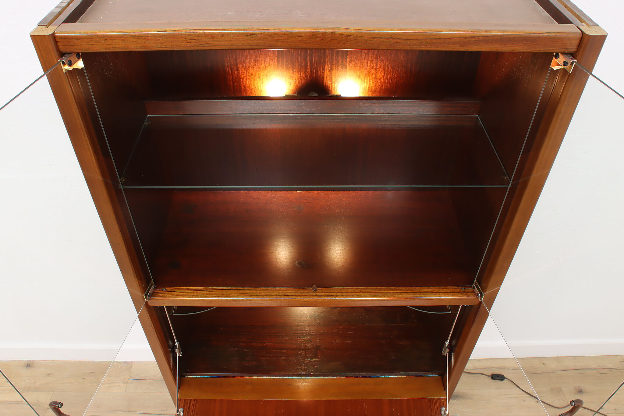 A charming Midcentury Modern bar or display cabinet has a lit interior to showcase your excellent taste in liquors and art pieces.