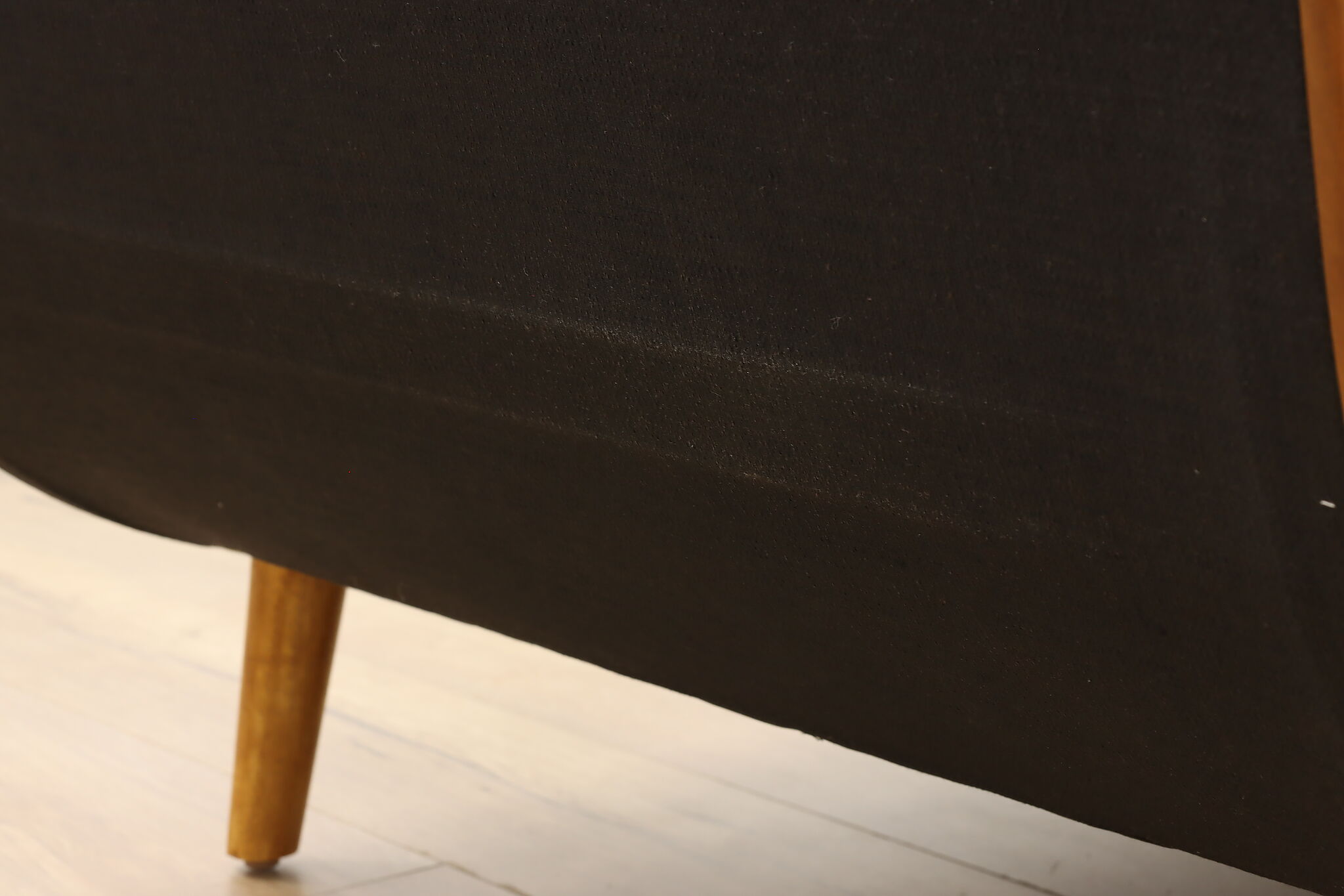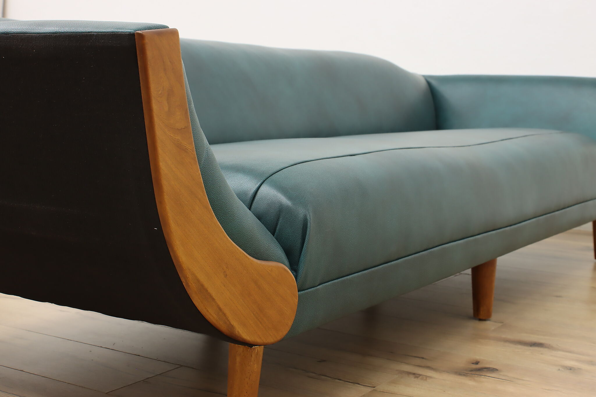 Fabulously upholstered with new textured leather, this Midcentury Modern sofa or couch is a beautiful piece for a vibrant living space.