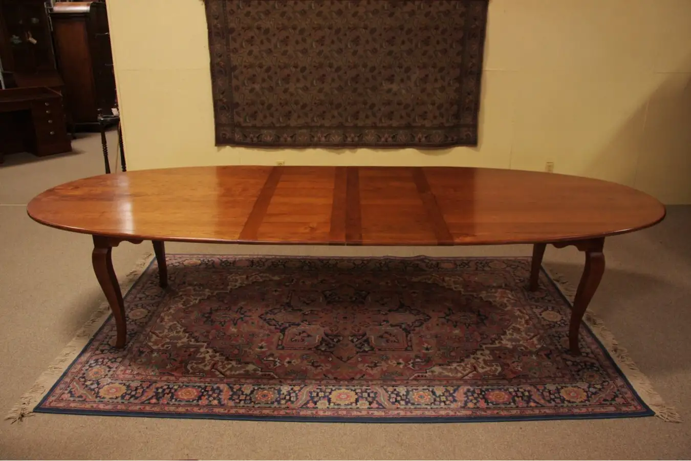 Signed by famed designer, Mike Bell, this custom solid cherrywood dining table has 2 leaves and stretches to 11.' Bell has achieved prominence in Chicago as an importer of antiques who also customizes and replicates them for high-end clients. A graceful oval, this vintage furniture from about 20 years ago has outstanding construction in every way.