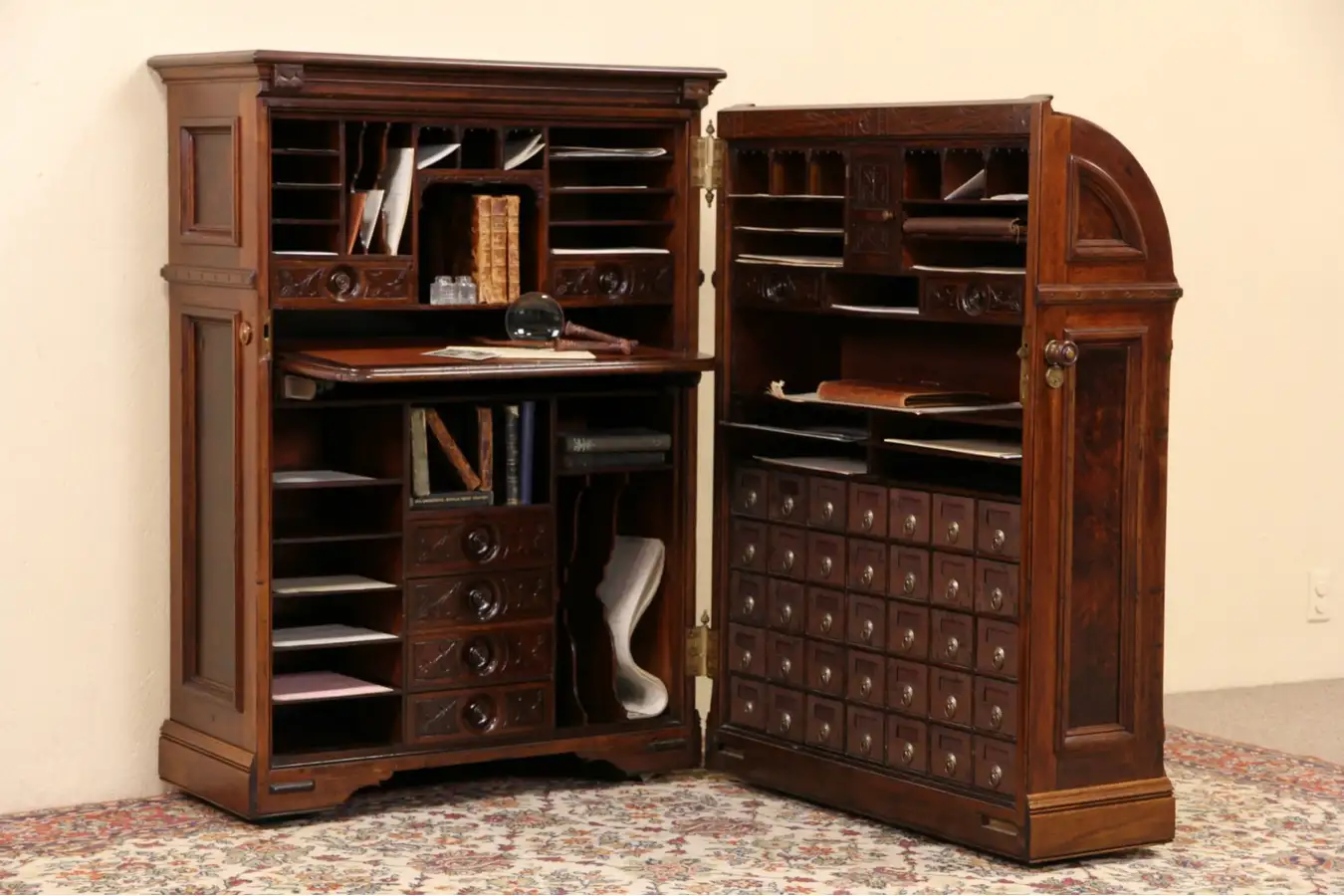 Tiny drawers inside have hand cut dovetail joints on this American made antique desk. There is no key, but the large knob latches the desk closed. A pull out writing surface is inlaid with leather, the desk rolls on large wheels. In the door are 35 leatherette and pasteboard file boxes with original ring pulls and label holders. A cast bronze mail slot is original.
