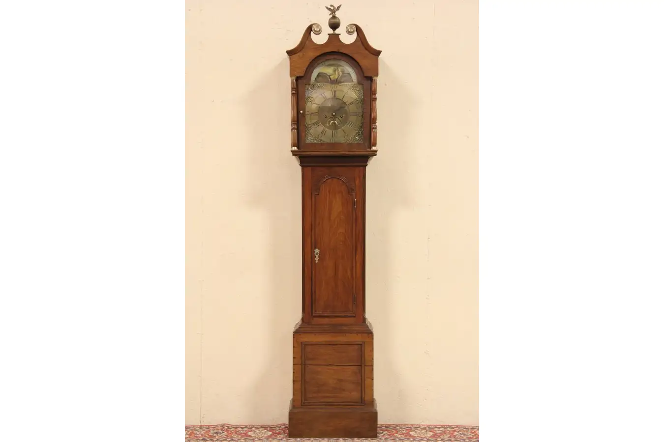 The original hand painted lunar dial depicts lunar "faces," a sailing ship and ruins around Nottingham. Richly embossed corner mounts have faces. The solid brass dial is richly hand engraved and embossed.