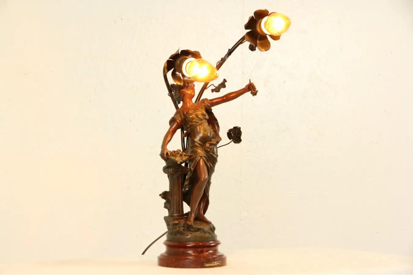 Signed "L. & F. Moreau," this early 1900's sculpture lamp bears an engraved brass plate, "Nymph with Roses."