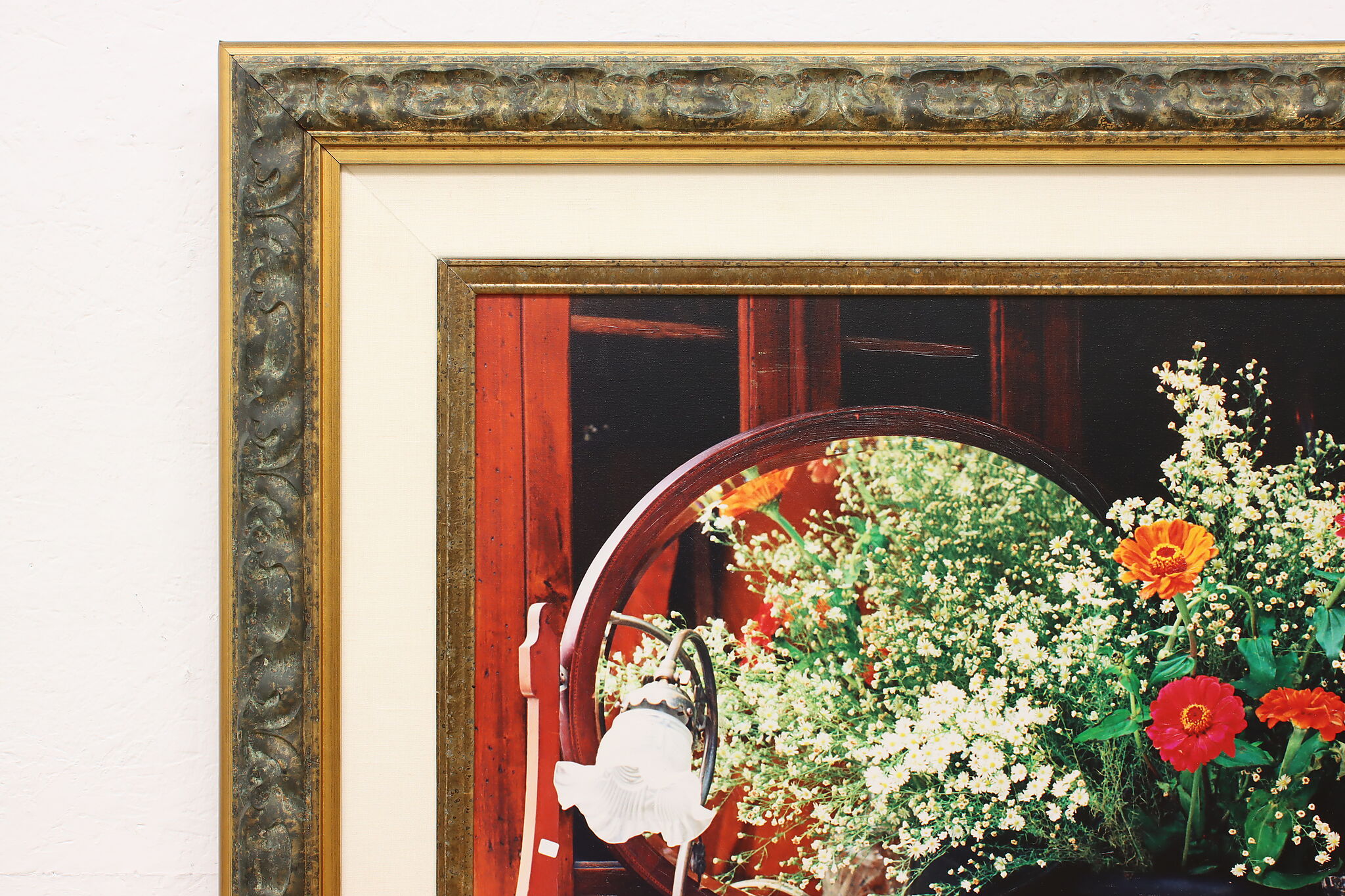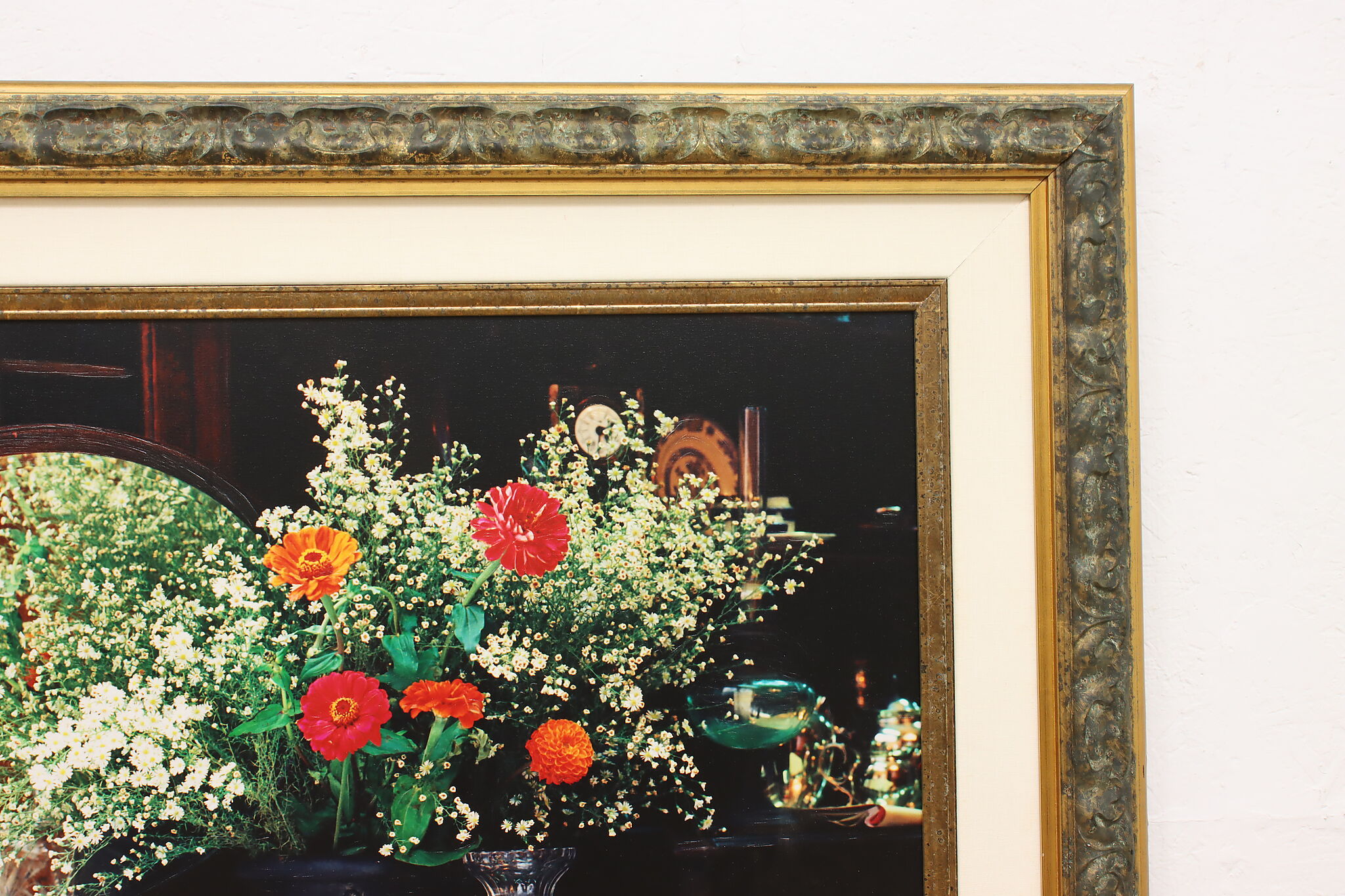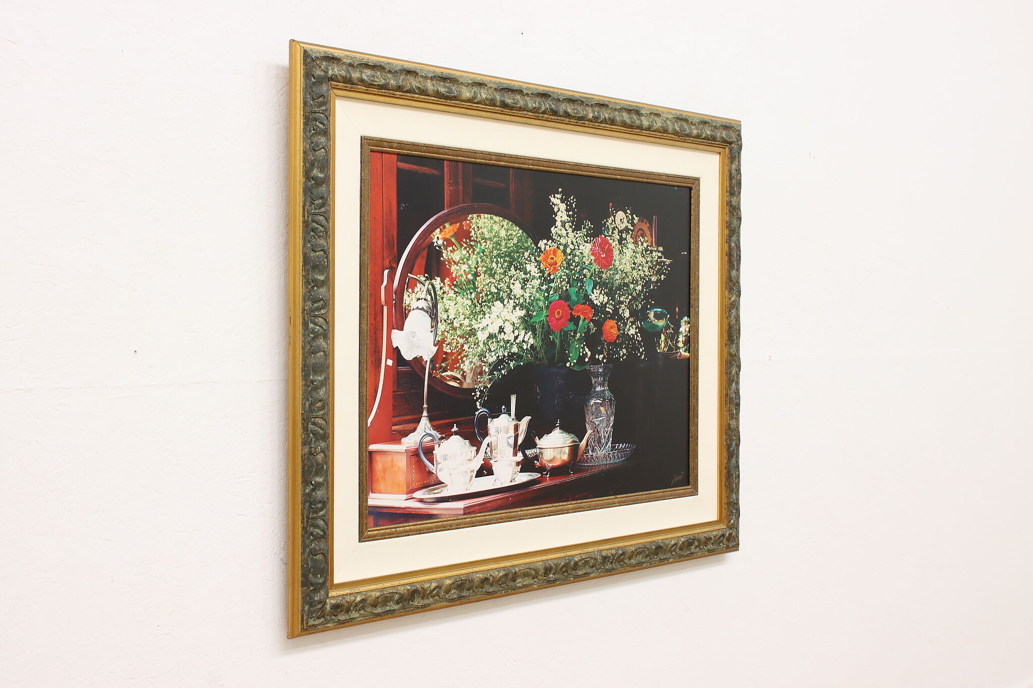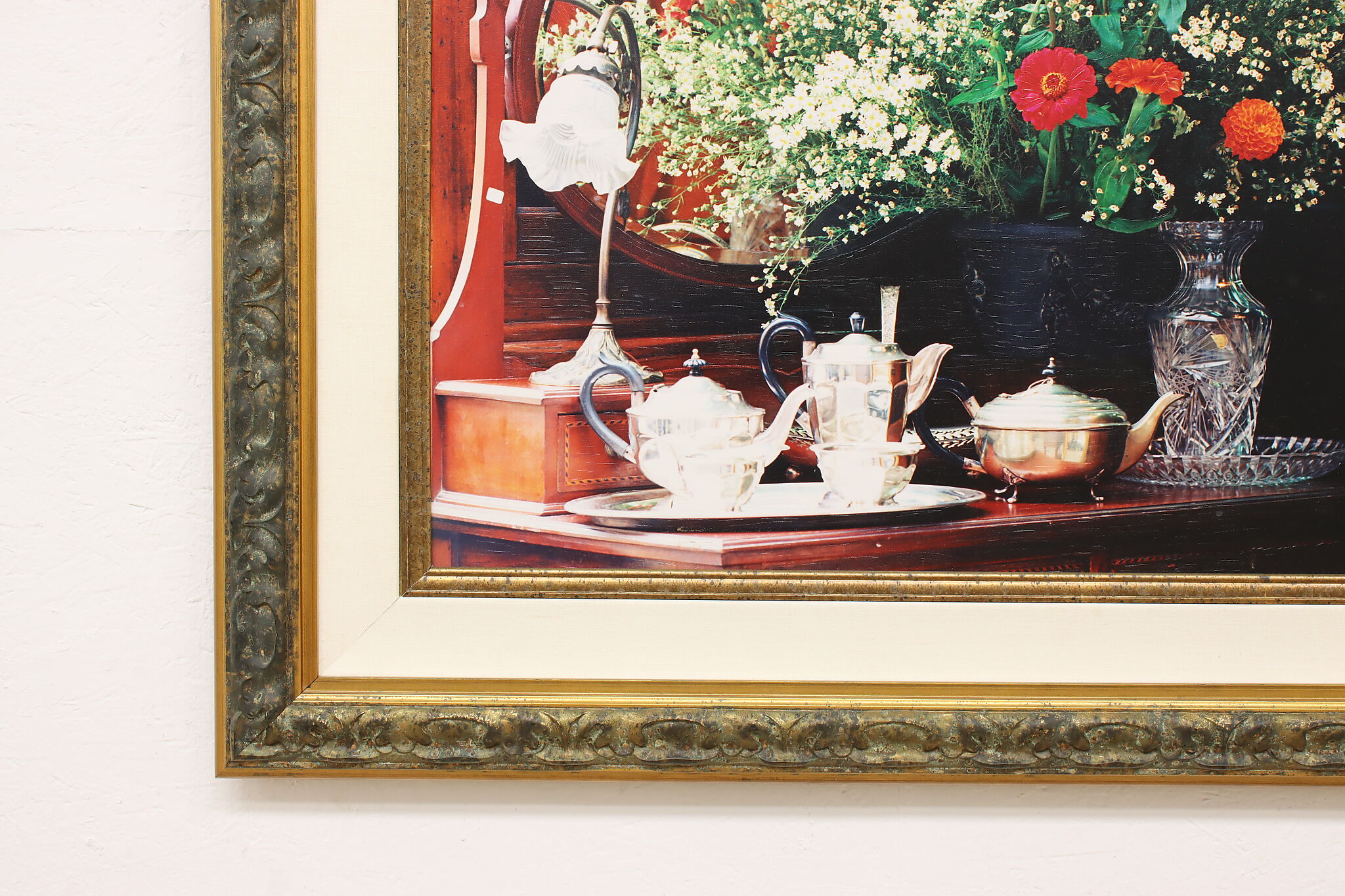 A morning tea service with a fresh bouquet of flowers is beautifully captured in this still life giclee print.