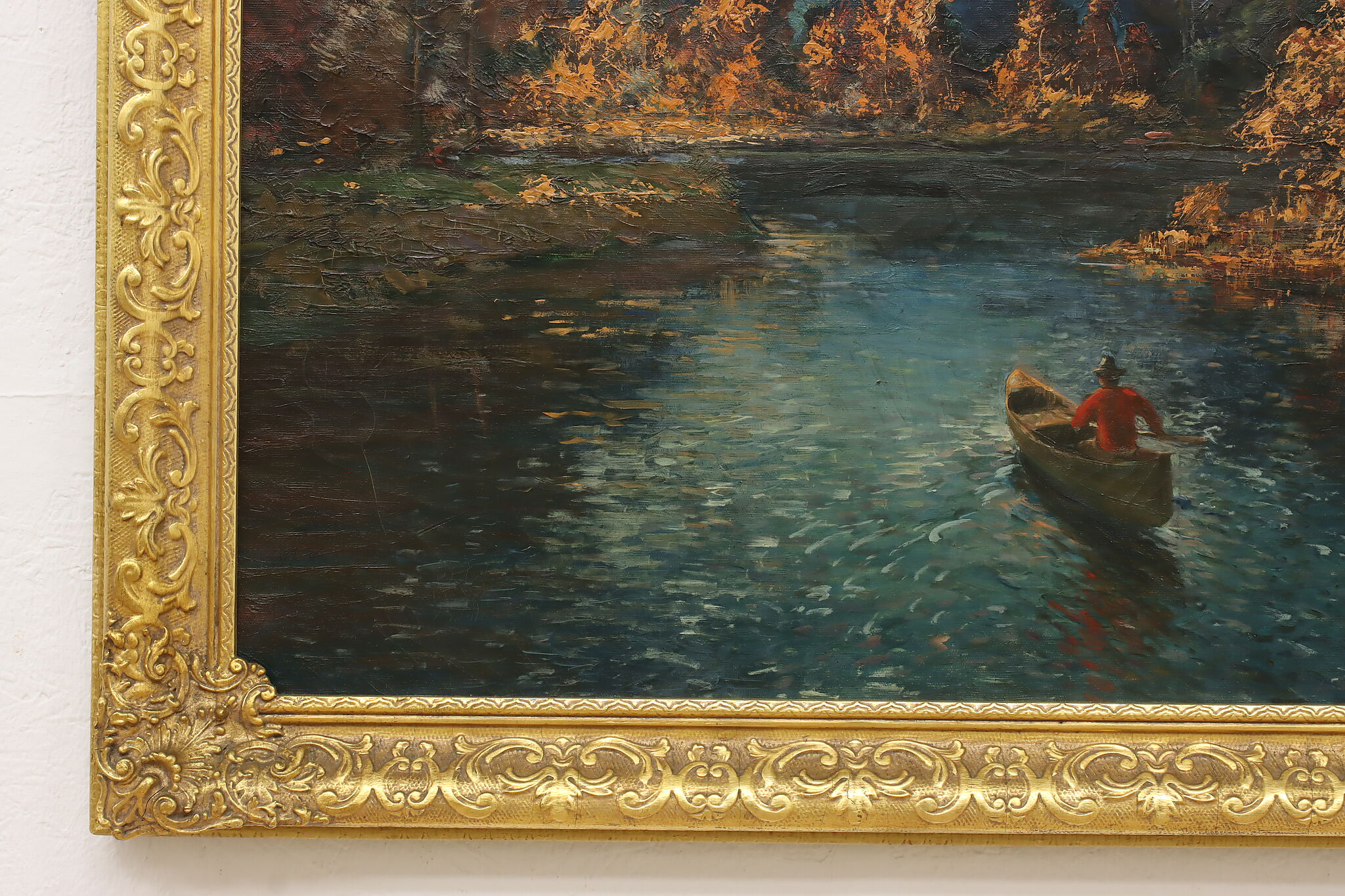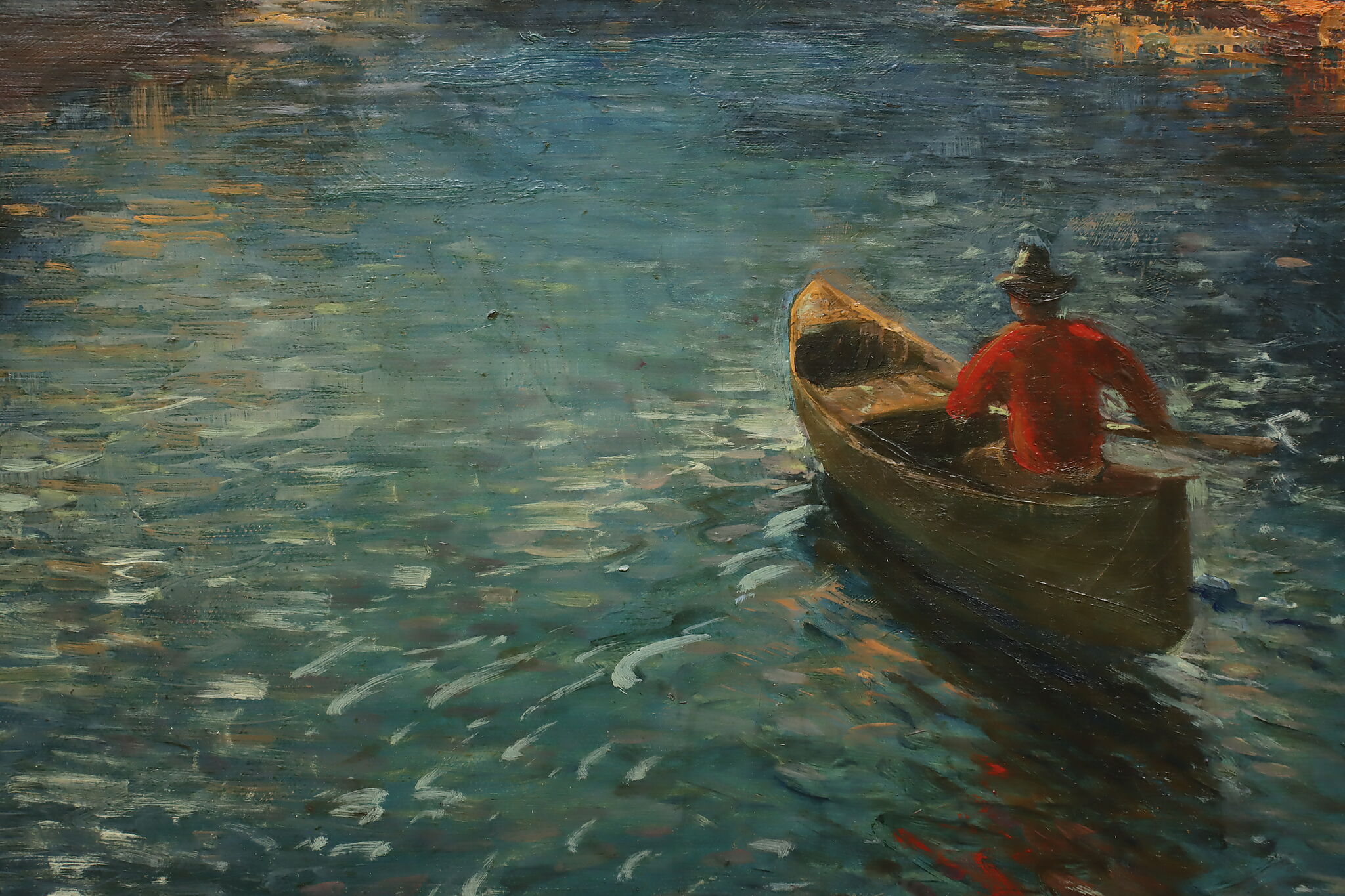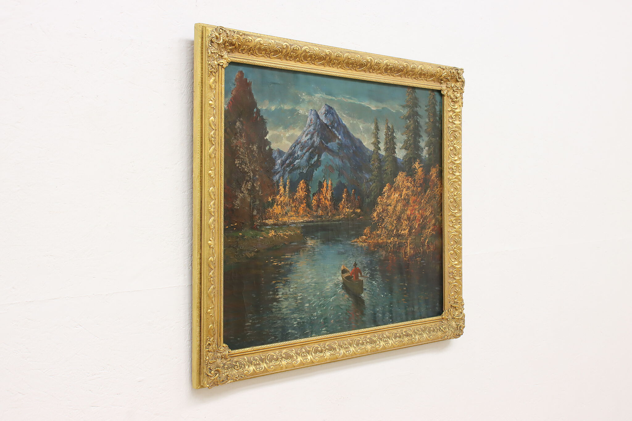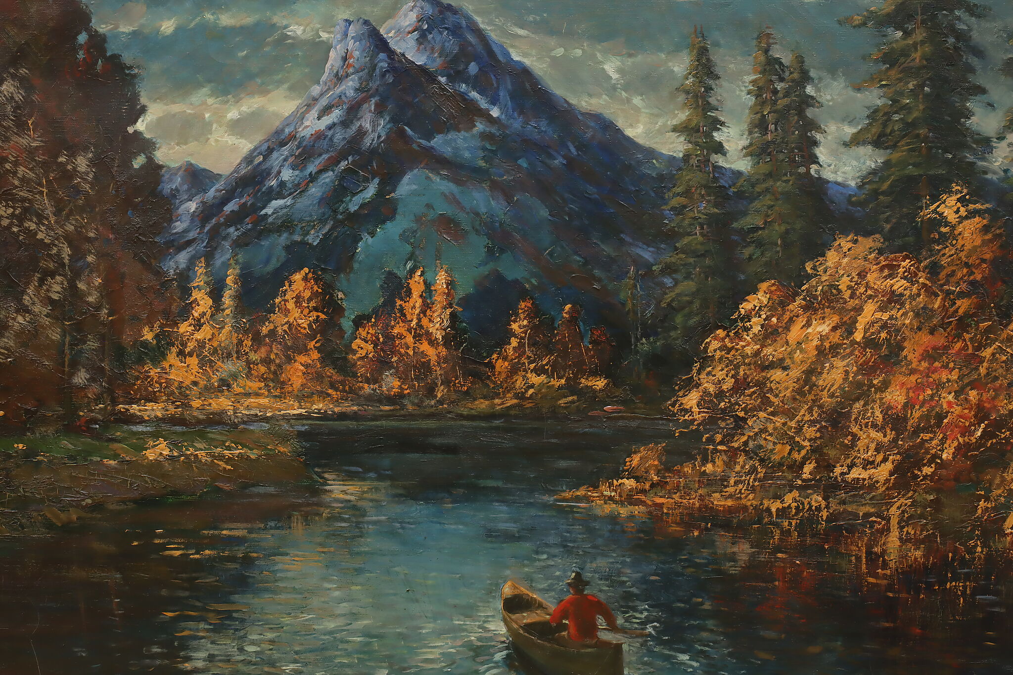 This gorgeous painting is of a river in North American west, with a canoer paddling towards the towering mountains.