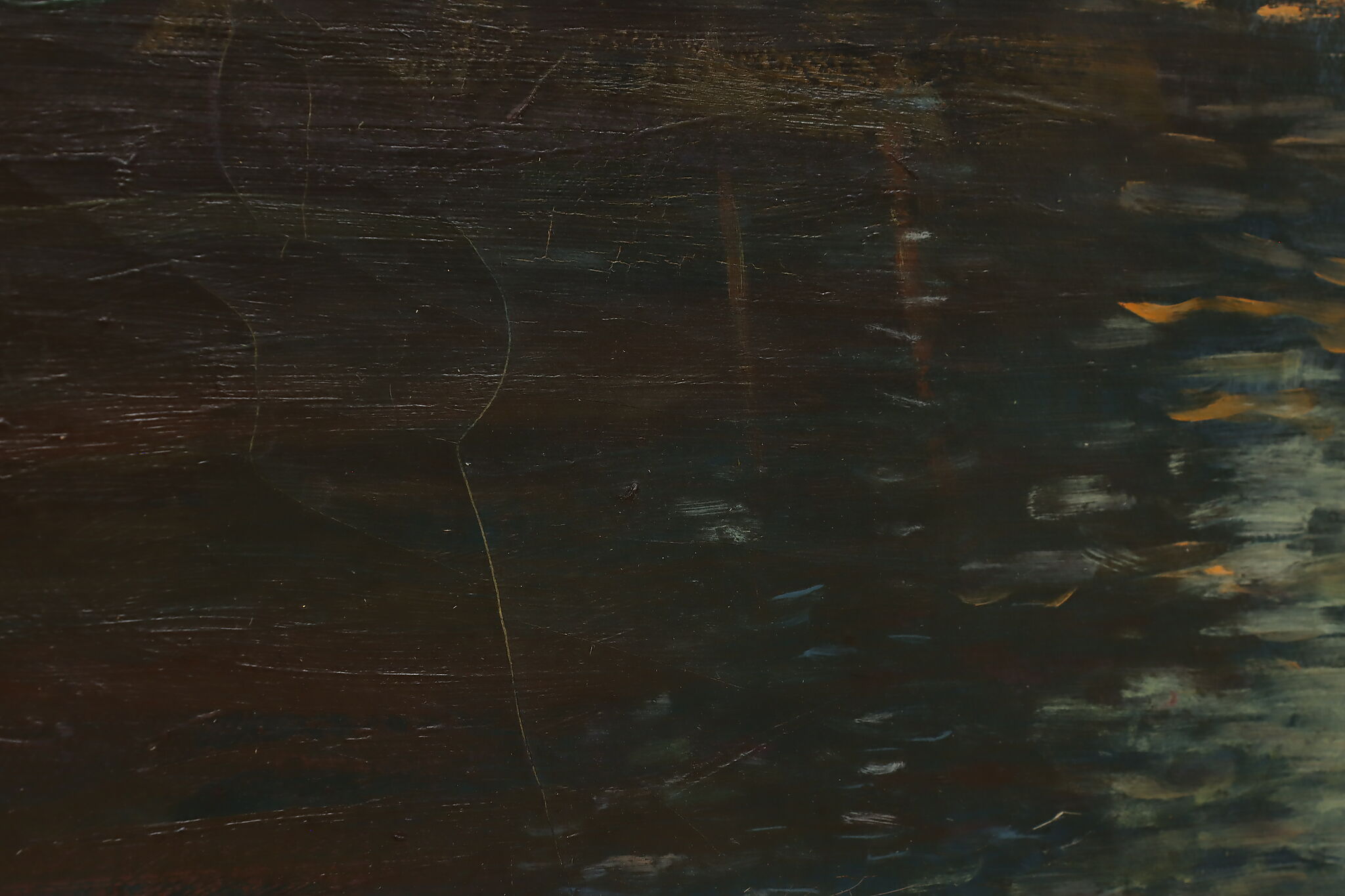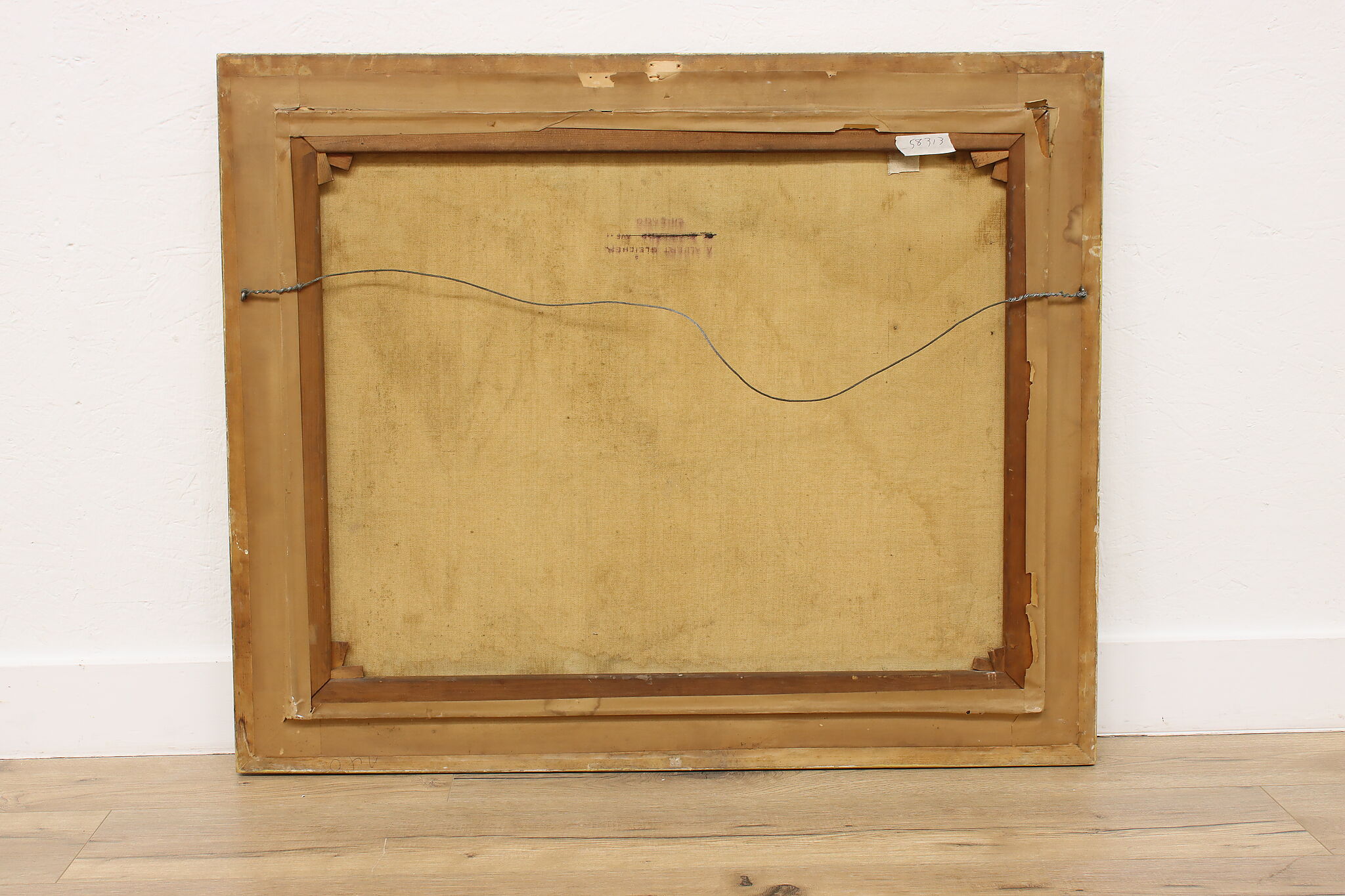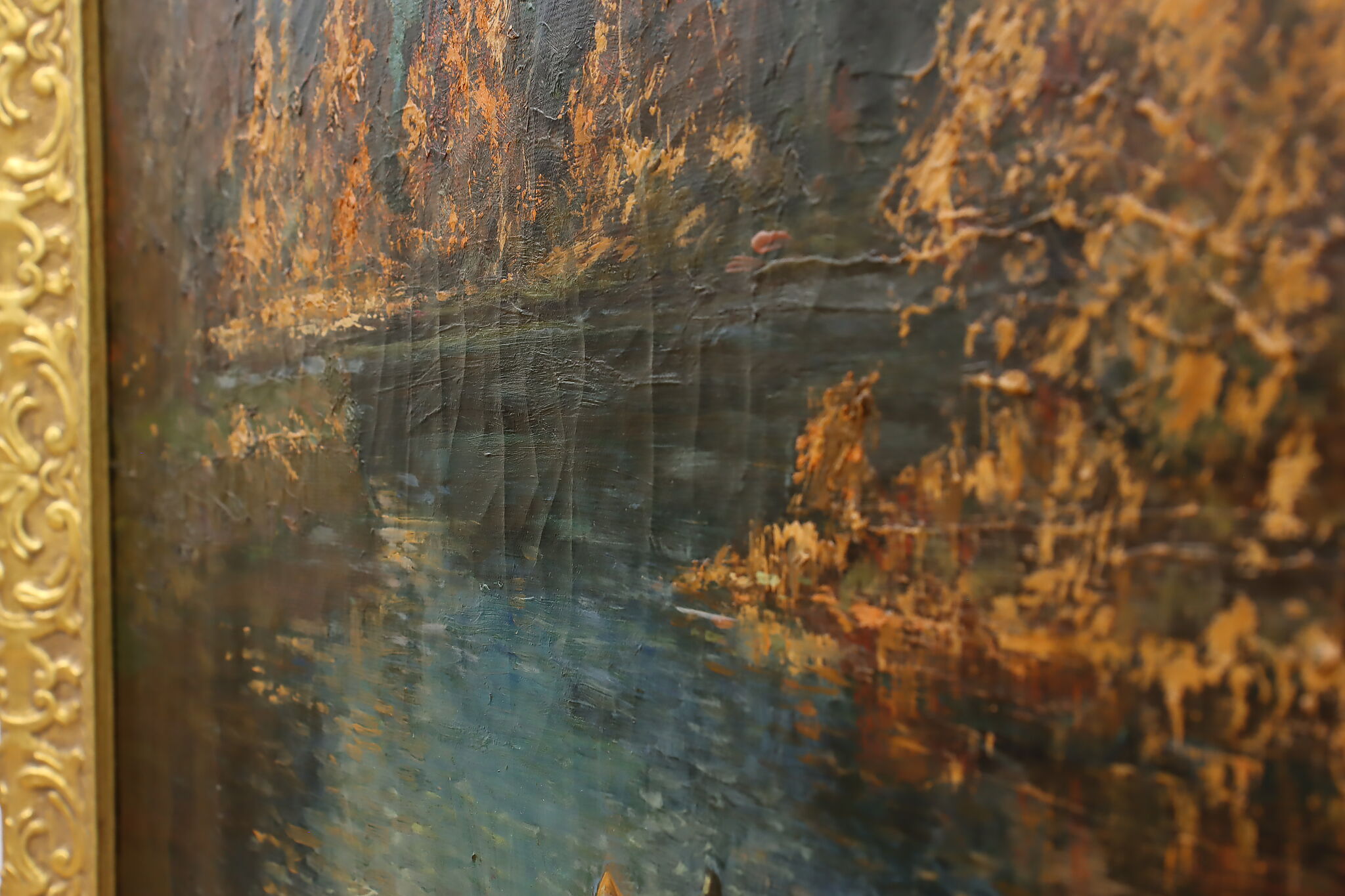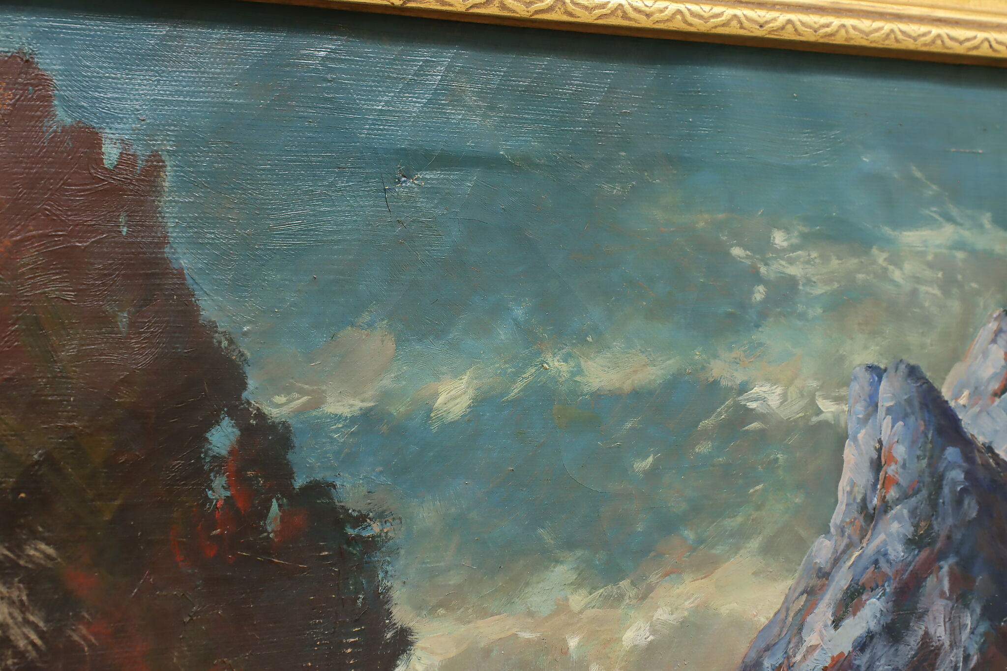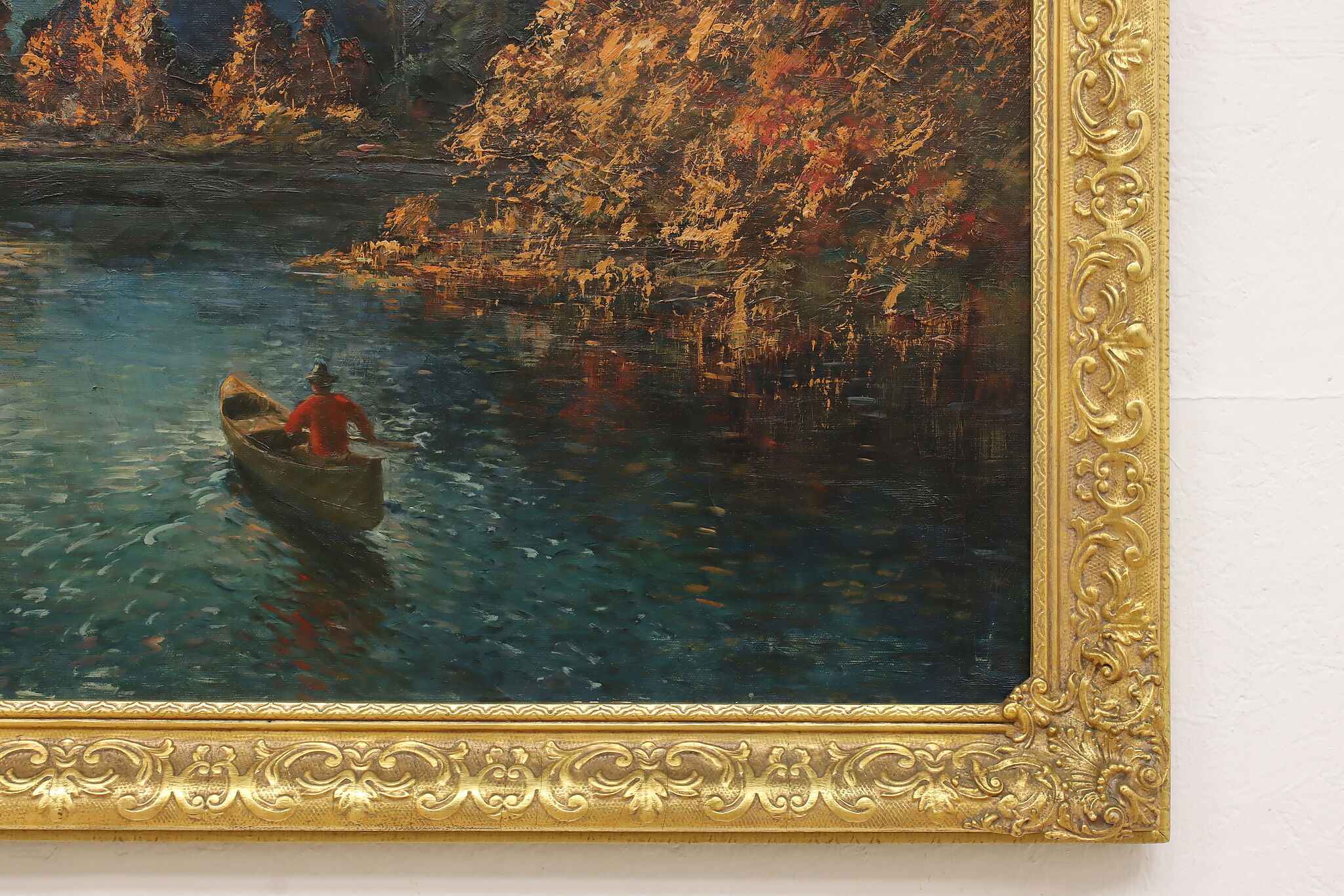 This gorgeous painting is of a river in North American west, with a canoer paddling towards the towering mountains.