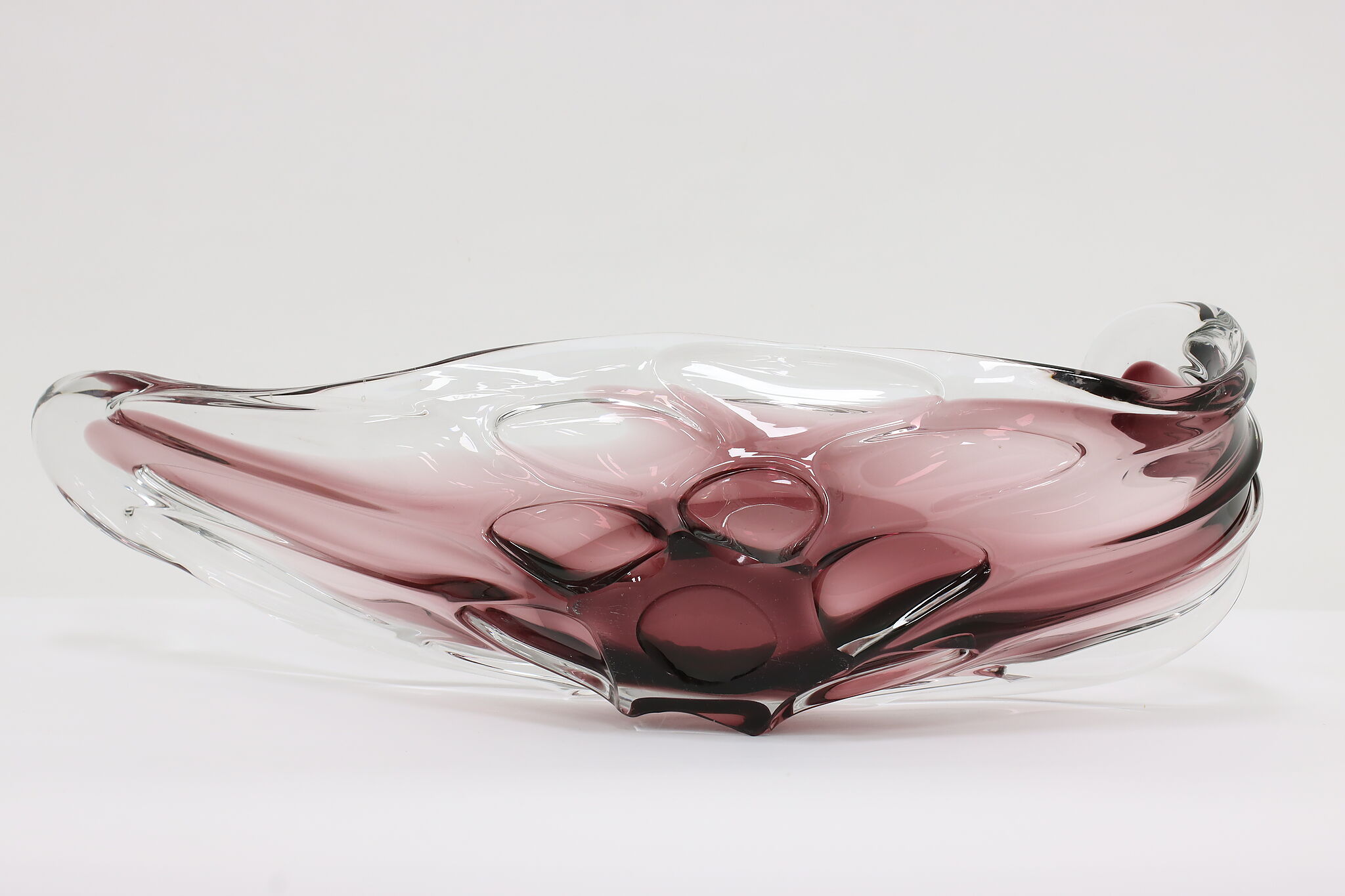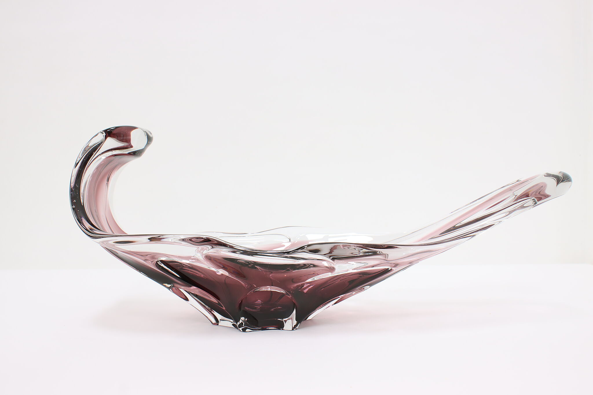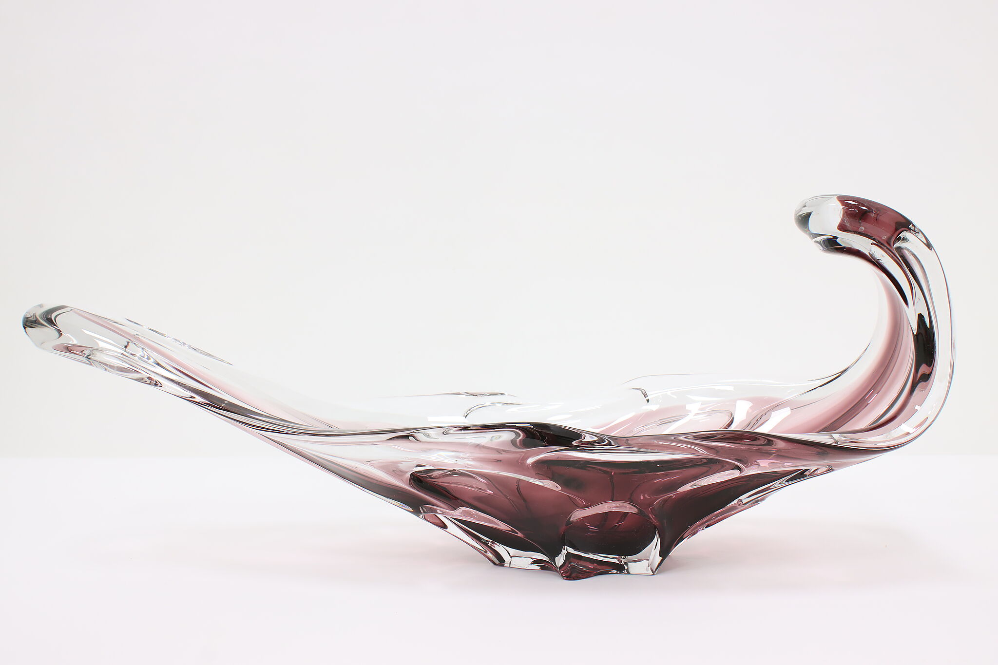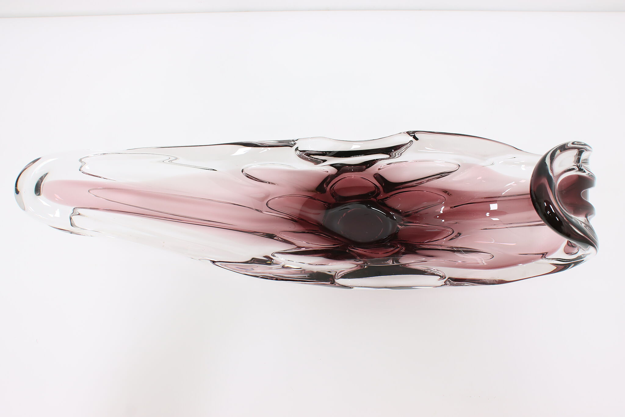 This gorgeous violet art glass sculpture or centerpiece bowl was handcrafted on the island of Murano in Venice, Italy.