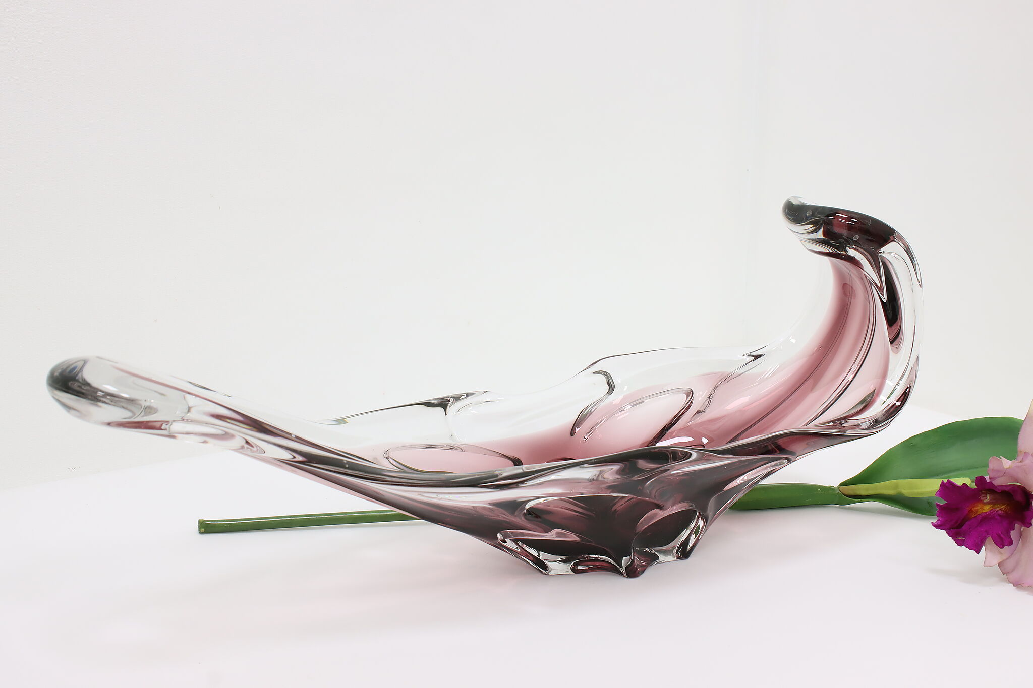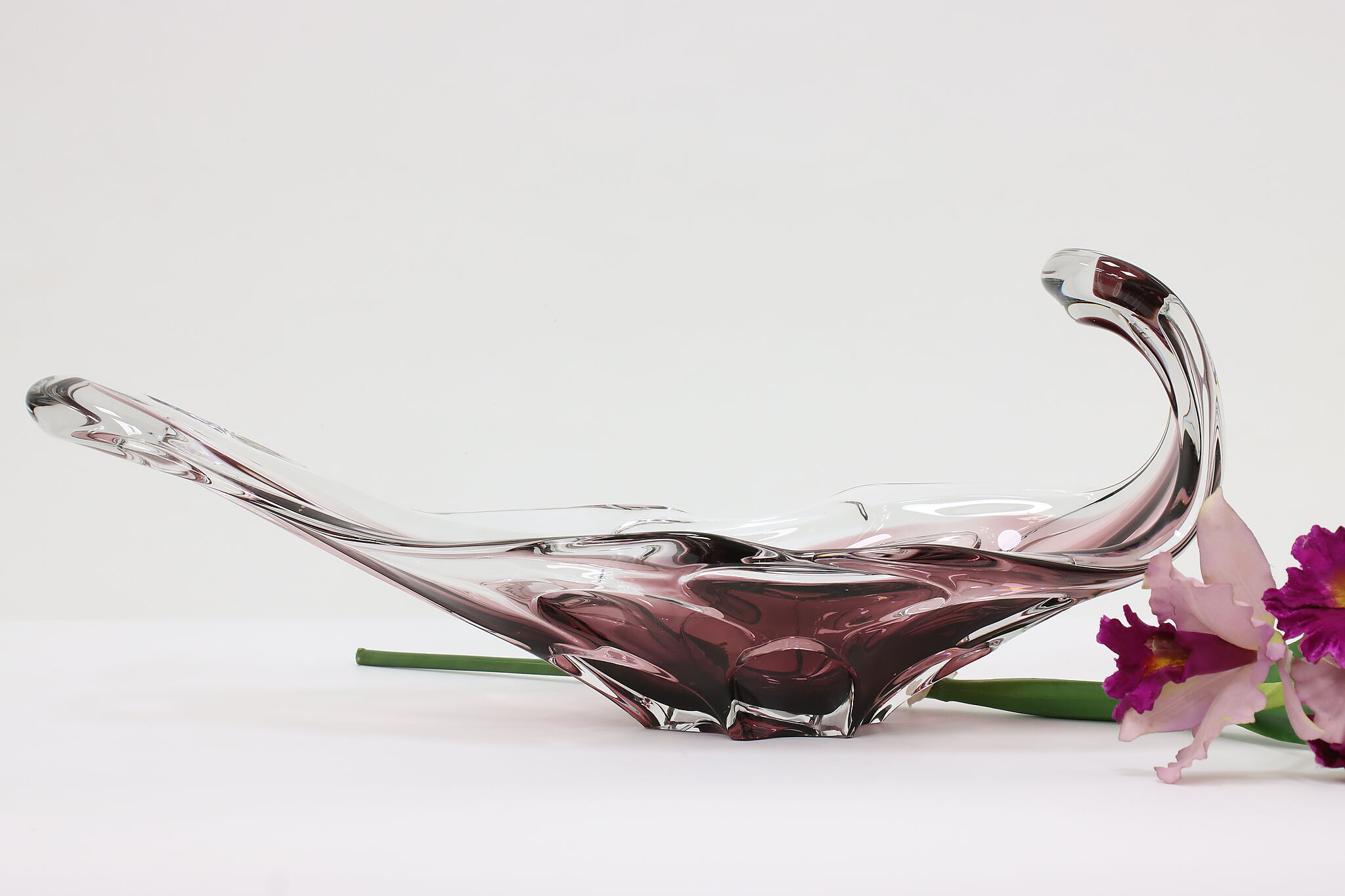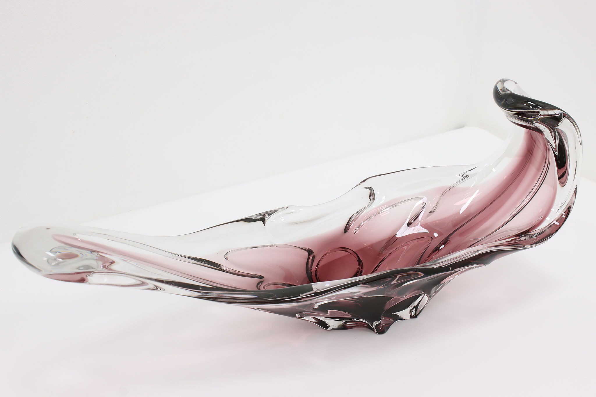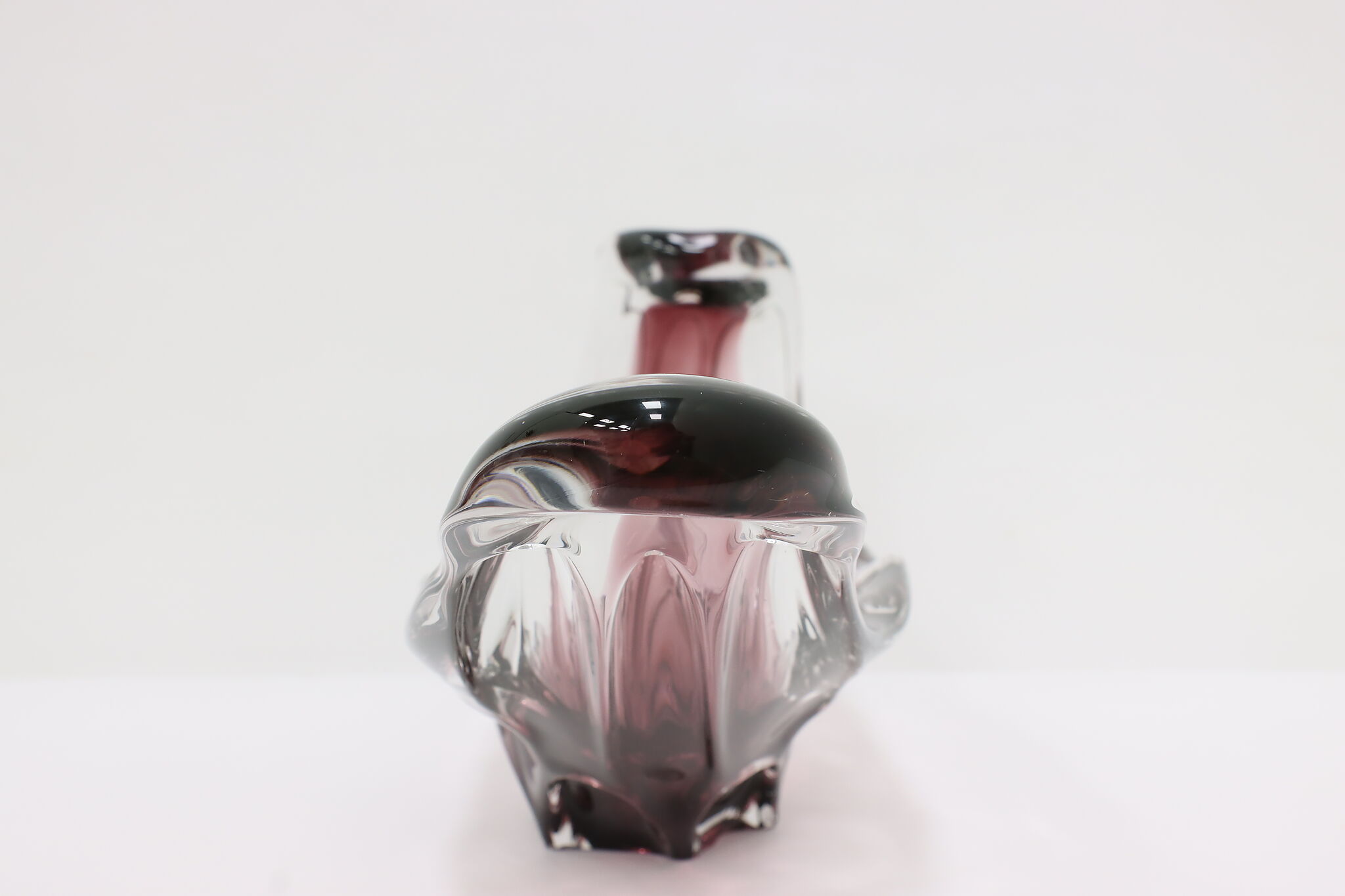This gorgeous violet art glass sculpture or centerpiece bowl was handcrafted on the island of Murano in Venice, Italy.