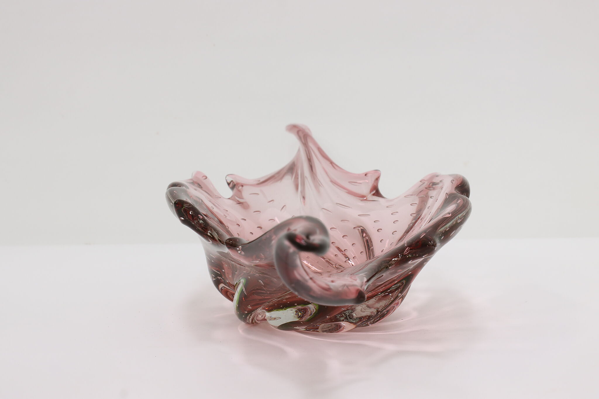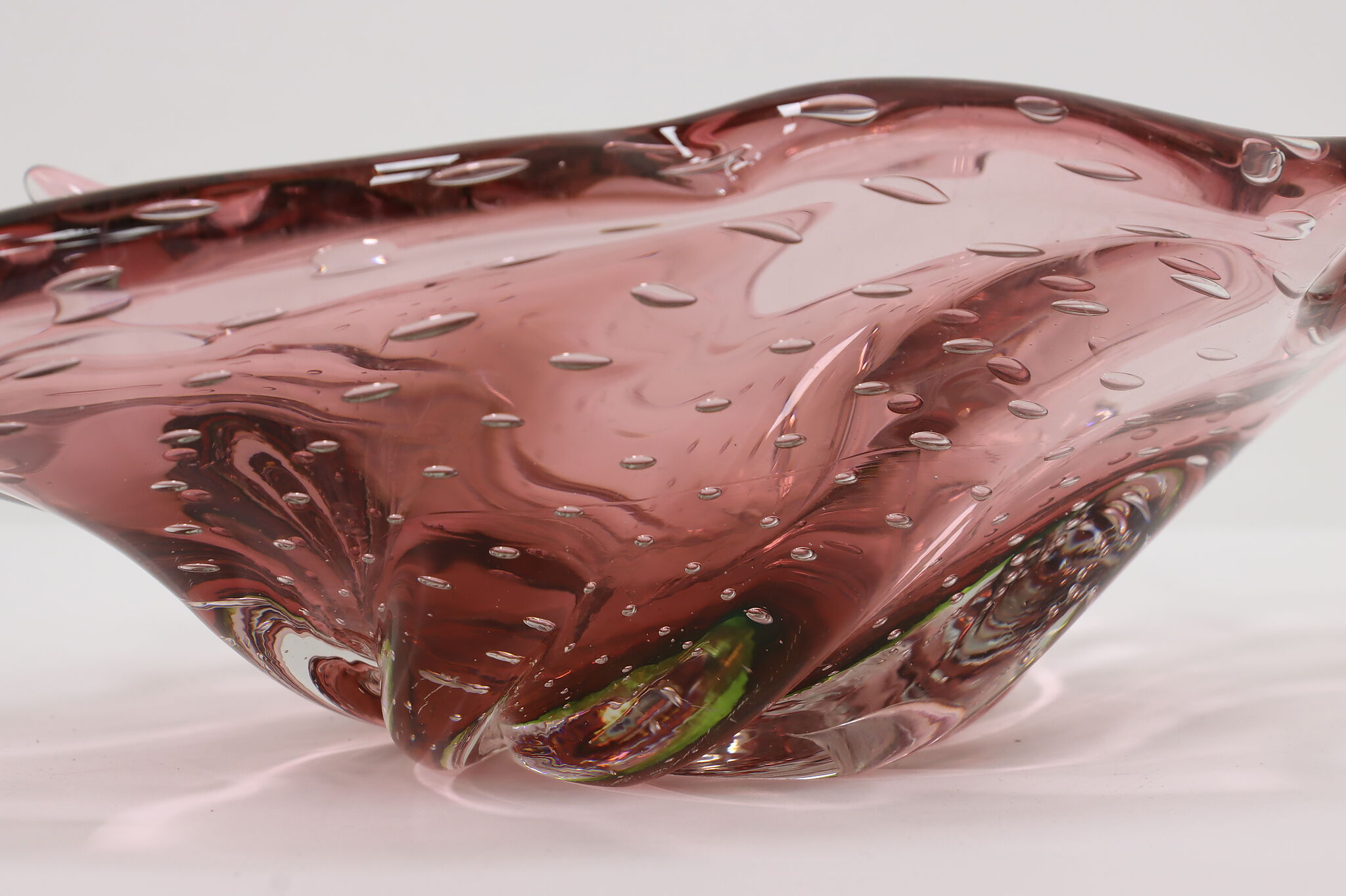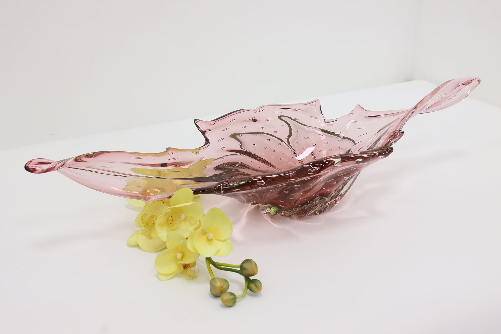 A gorgeous sculpture or centerpiece bowl is designed after a strawberry! The clear bubbles represent seeds and the green glass accents around base are for the leaves.