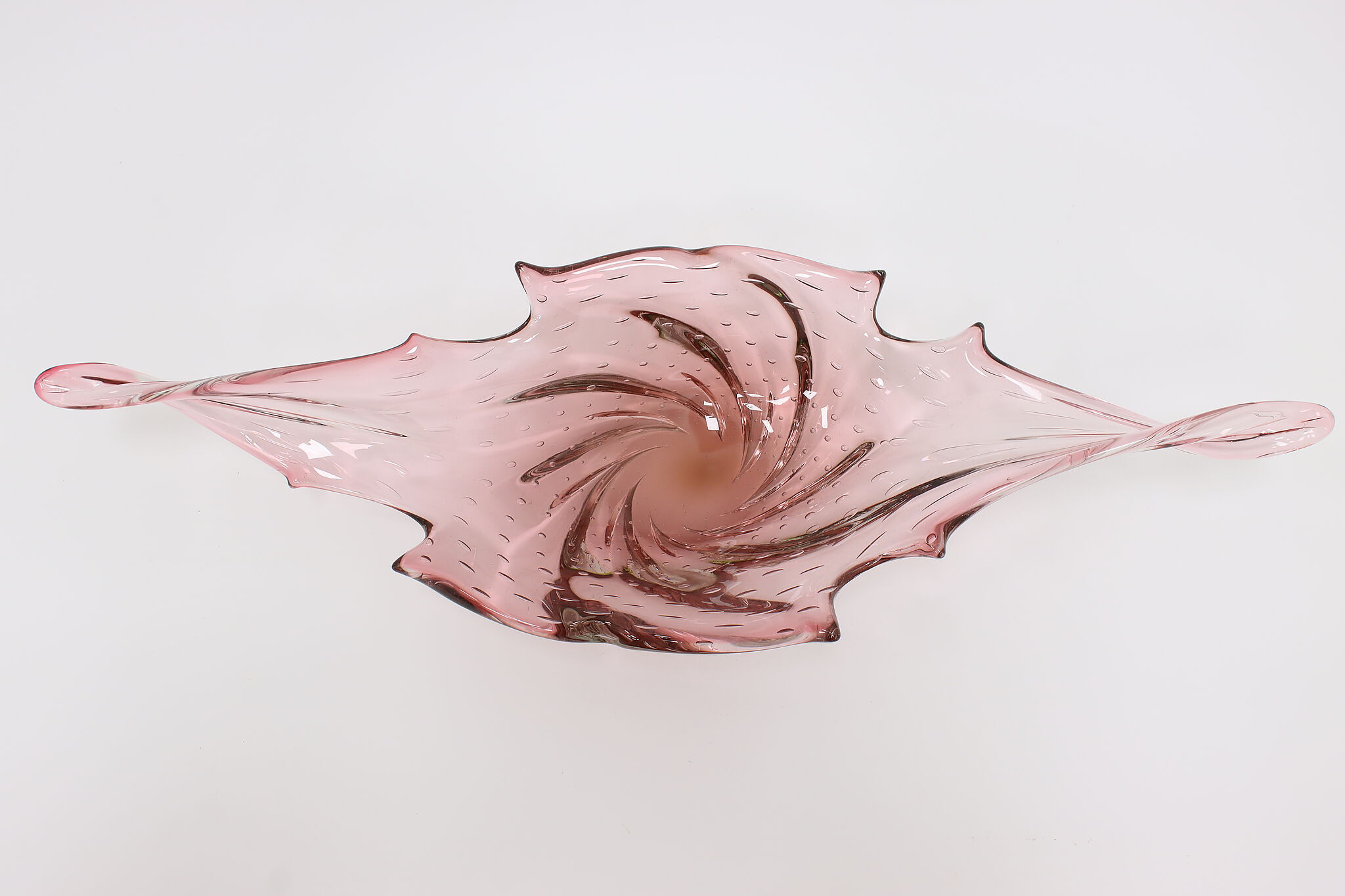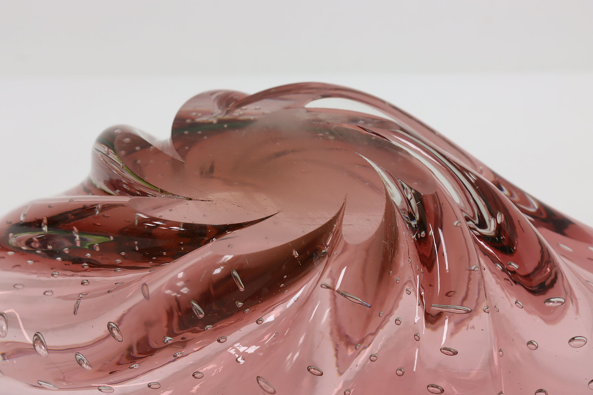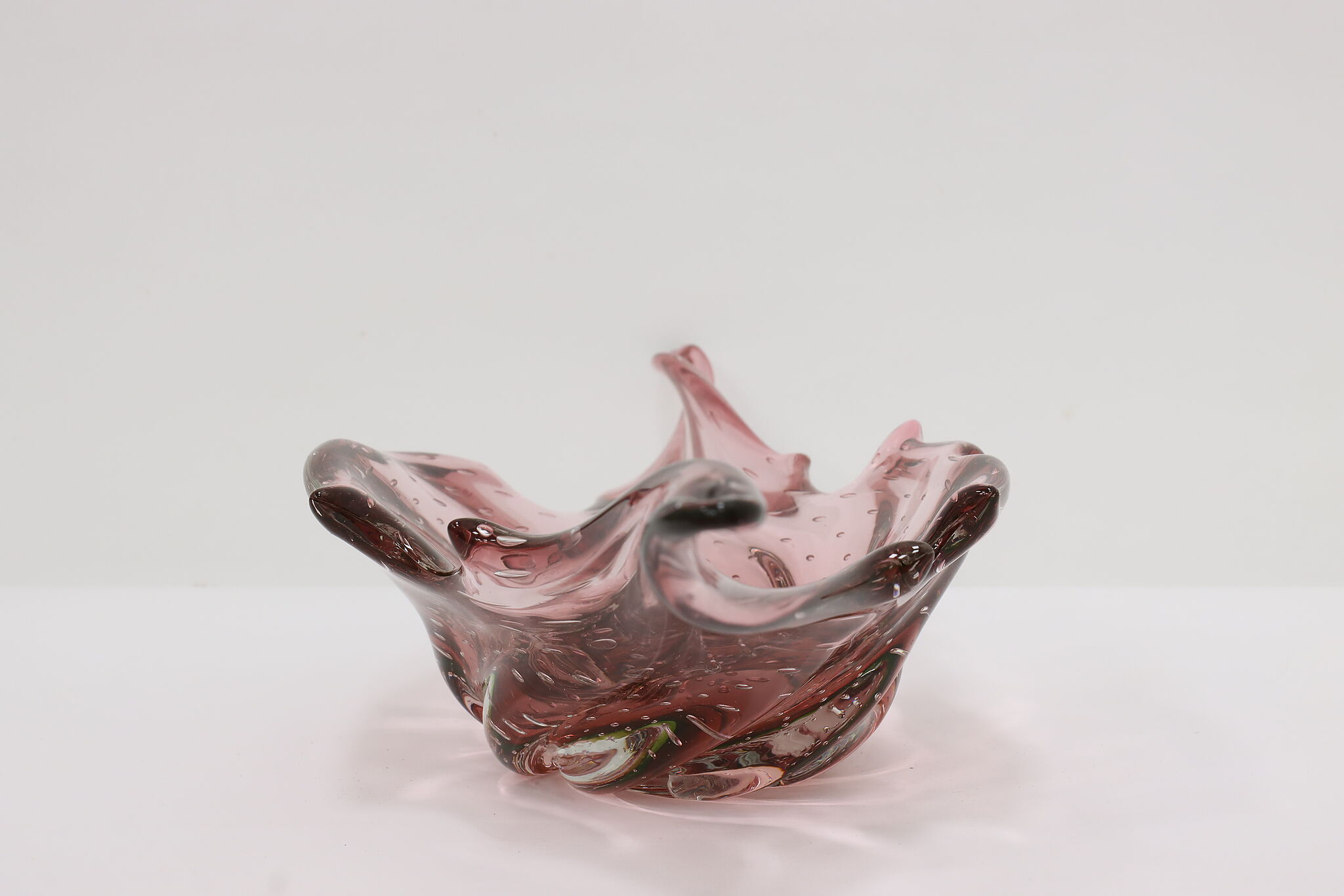 A gorgeous sculpture or centerpiece bowl is designed after a strawberry! The clear bubbles represent seeds and the green glass accents around base are for the leaves.