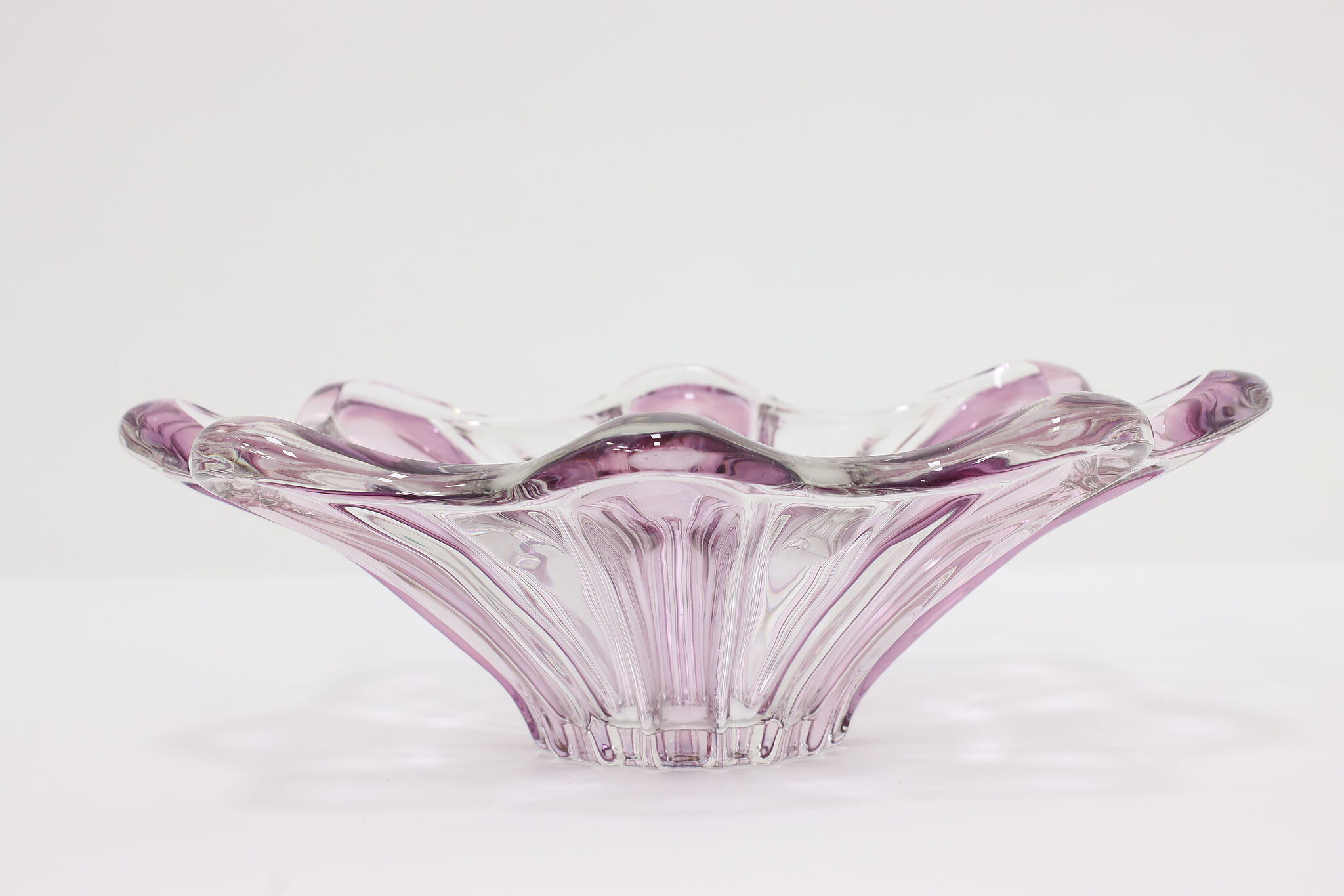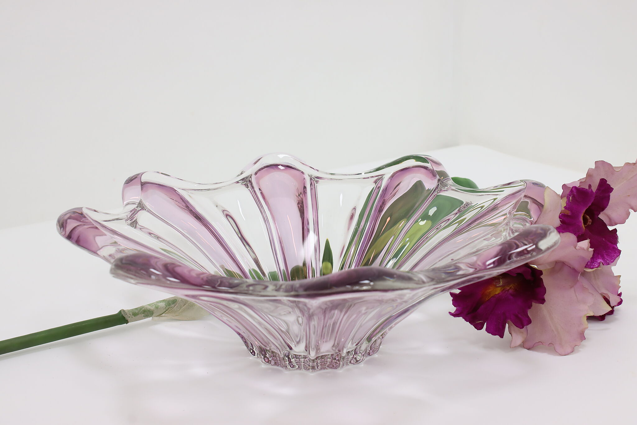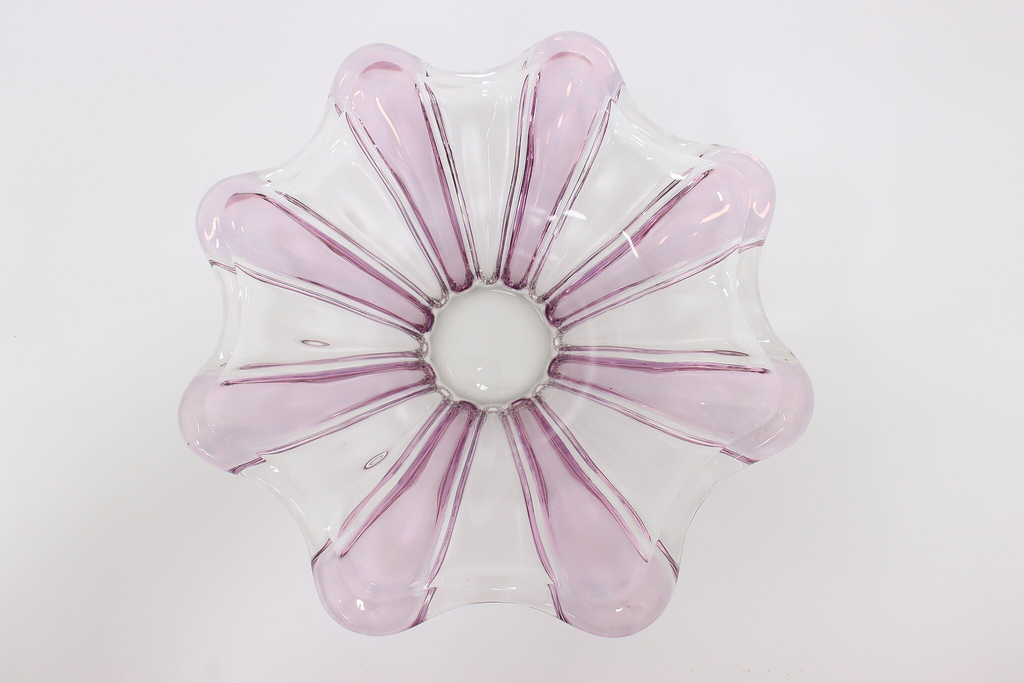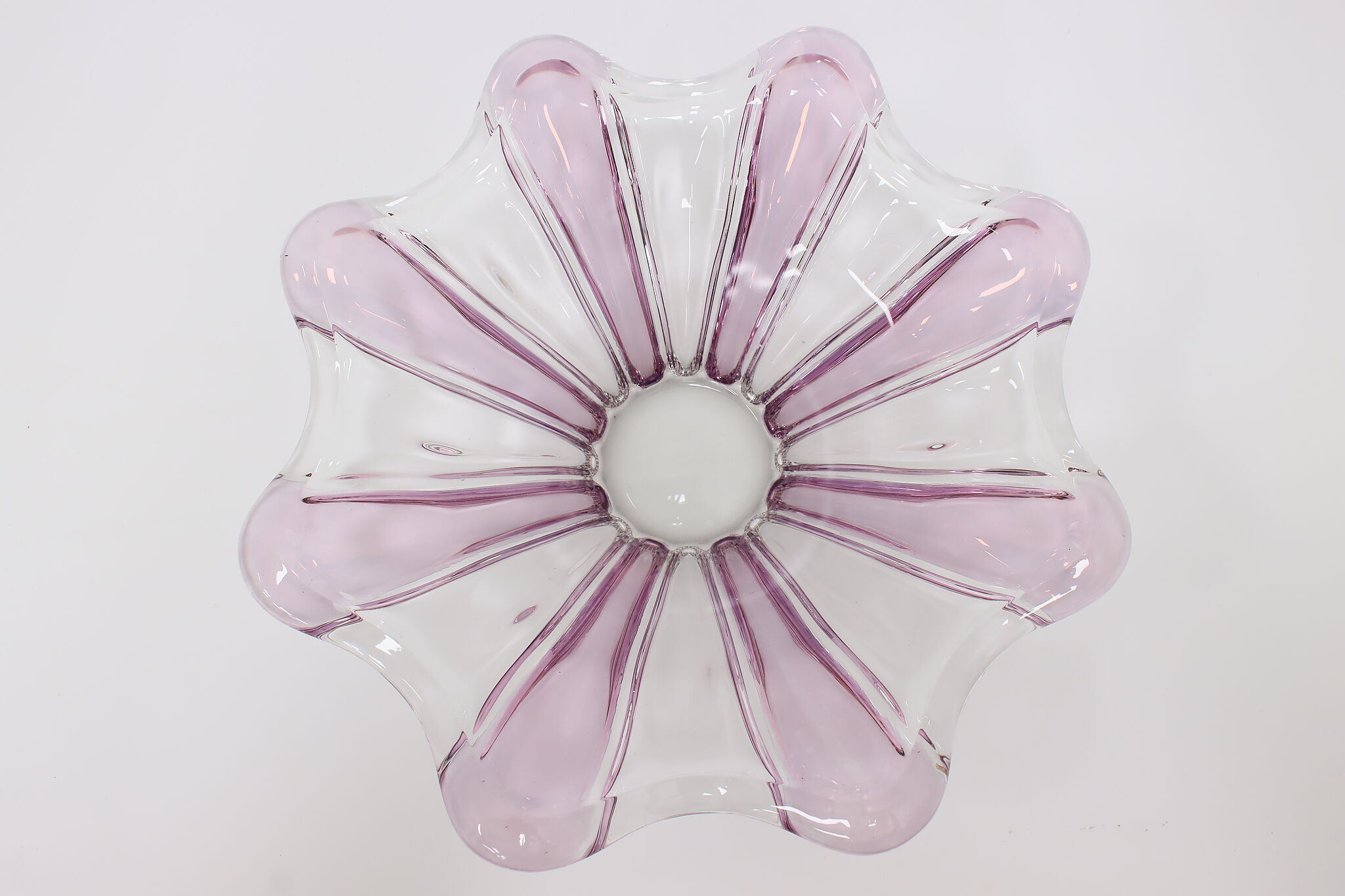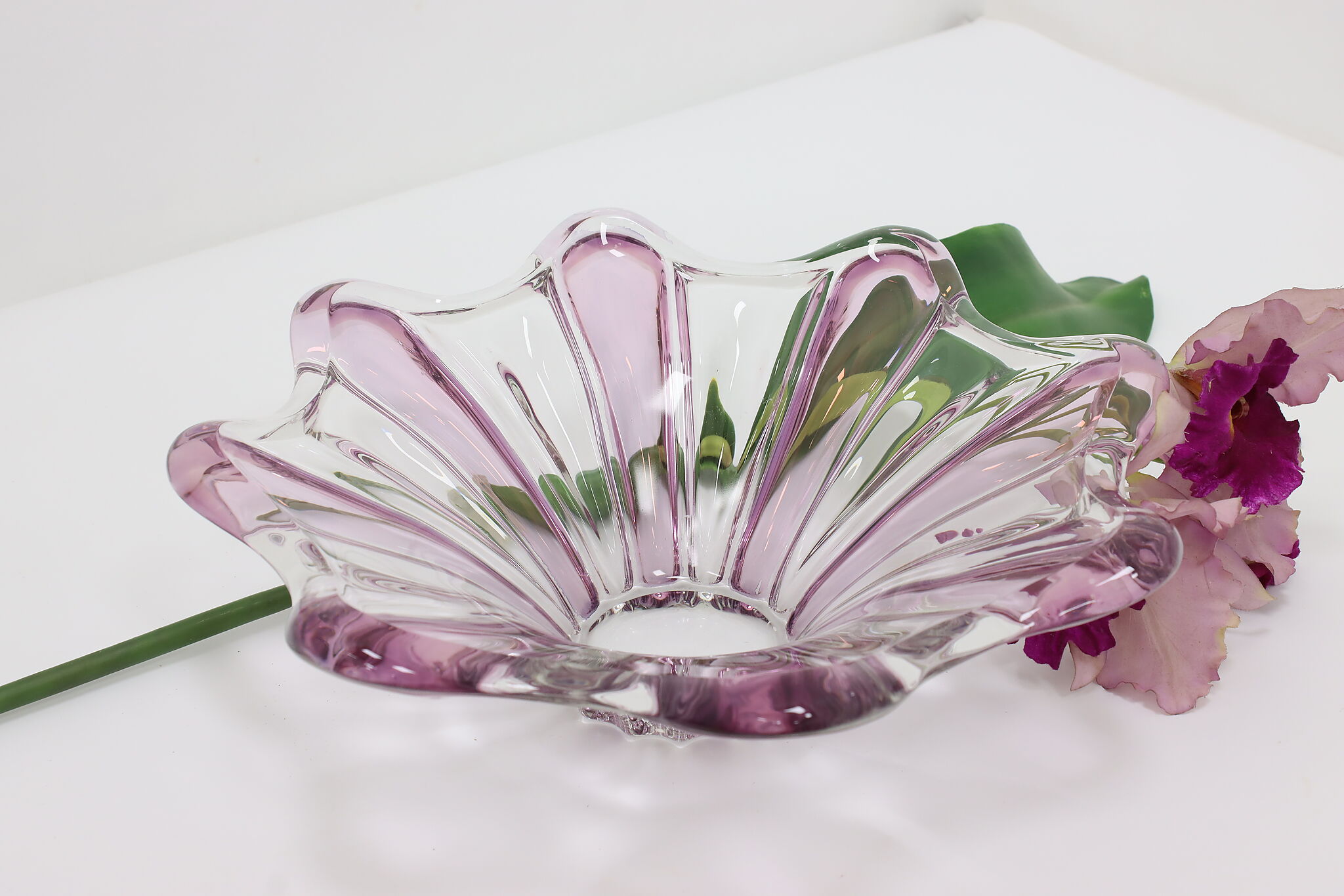 This gorgeous art glass sculptural bowl is shaped like a flower with amethyst shaded to clear glass petals.