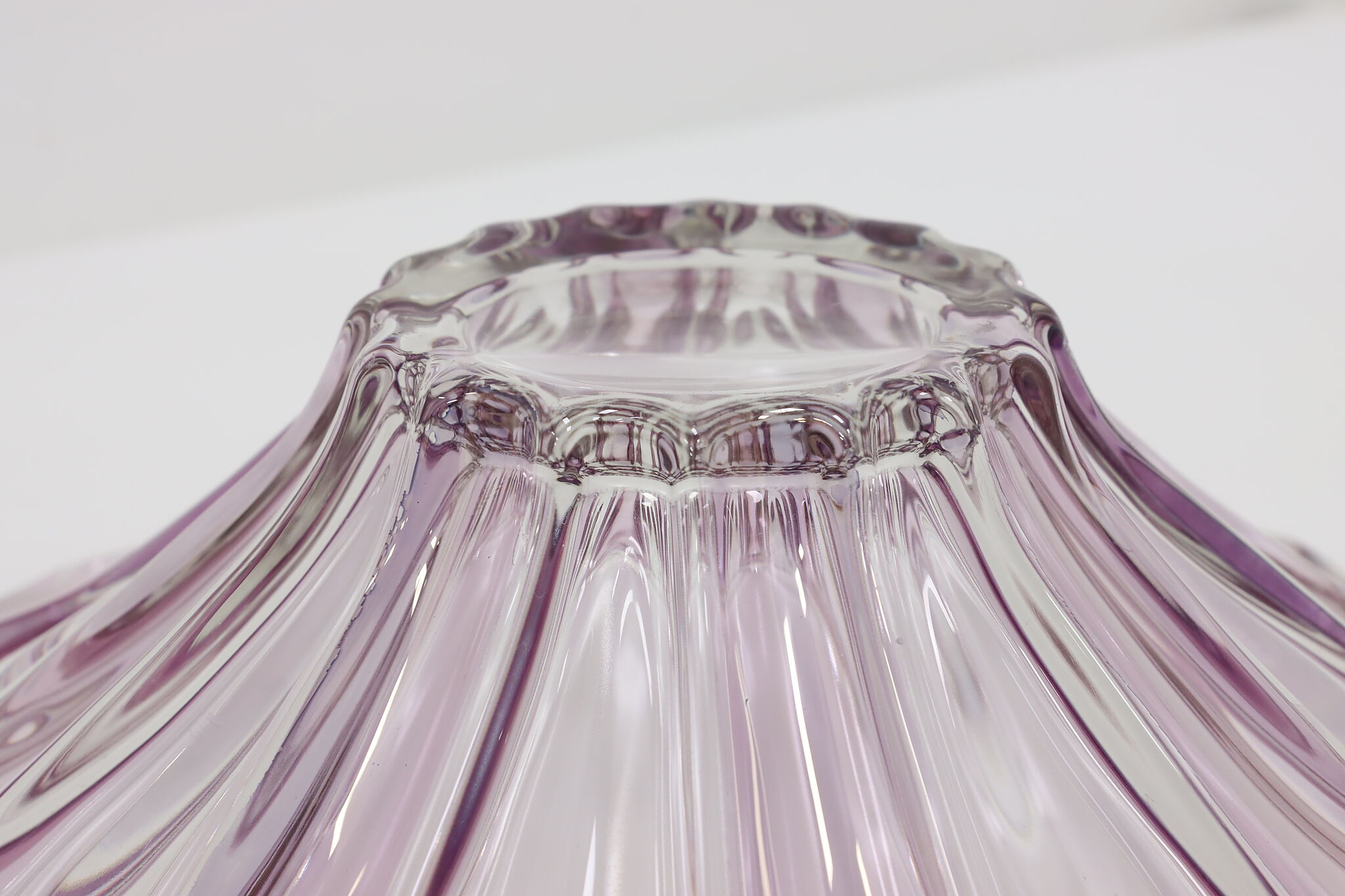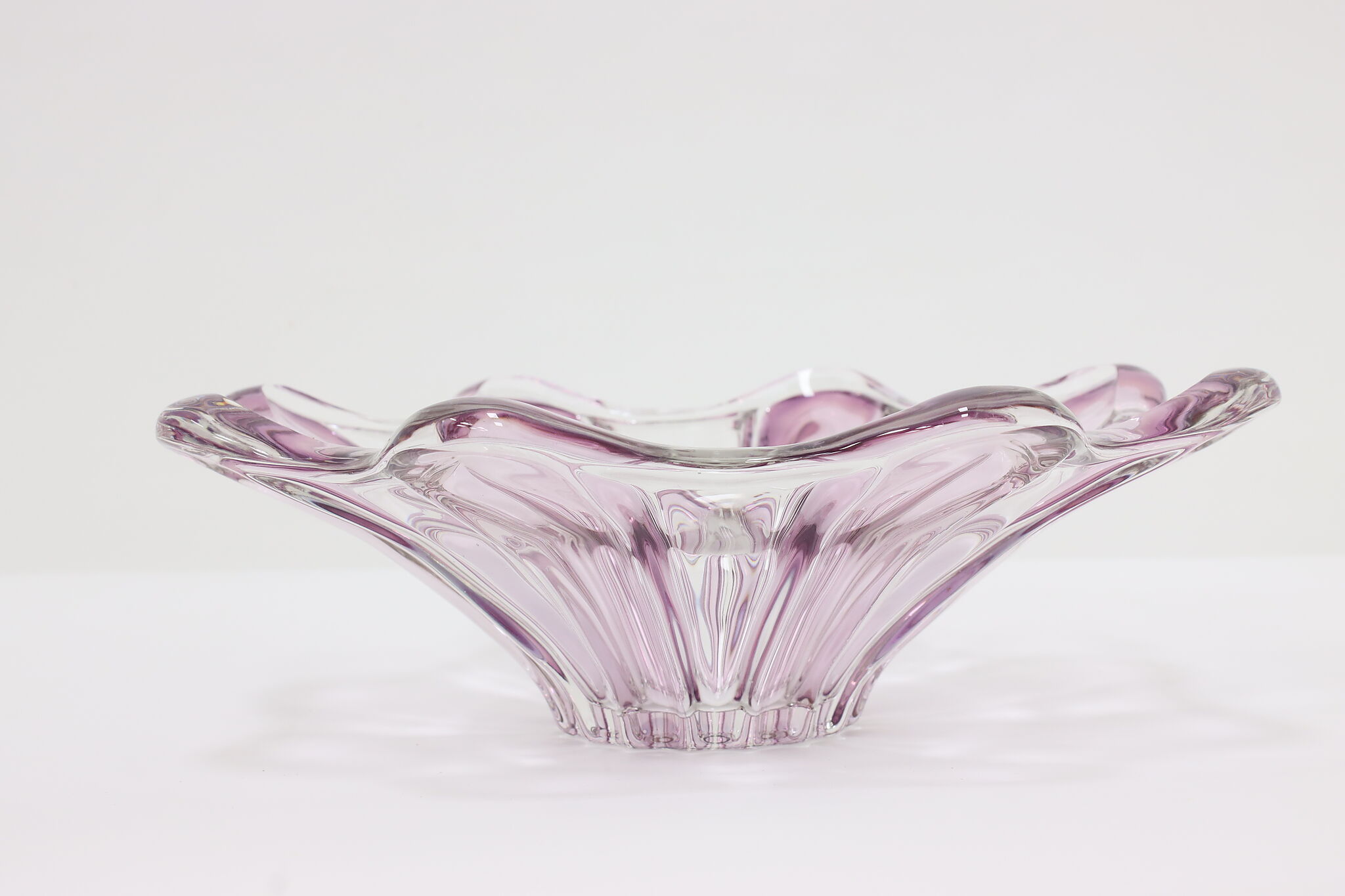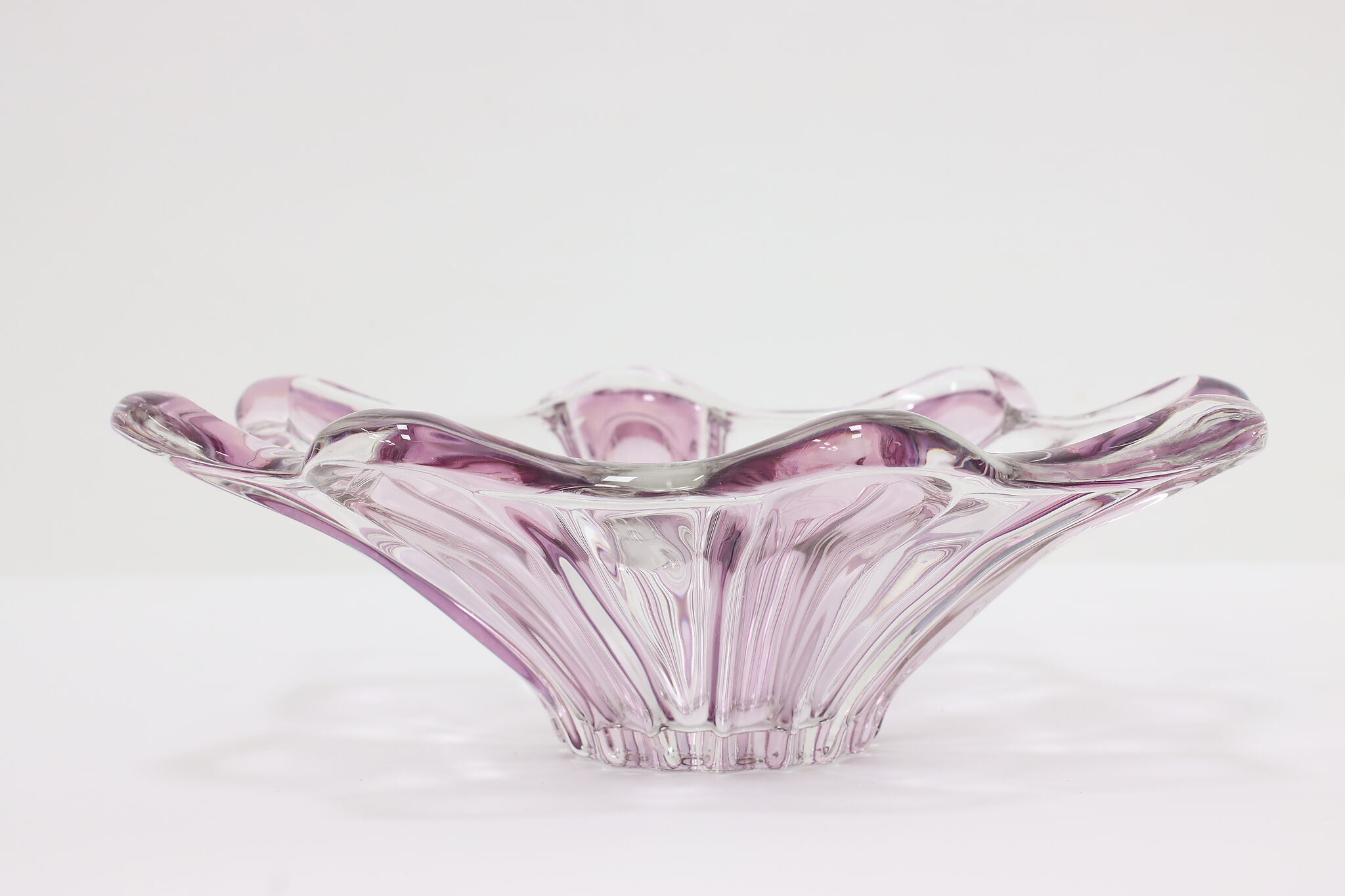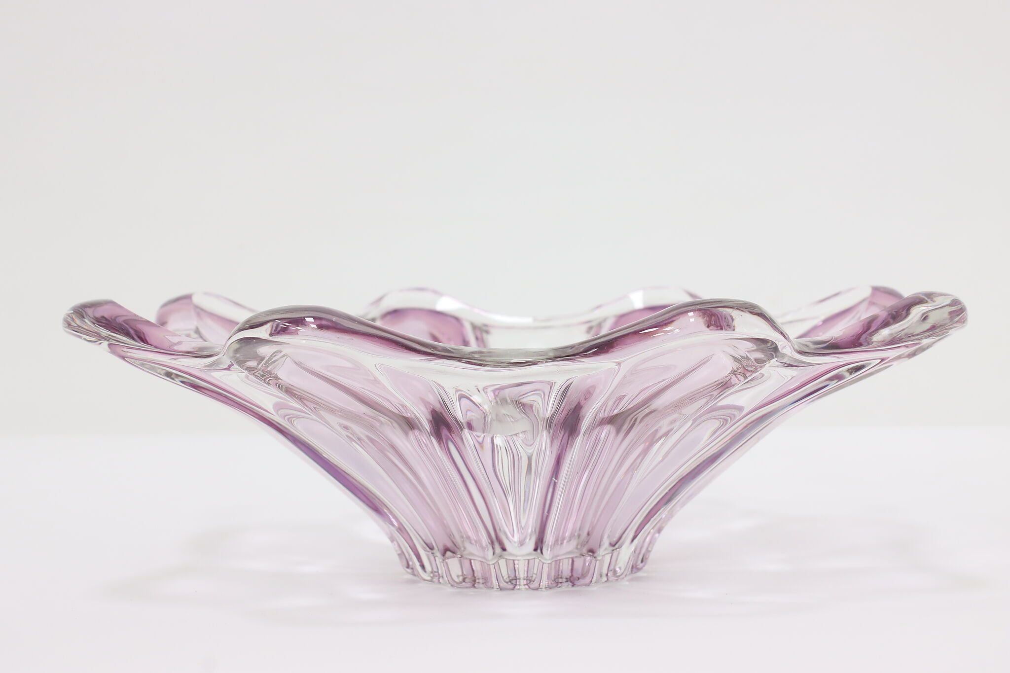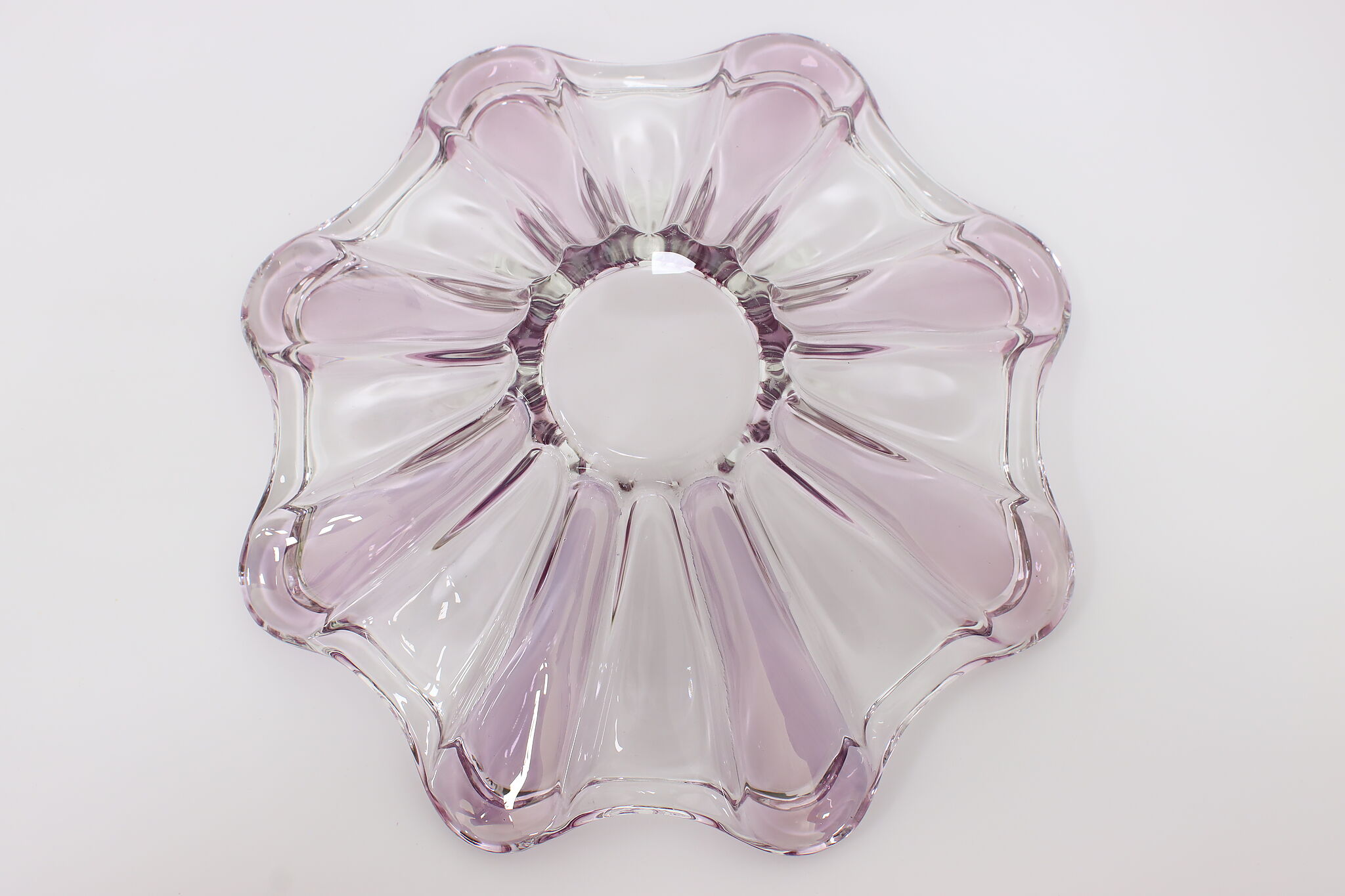 This gorgeous art glass sculptural bowl is shaped like a flower with amethyst shaded to clear glass petals.