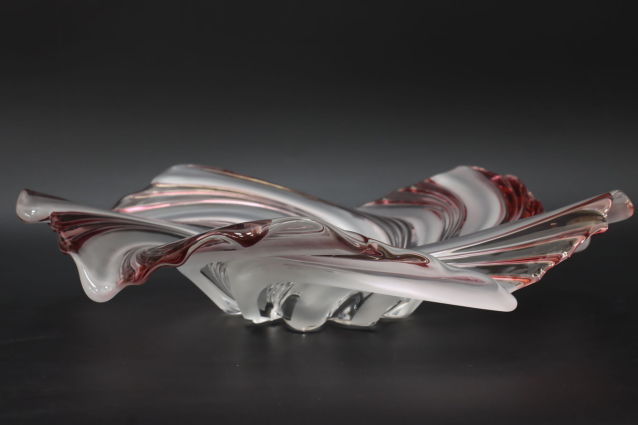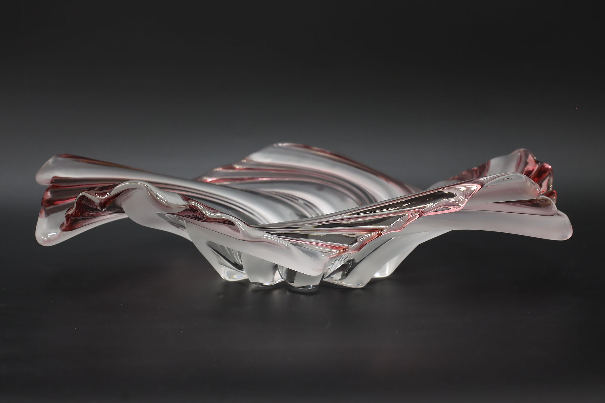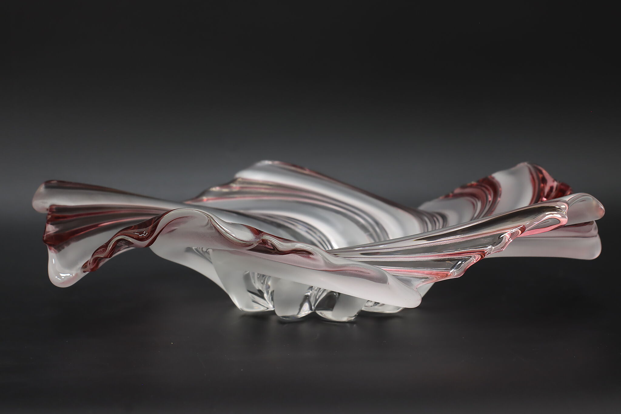 This gorgeous sculpture centerpiece bowl is in the shape of a flower with clear, frosted, and pink glass petals.