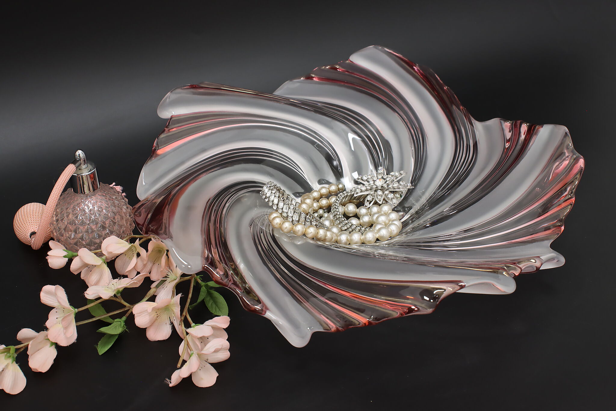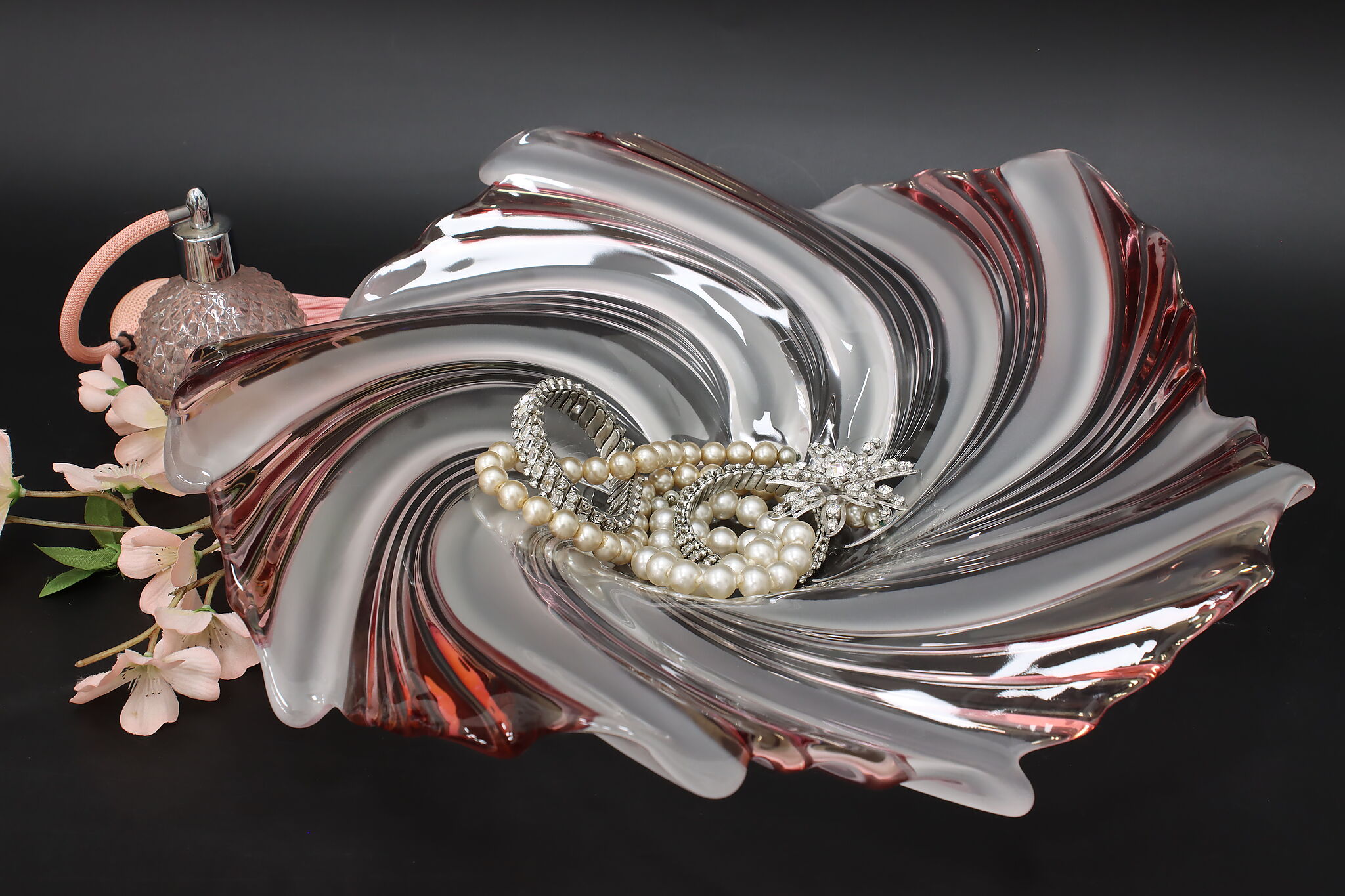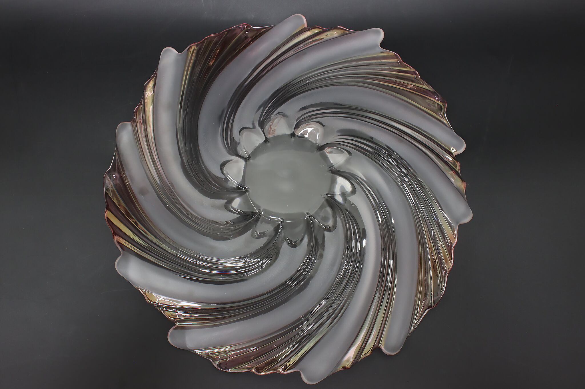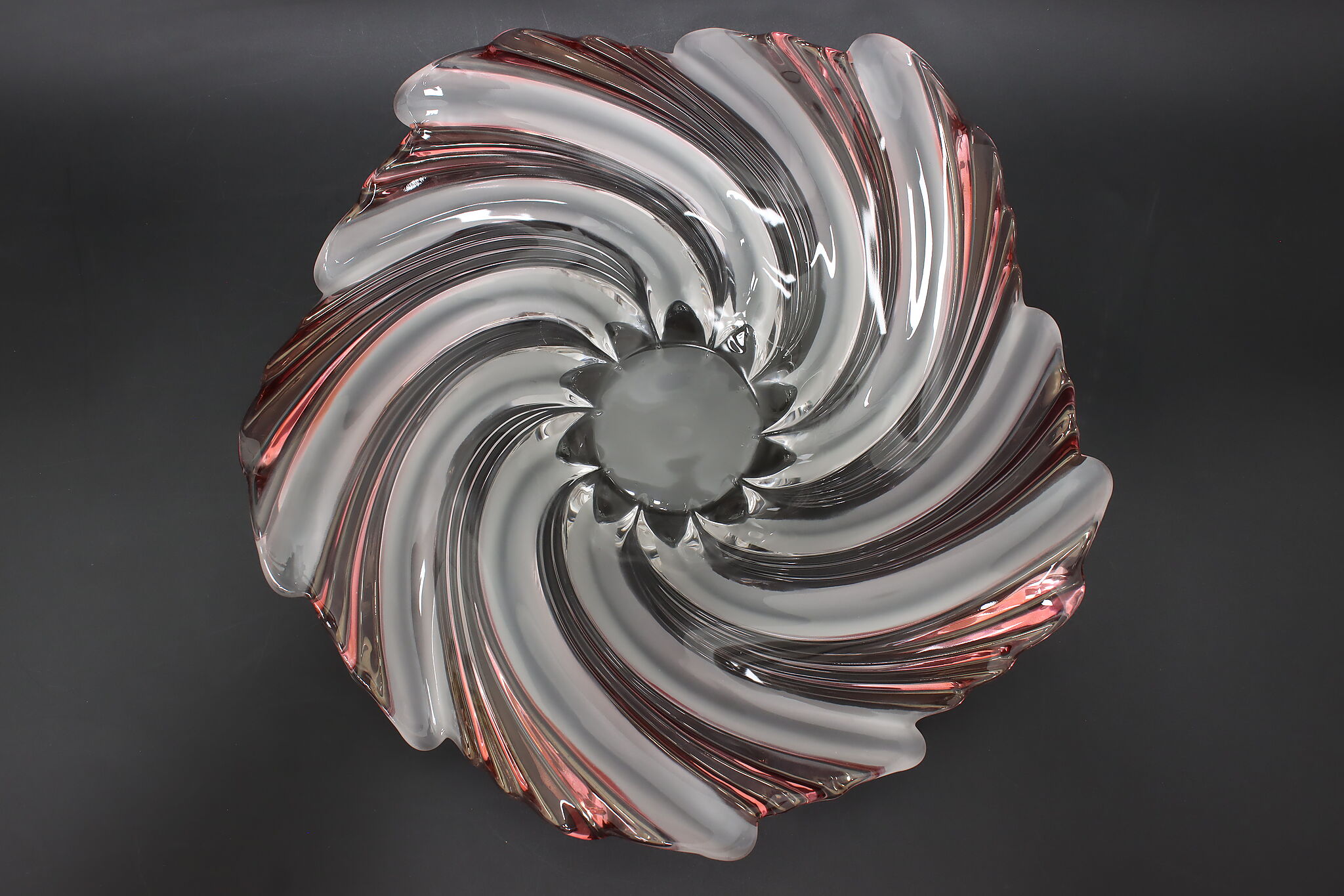 This gorgeous sculpture centerpiece bowl is in the shape of a flower with clear, frosted, and pink glass petals.
