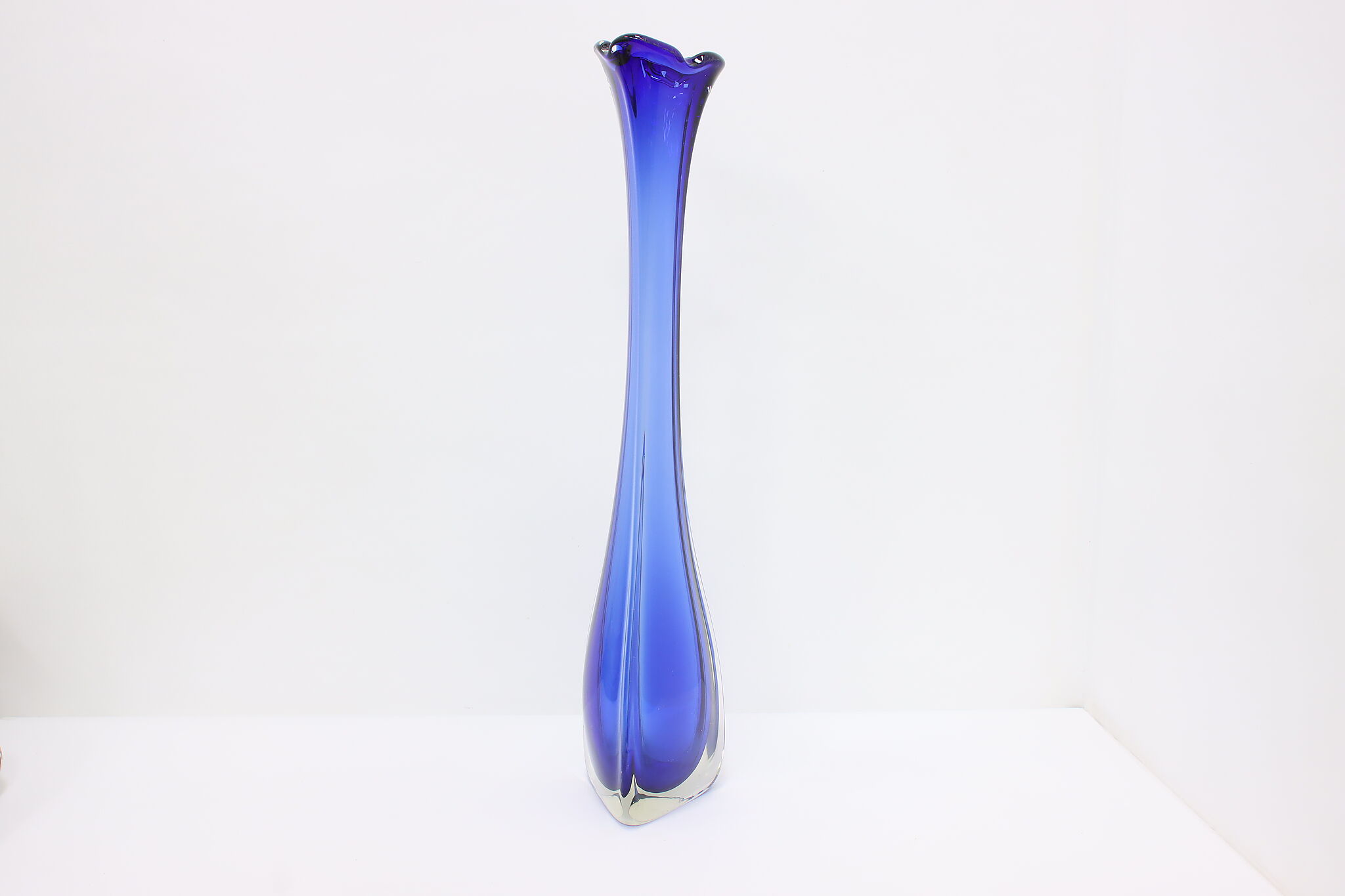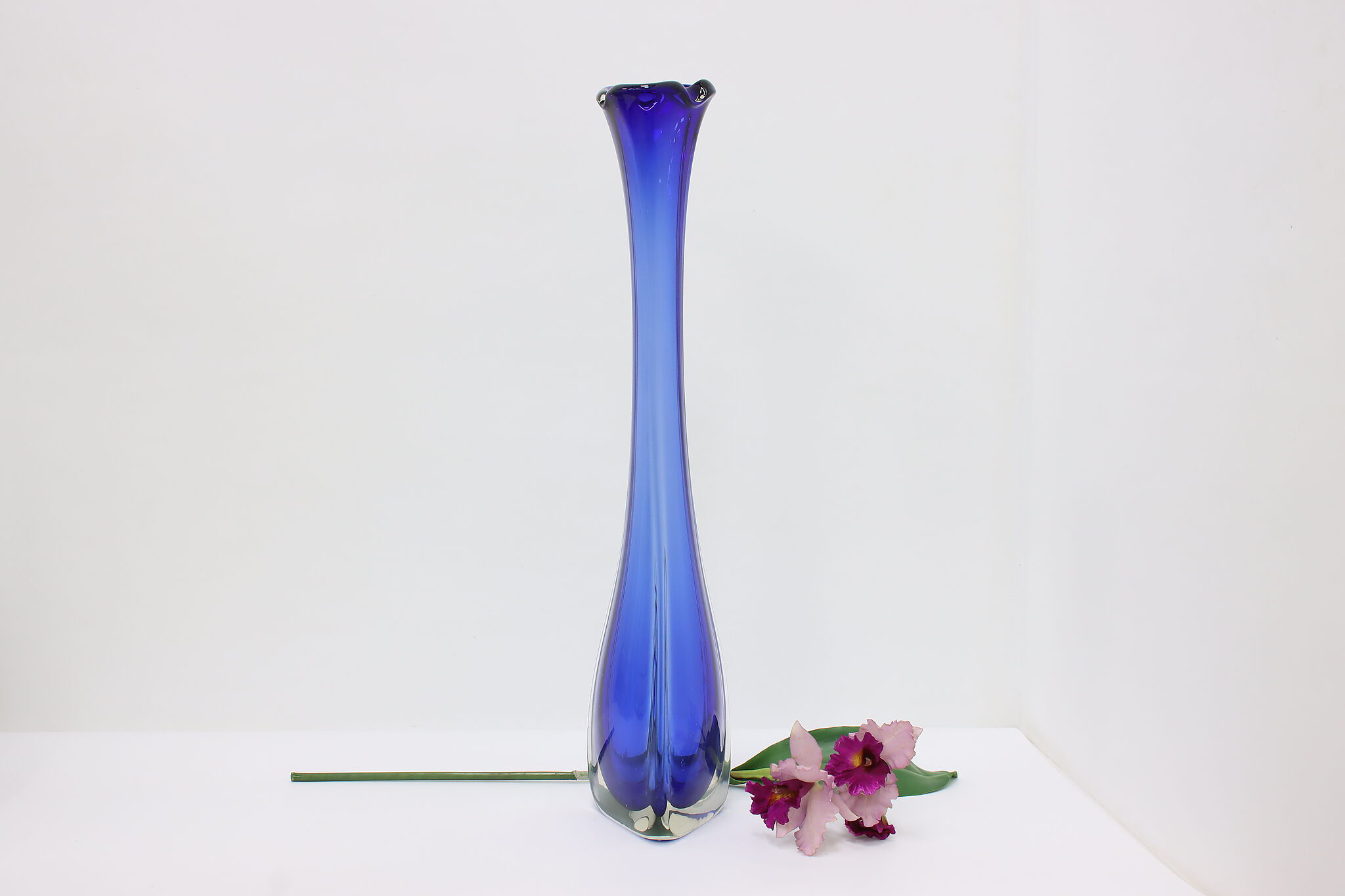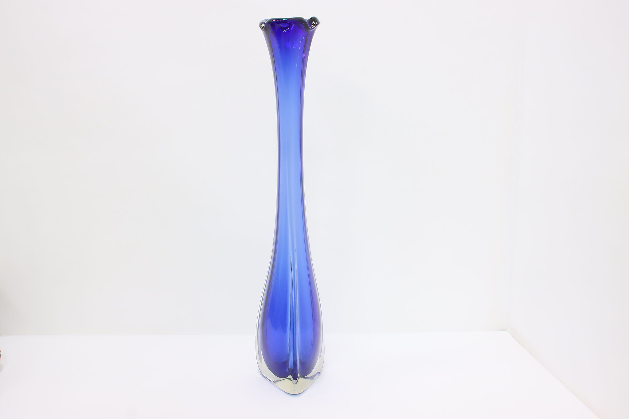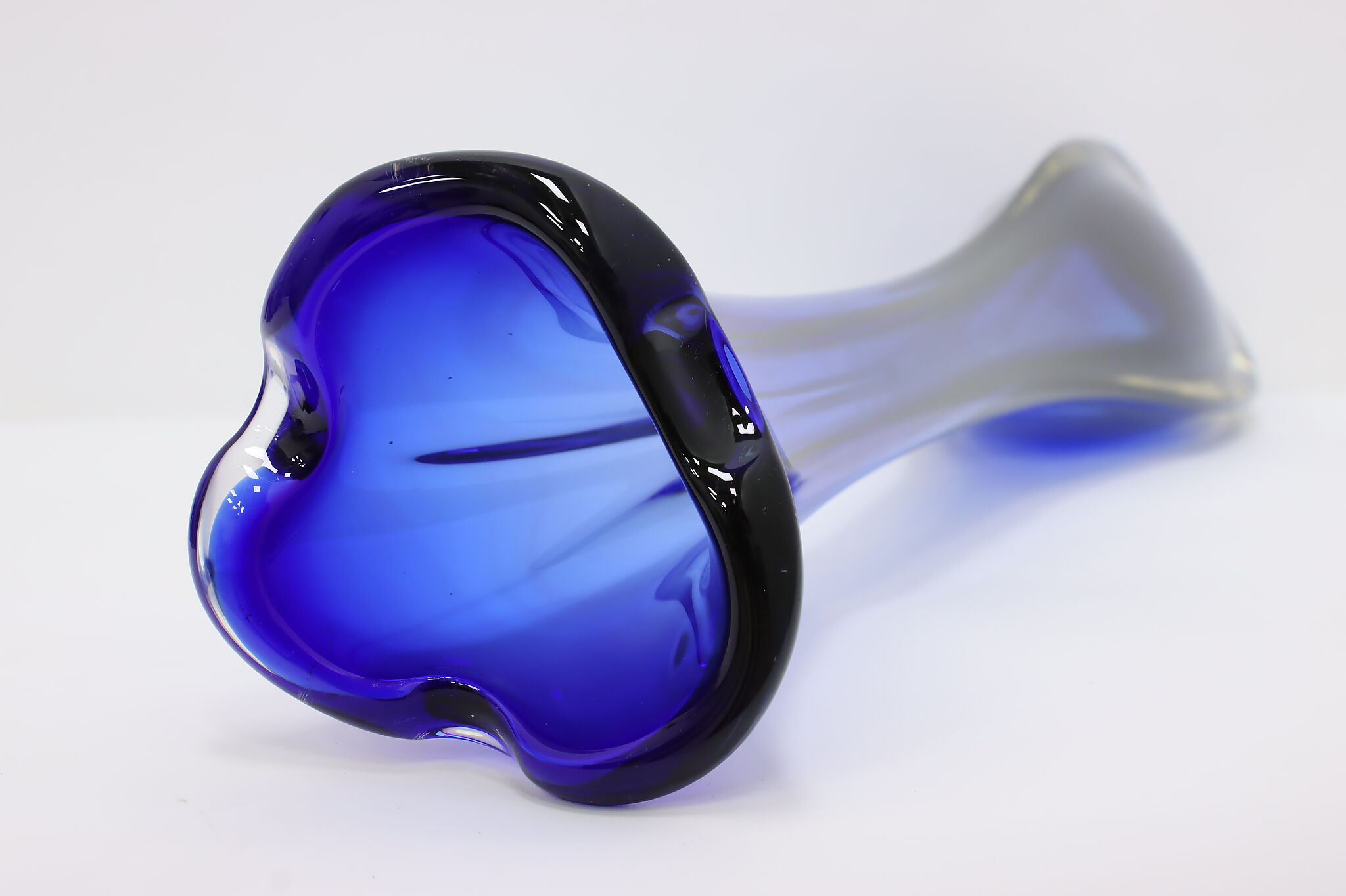 This tall blown glass flower or decorative vase is a gorgeous sapphire blue color shaded to clear.