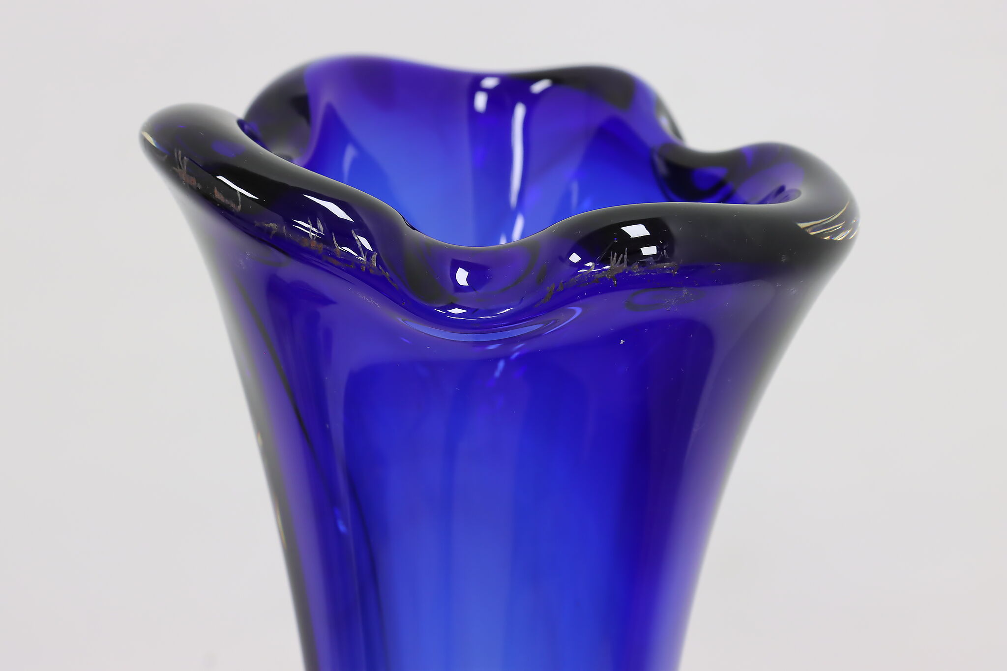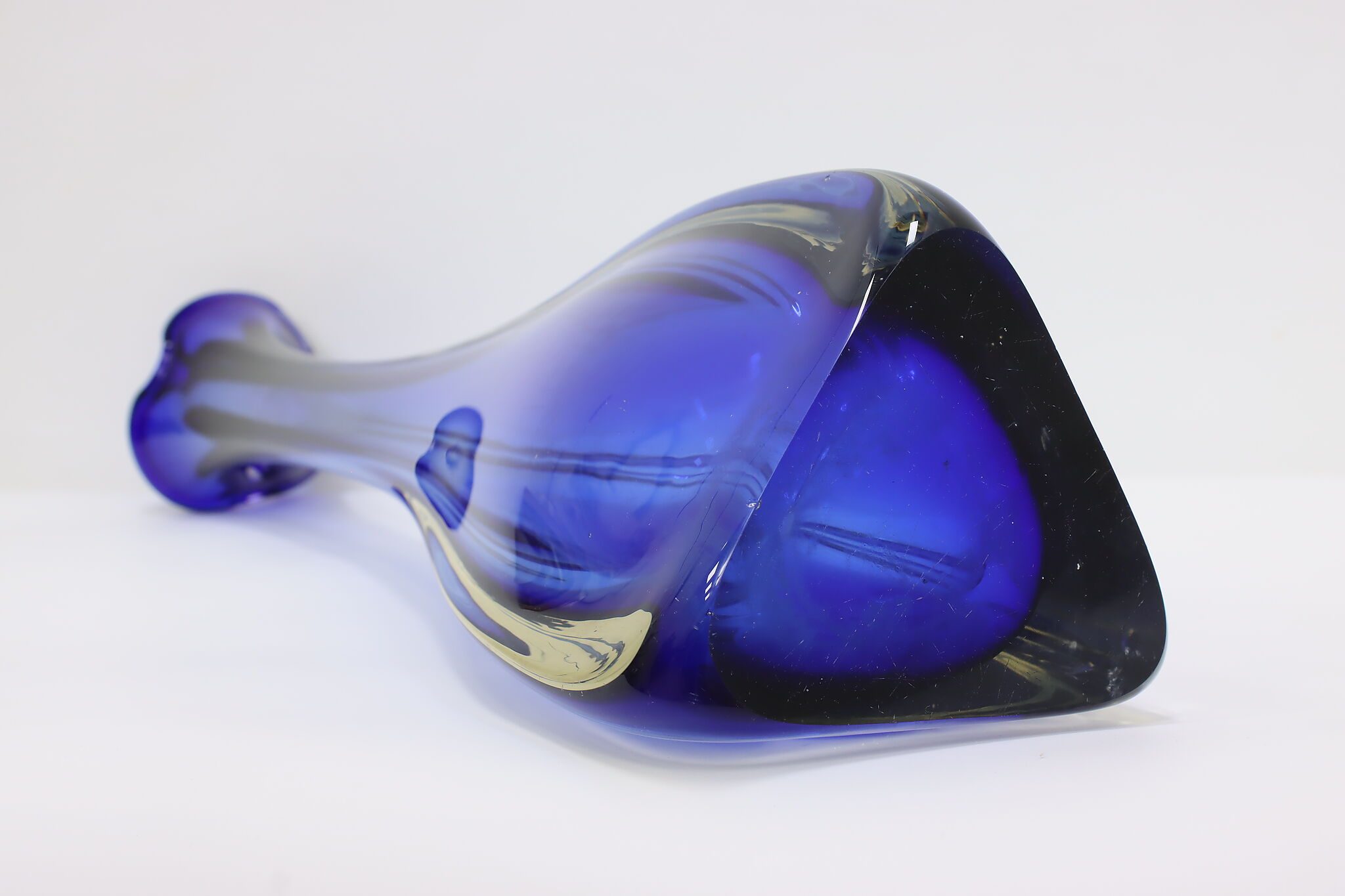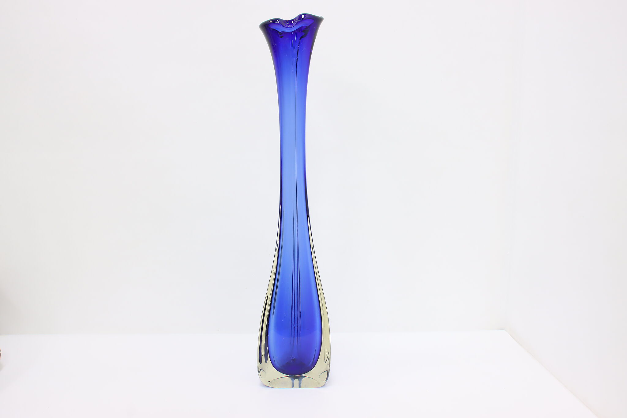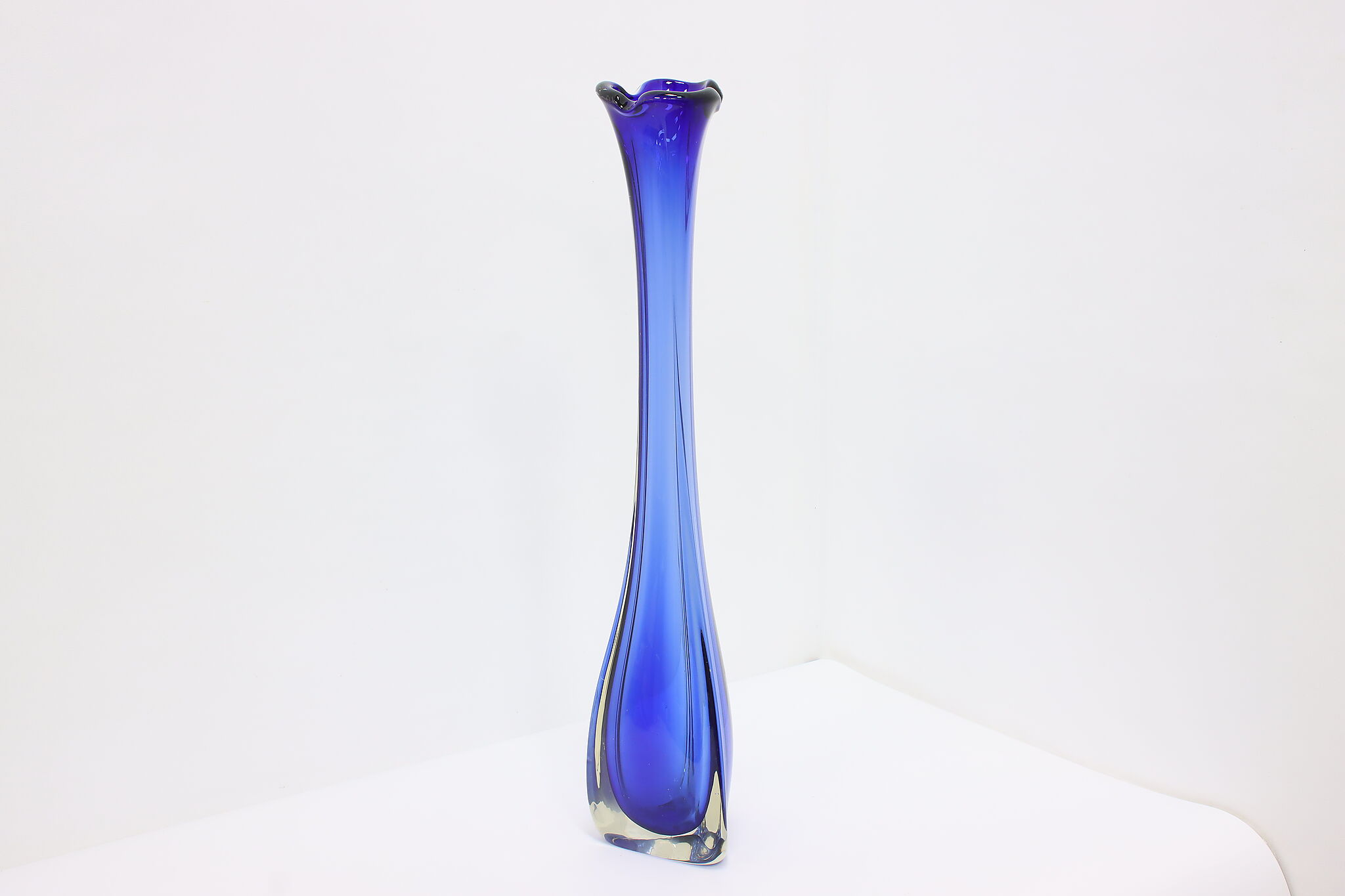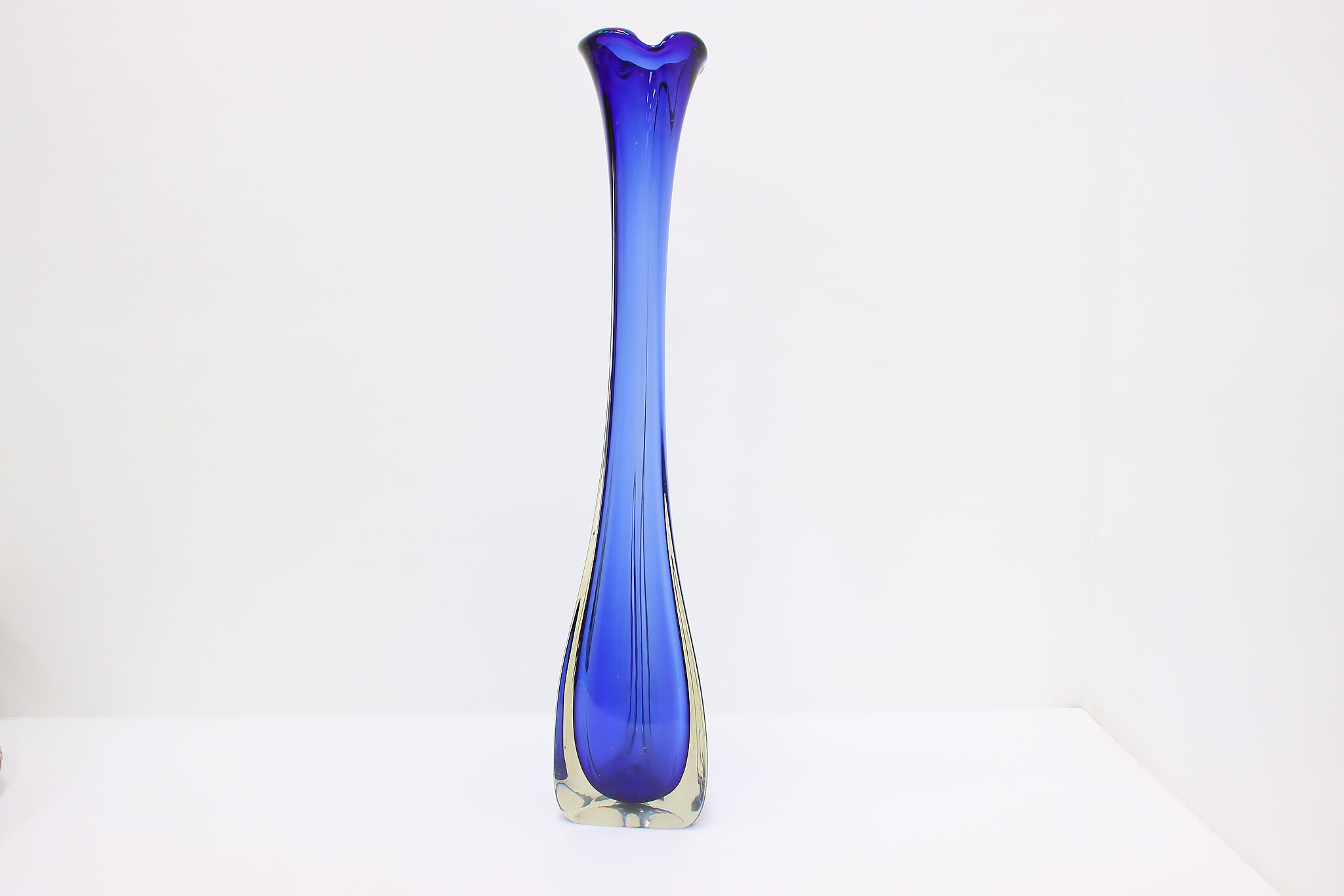 This tall blown glass flower or decorative vase is a gorgeous sapphire blue color shaded to clear.