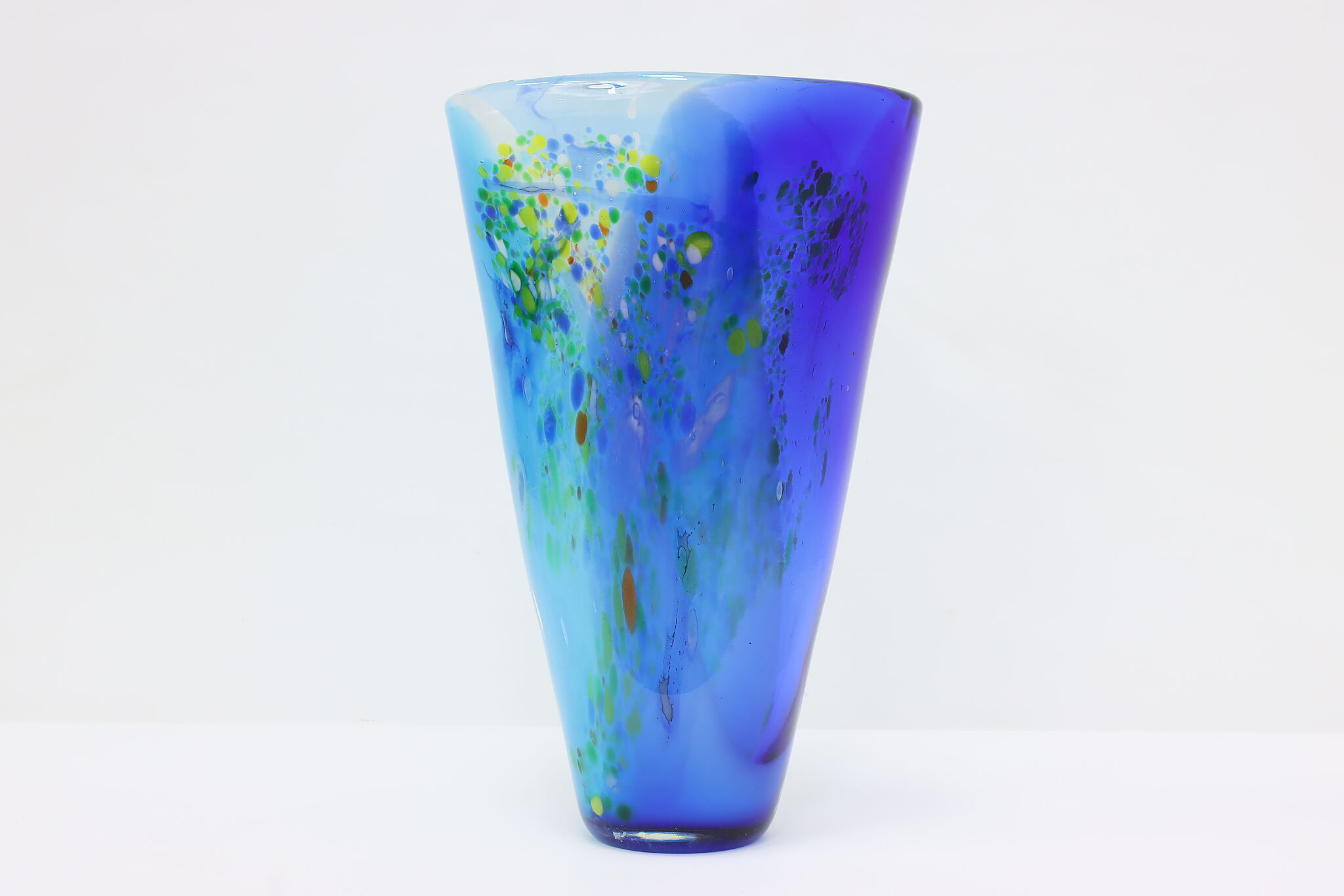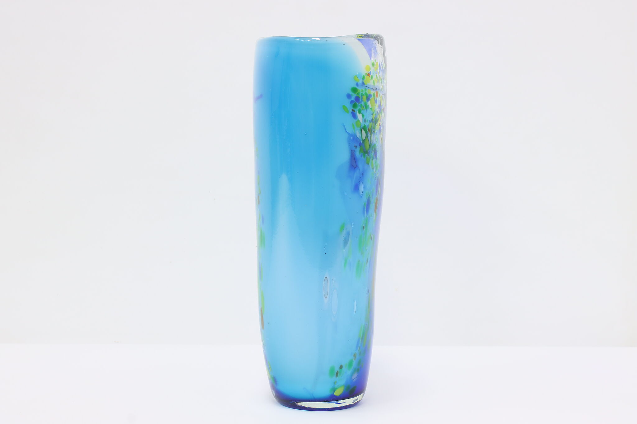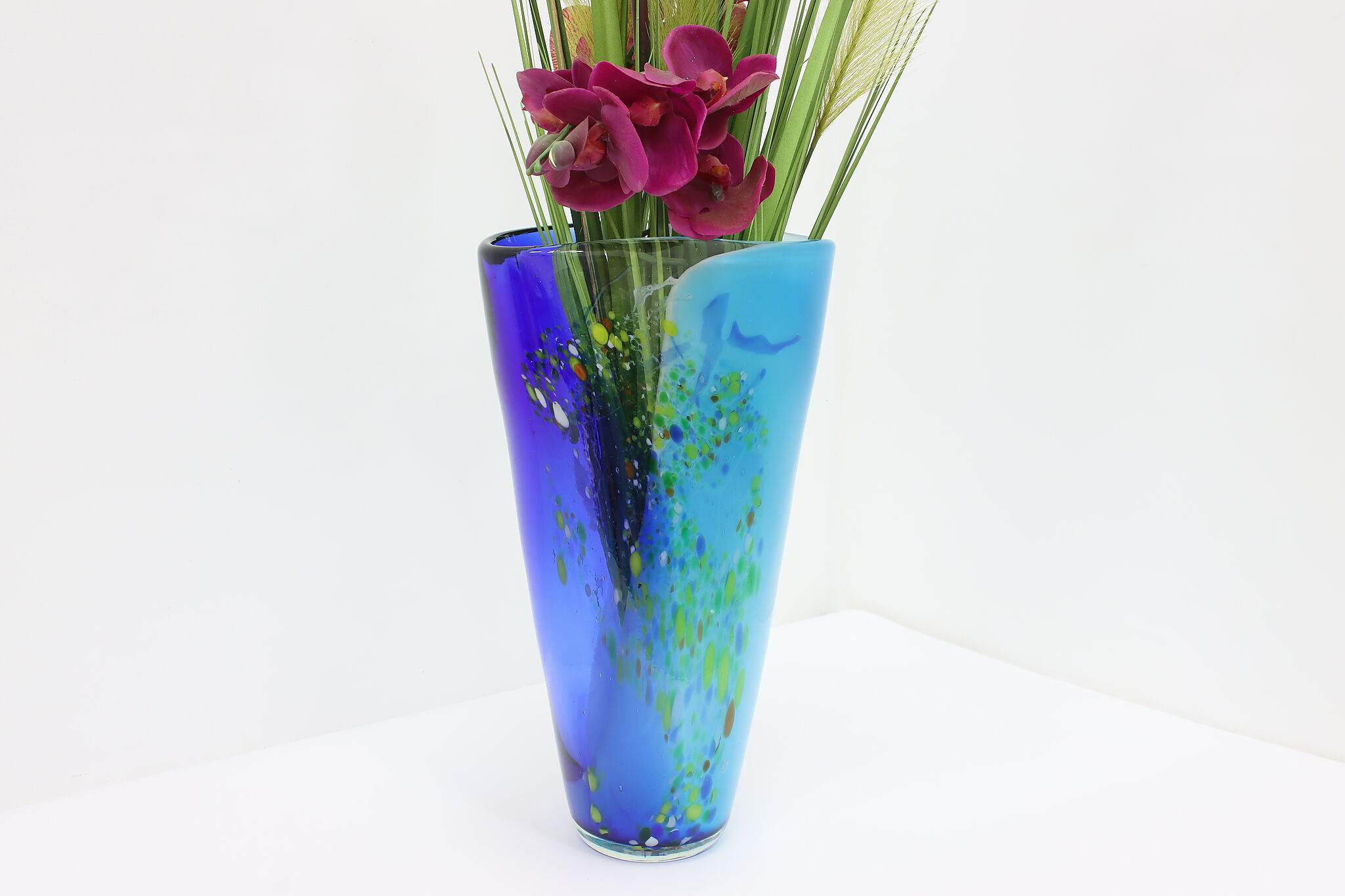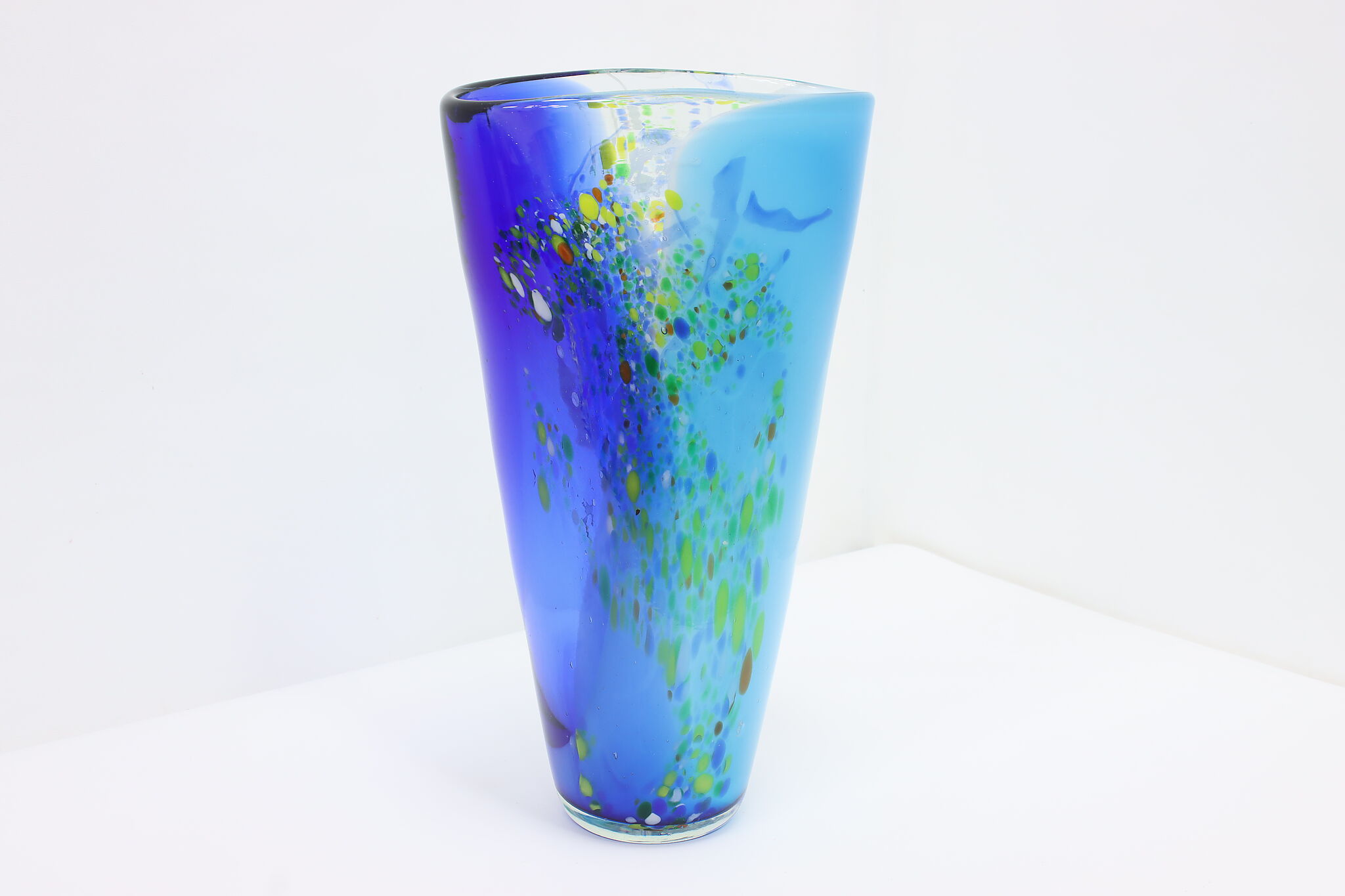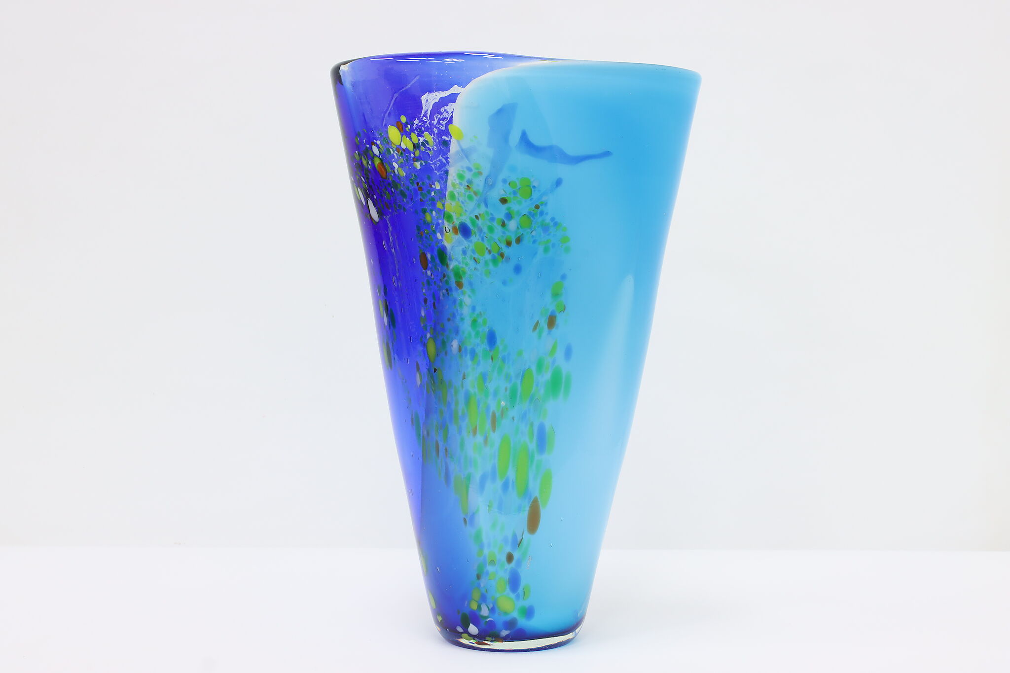 The gorgeous blues of this Murano art glass vase is perfectly complimented by the orange, yellow, and green speckles.
