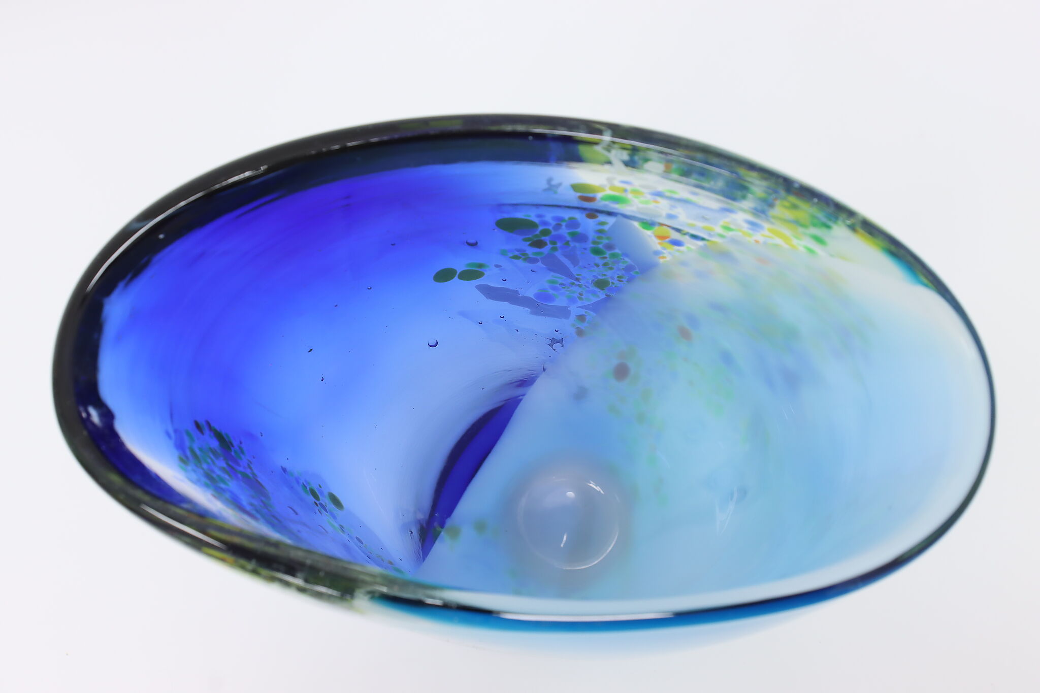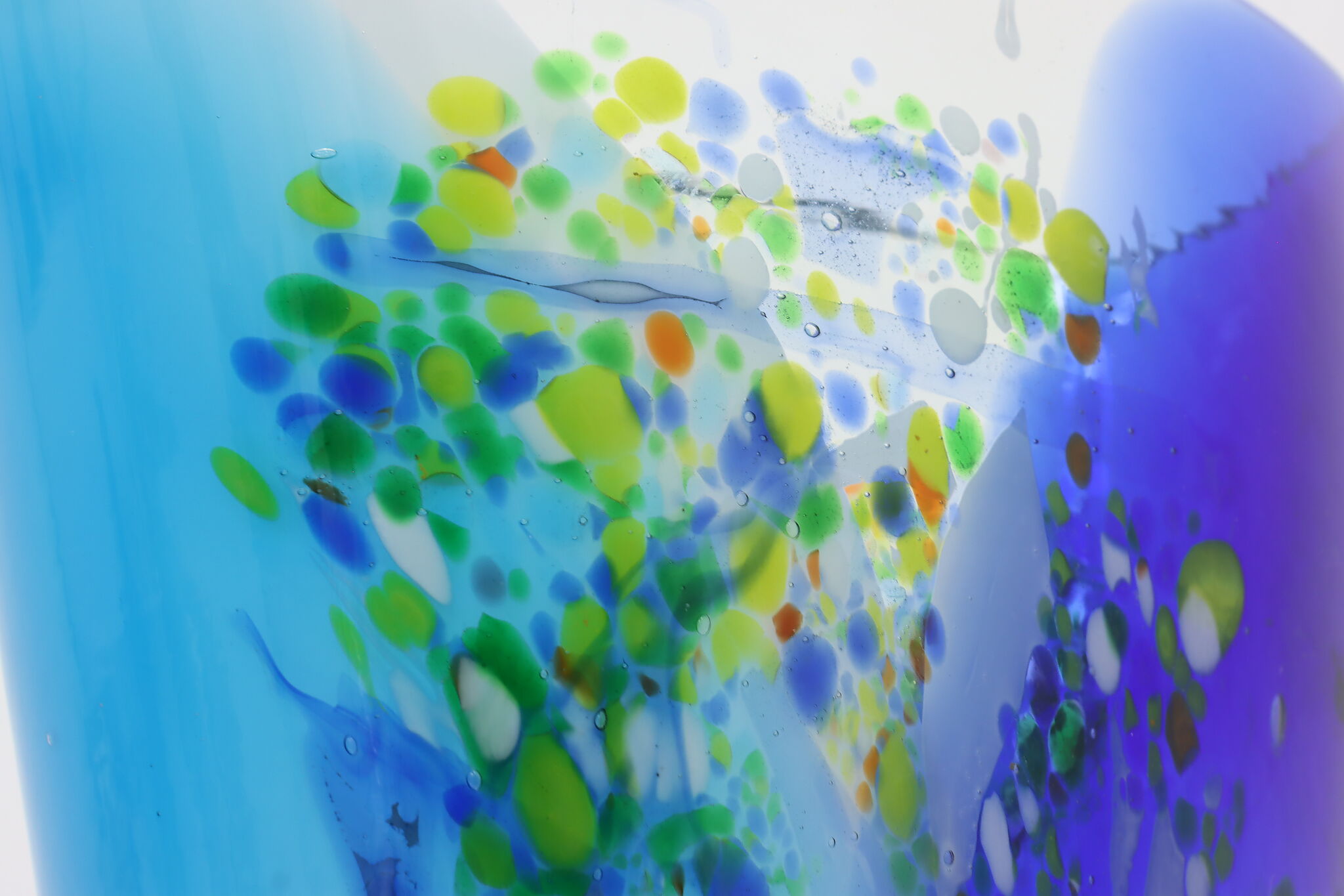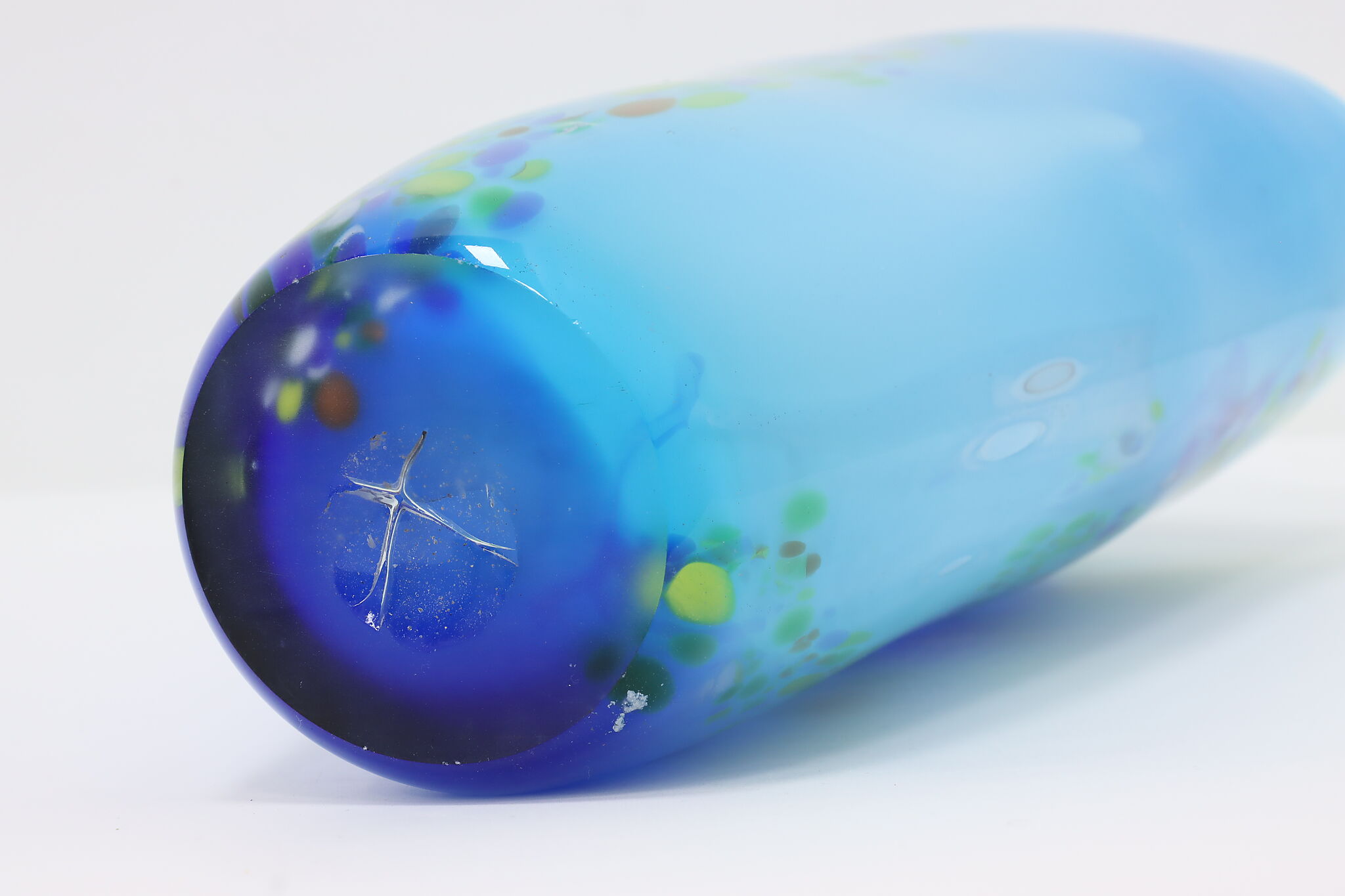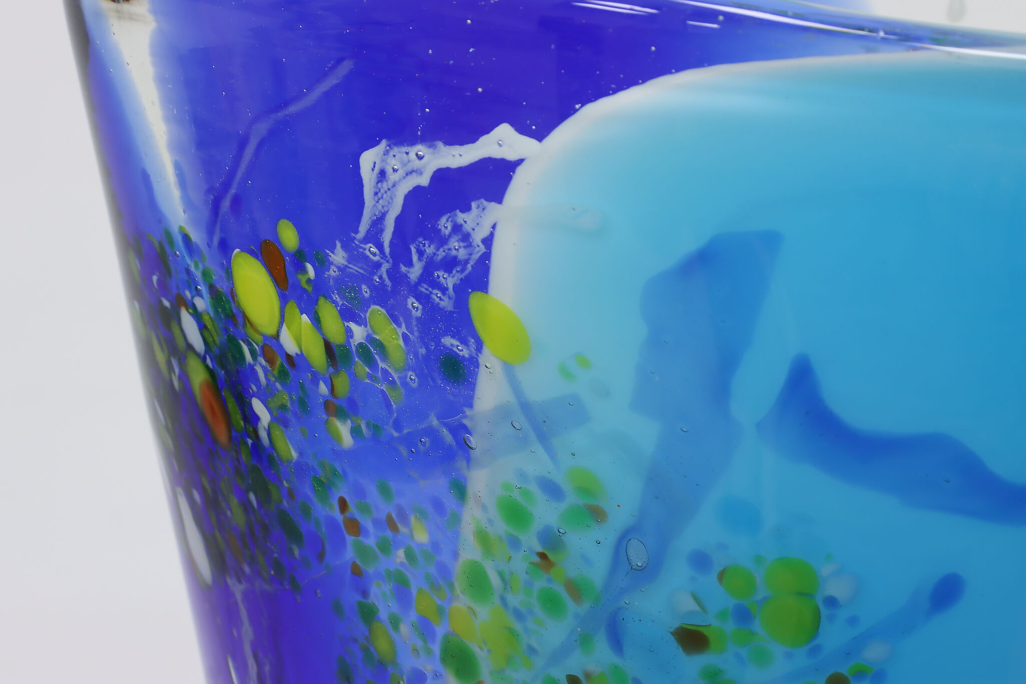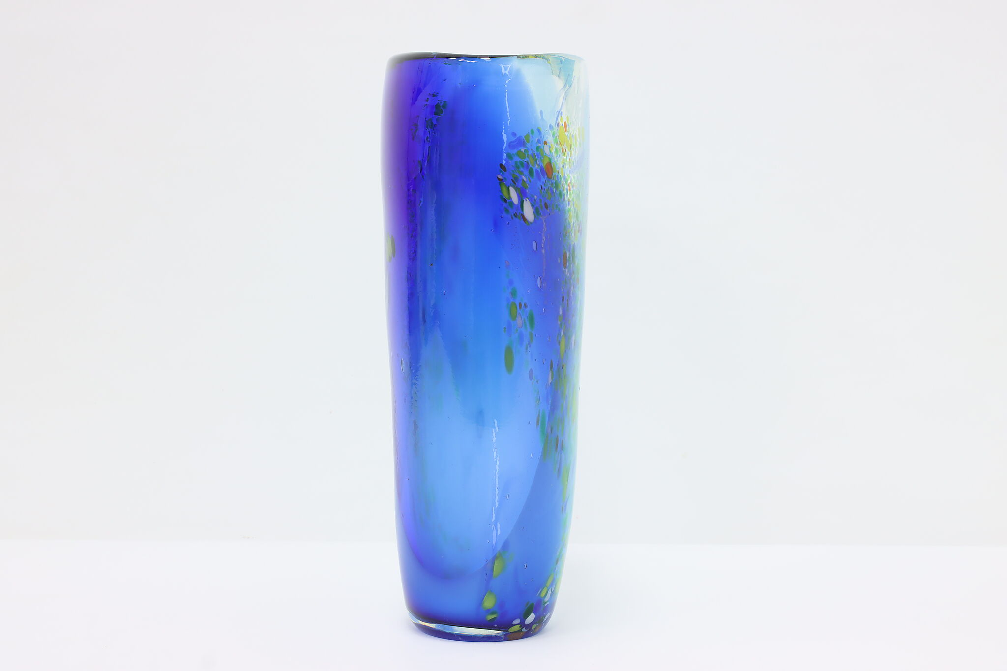 The gorgeous blues of this Murano art glass vase is perfectly complimented by the orange, yellow, and green speckles.