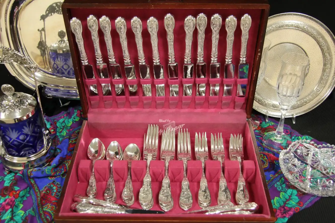Not monogrammed, these pieces have just enough wear for a comfortable "butler's finish." This pattern began in 1894 and is discontinued. A mahogany silverware chest is included. The large and heavy weight set includes twelve each of the following: