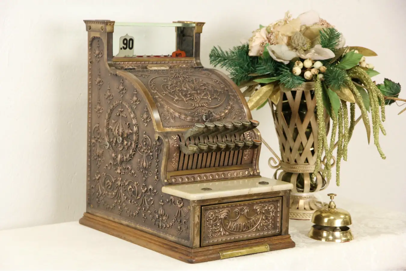 Cast and deeply embossed bronze panels are beautiful, the base is oak. Model 313, the serial number is 1277654, which was made in 1913. The numbers are worn on the buttons, which only go up to $1.95. There are stains on the original marble shelf for money, see photos.