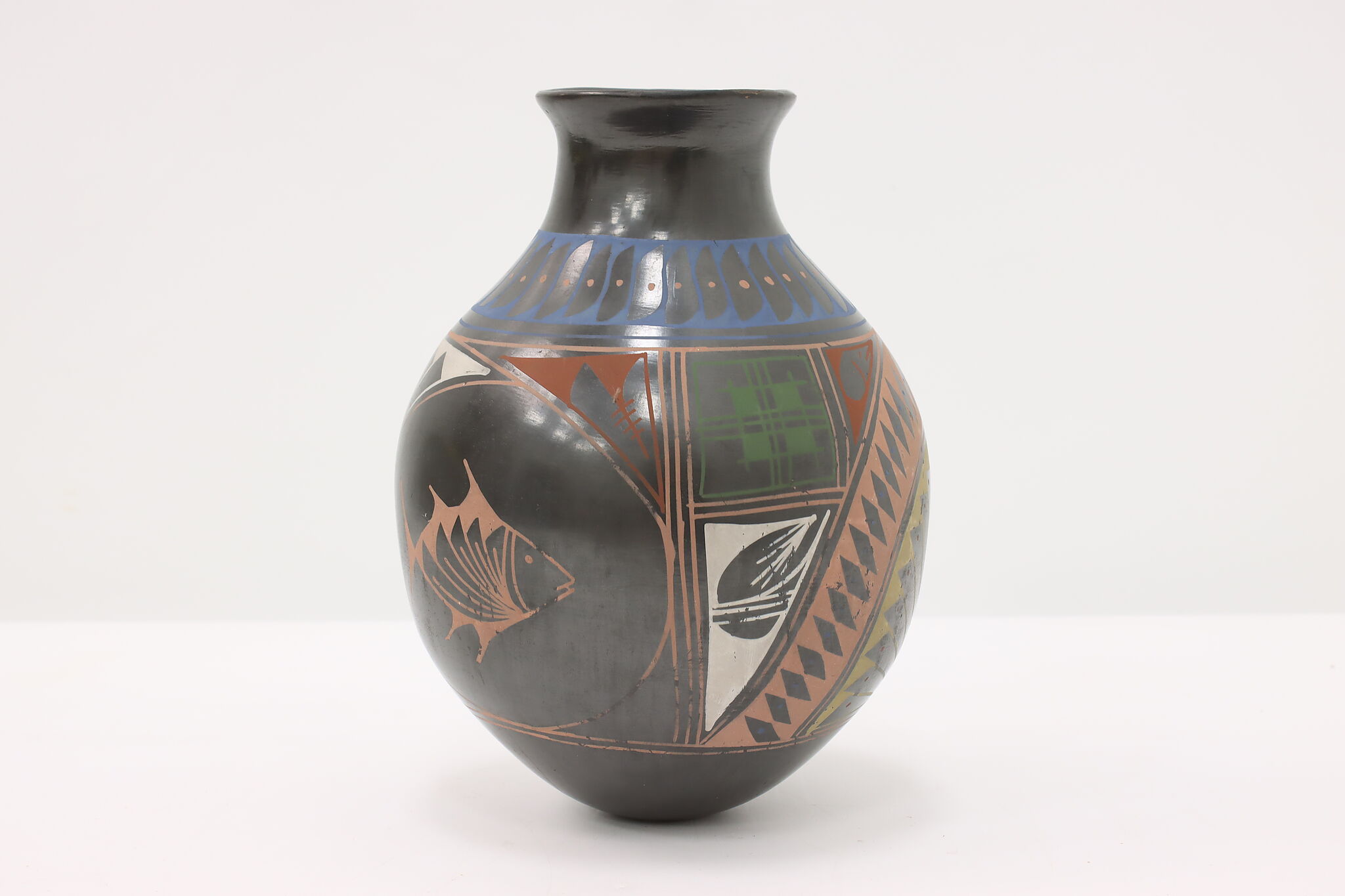 A traditional Native American pottery vase has beautiful hand painted details, but has a long 4" crack through the rounded bottom.
