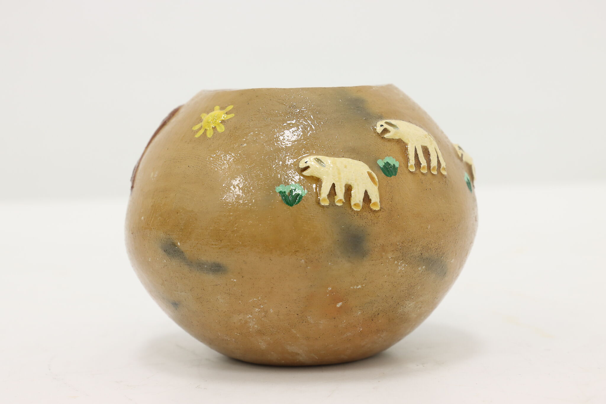 Fantastically handcrafted by a Southwestern Native American tribe, this small vase has a woman and her dog herding sheep past the famous natural landmark, Devil's Tower.