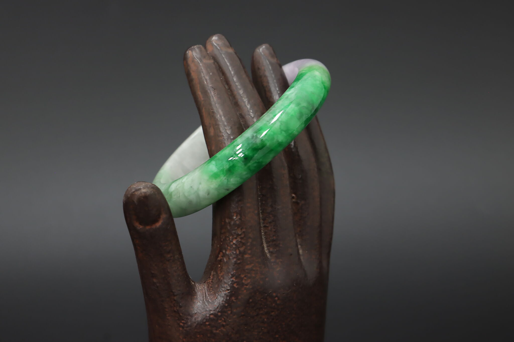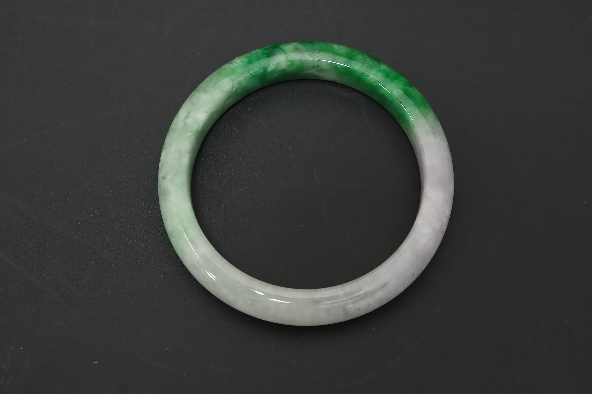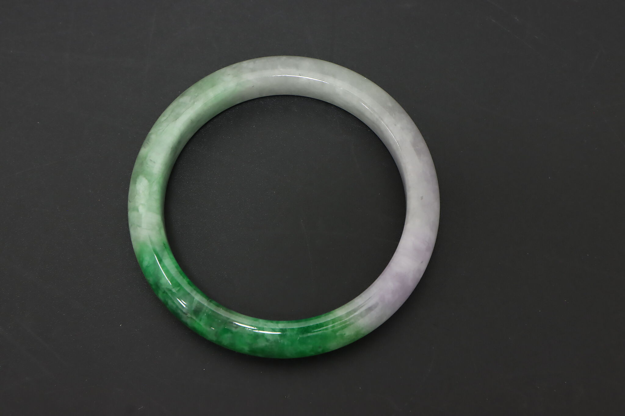 Smooth, polished jade bangle featuring a beautiful blend of soft lavender tones and rich green coloration. Jade has long been associated with protection, balance, and prosperity. The natural color transitions in this bangle give it visual depth and a refined, understated presence on the wrist.