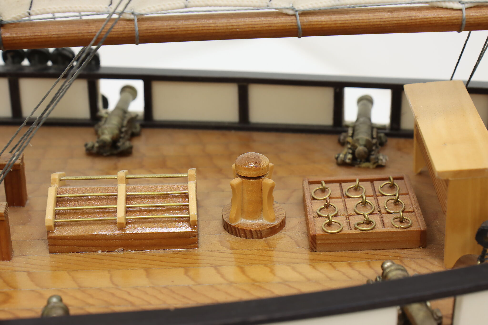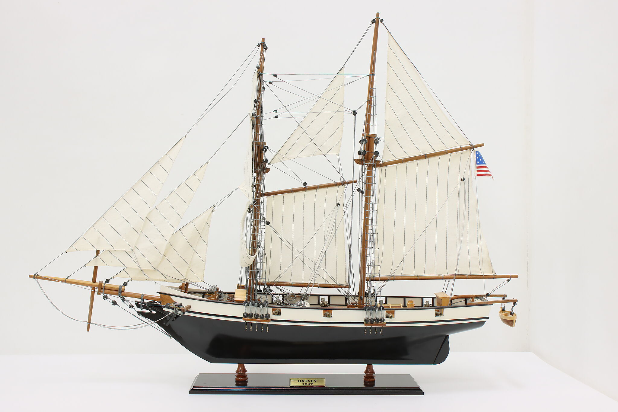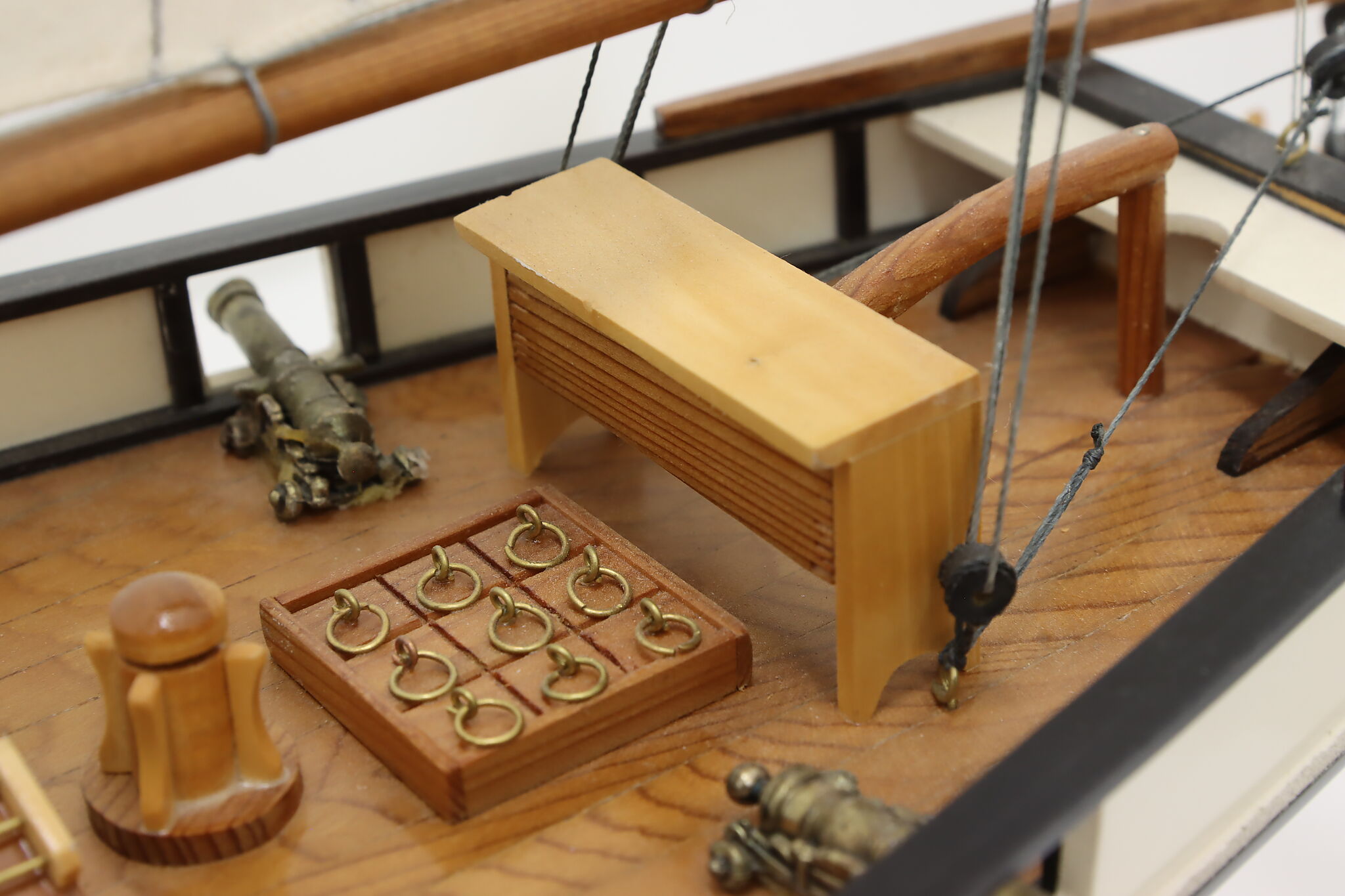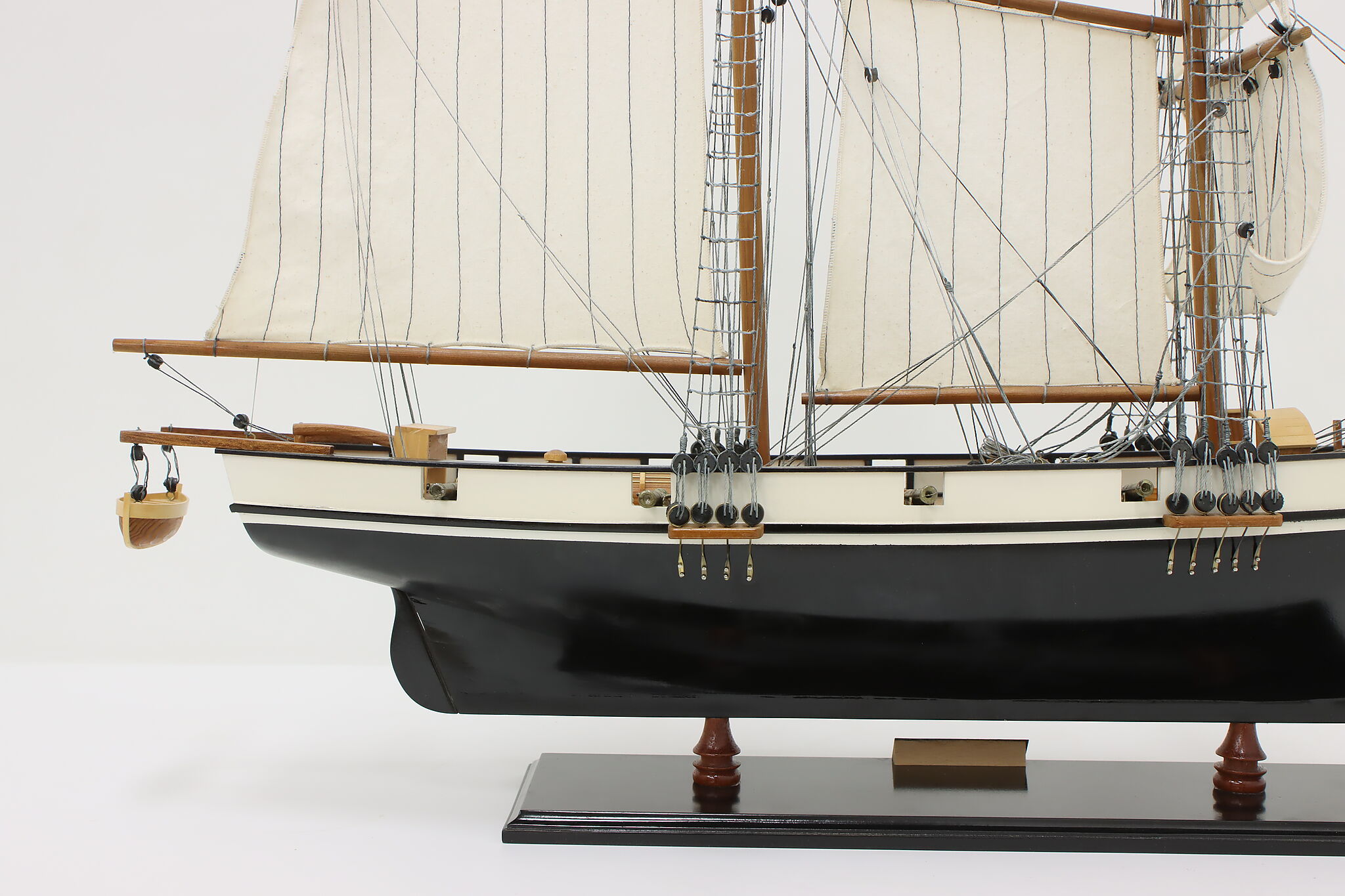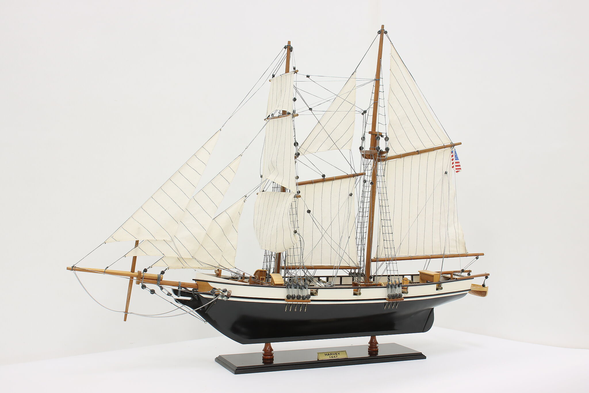 This gorgeous ship model was designed after 19th century Baltimore Clippers, a series of ships that were fast and light for traveling long distances.
