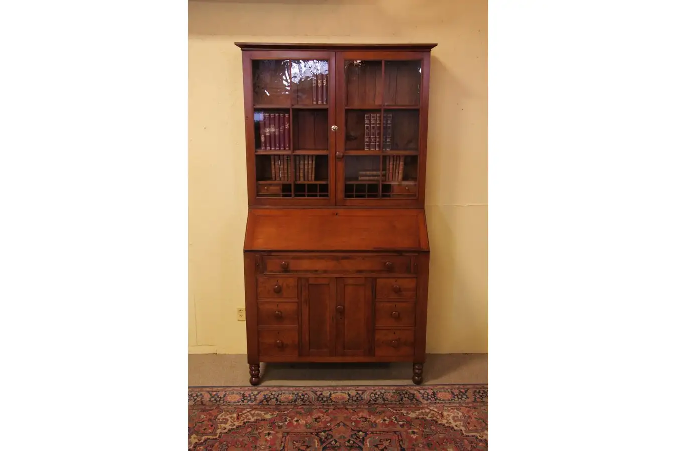 Solid cherry is hand-planed everywhere. The old finish is exceptional, with just enough mars and wear for a little character and glowing patina. The separate upper bookcase has wavy glass panes, slide-in adjustable shelves, plus cubicles and 4 tiny drawers. The dropfront on the lower section opens to expose 12 drawers with solid birdseye maple fronts. Inside, flipping a release bar opens a secret compartment.