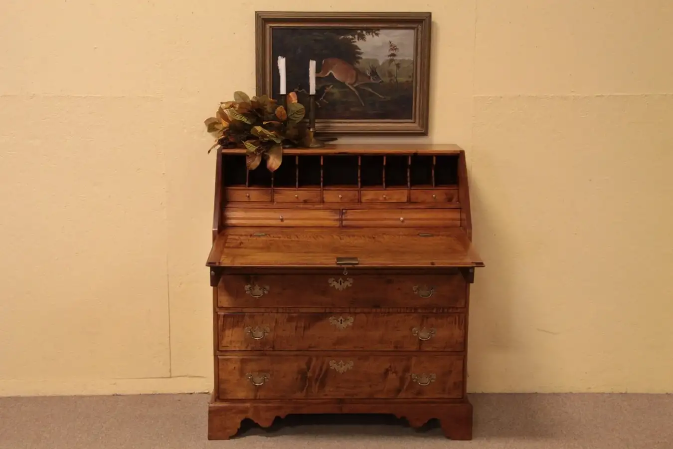 Honest and straightforward Yankee antique furniture, this is a real beauty. Measurements are 38" wide, 19" deep, 41" tall and the writing surface is 30" high.