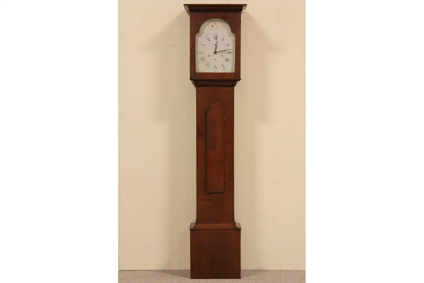 If the authentic movement with oak plates and cherry gears was to be restored, it could be returned to the case without any damage. The solid walnut case has a very fine old finish with warm antique patina plus some crazing or crackling from age.