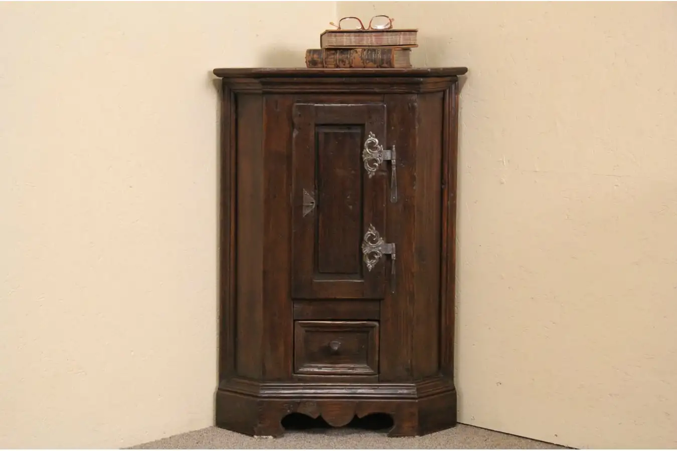 Hand crafted of pine about 1860 in Norway, this picturesque corner cabinet could be hung on a wall as well. The original finish has warm patina and has been waxed and buffed, so all that is needed to maintain its antique glow is an occasional wipe with a soft dry cloth.