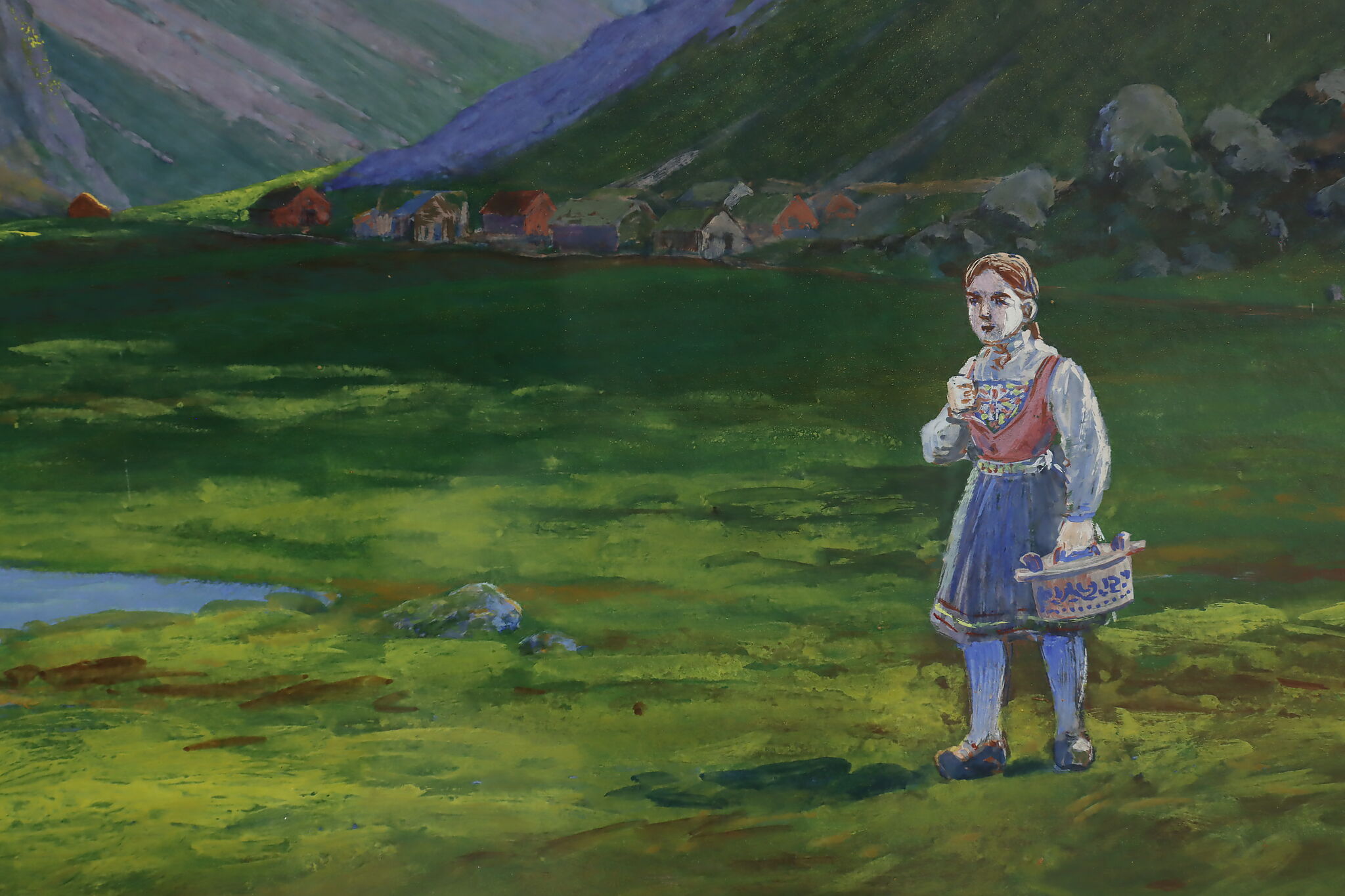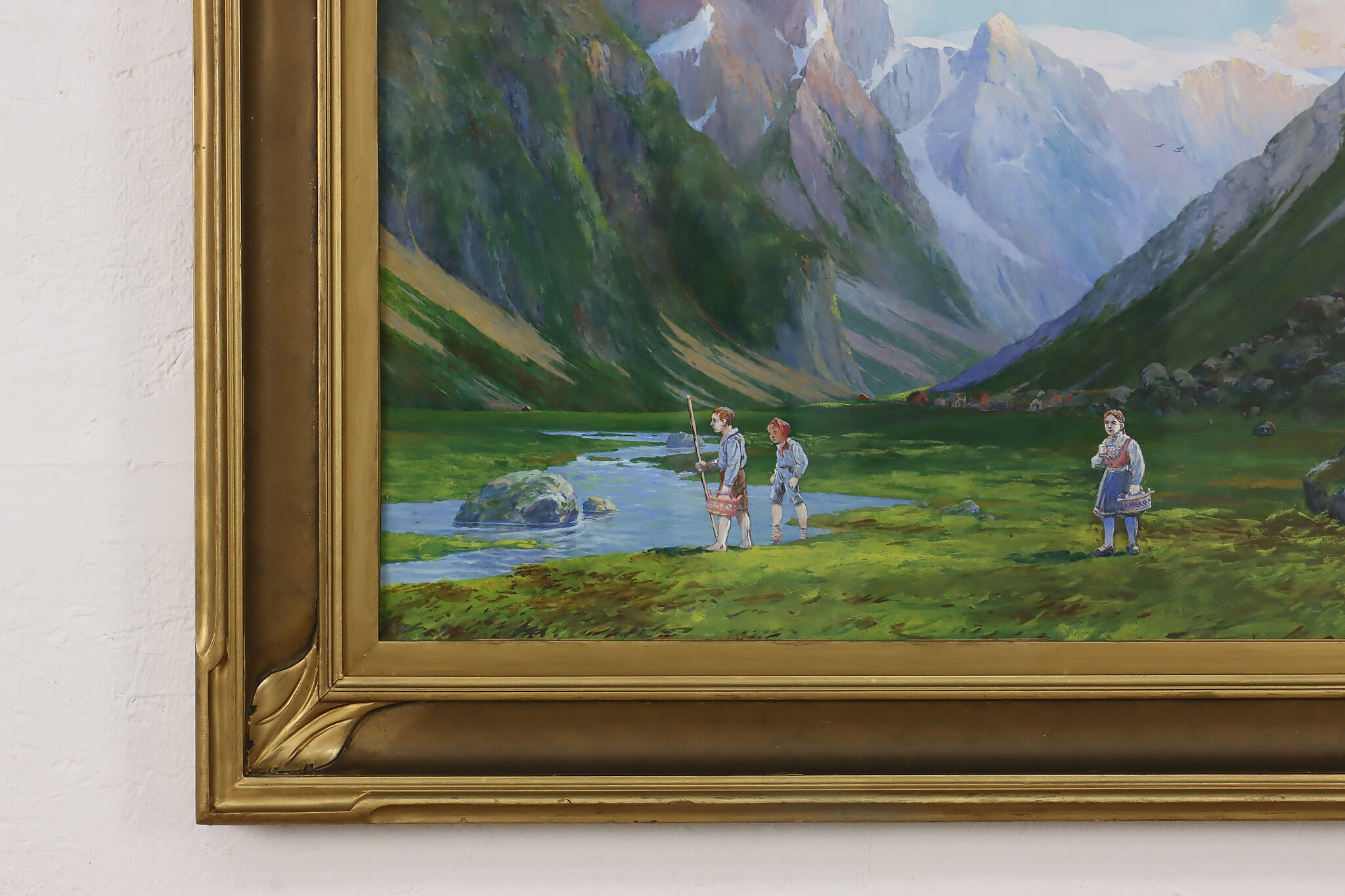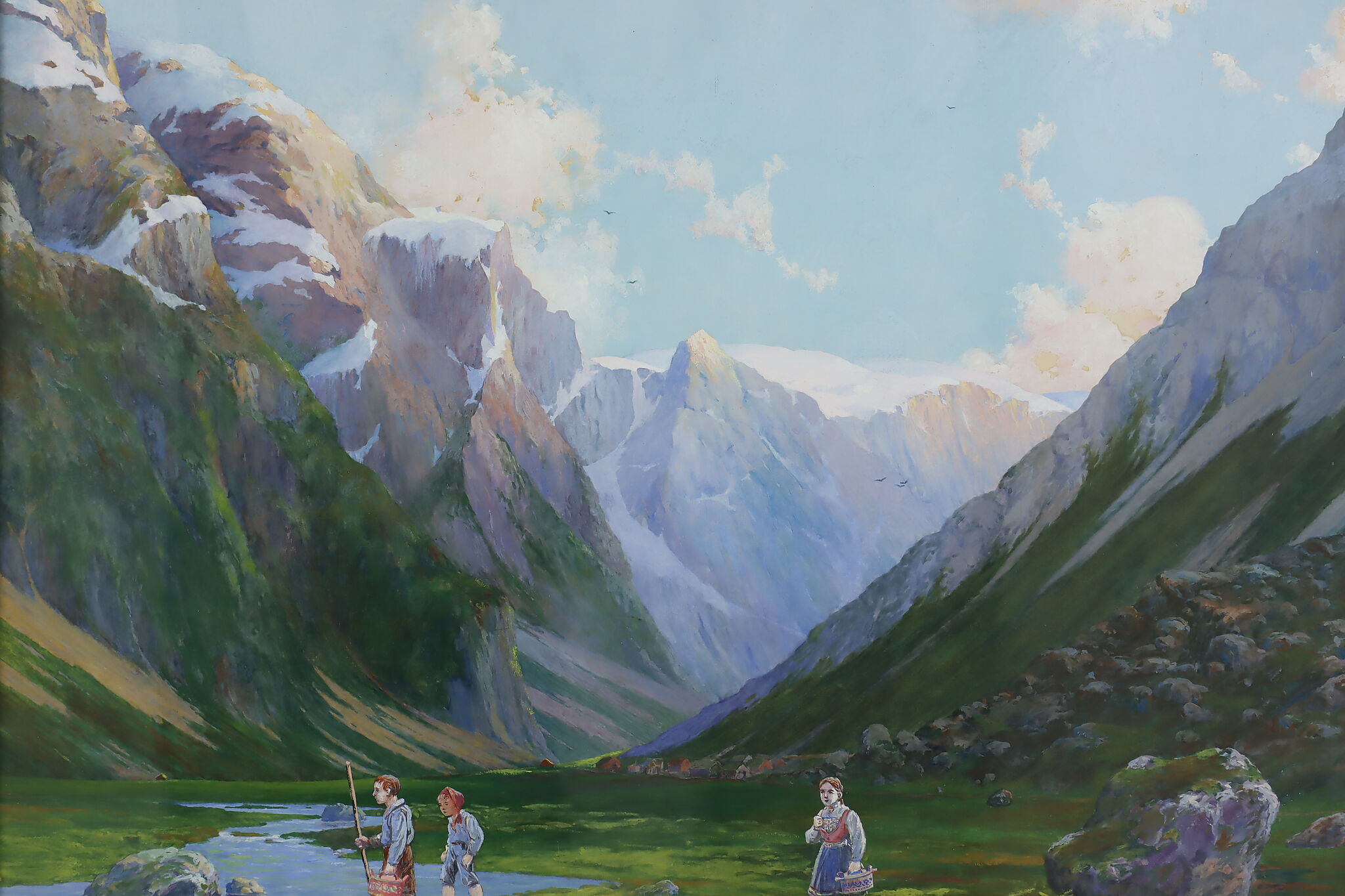 The beautiful, vibrant colors bring this painting of traditionally costumed children exploring a Norwegian mountain valley to life.