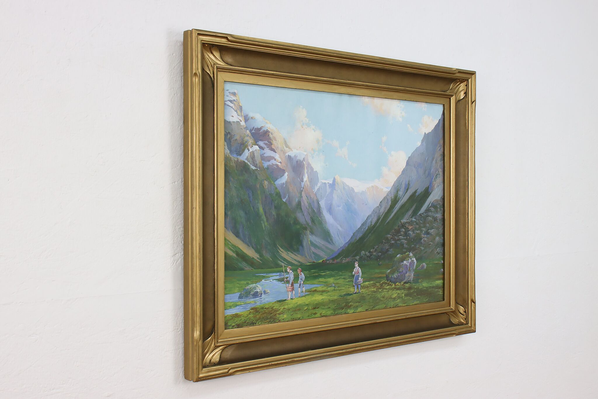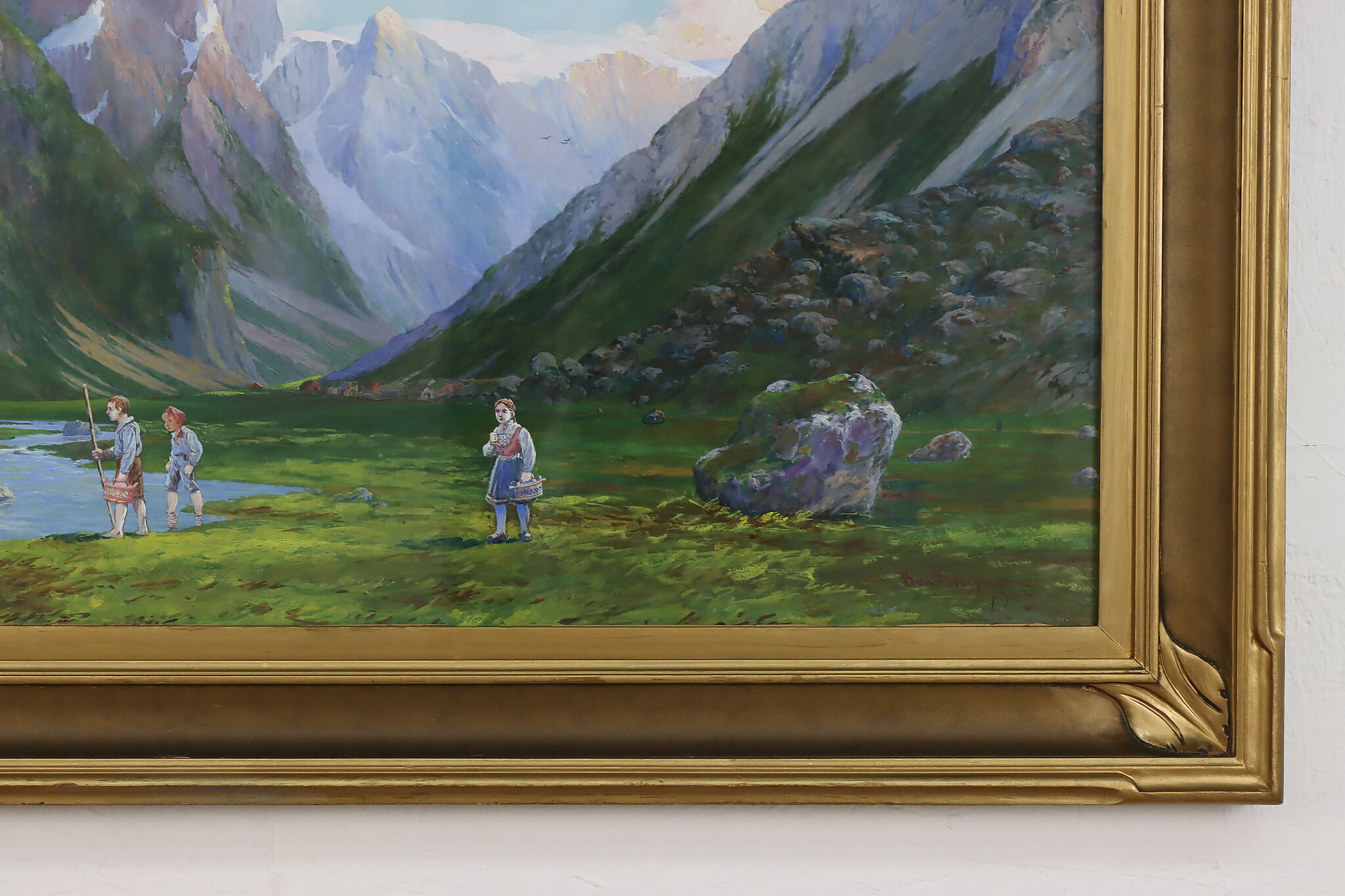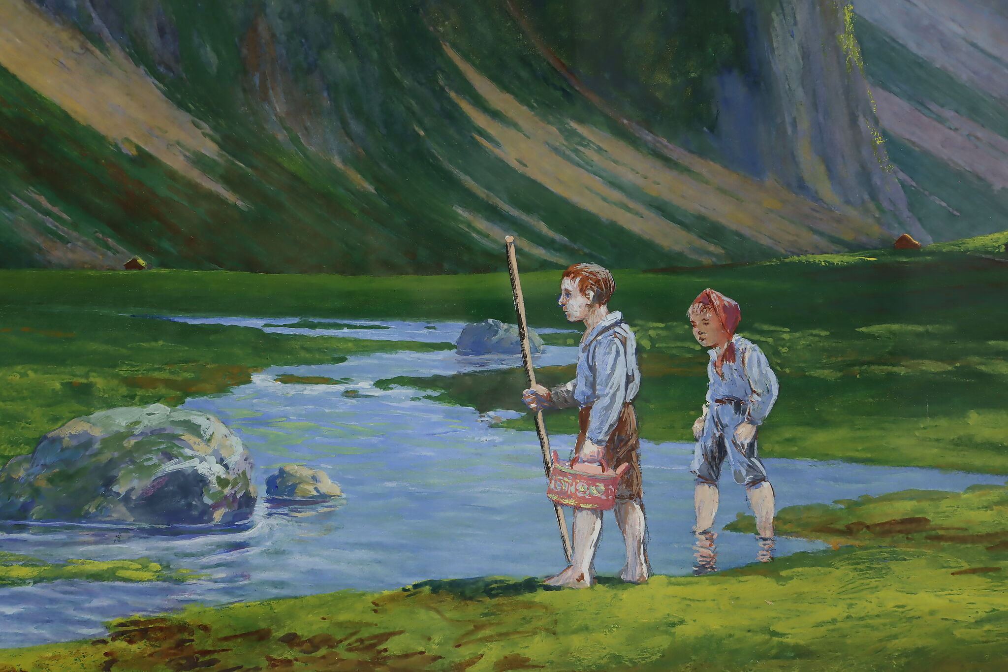 The beautiful, vibrant colors bring this painting of traditionally costumed children exploring a Norwegian mountain valley to life.