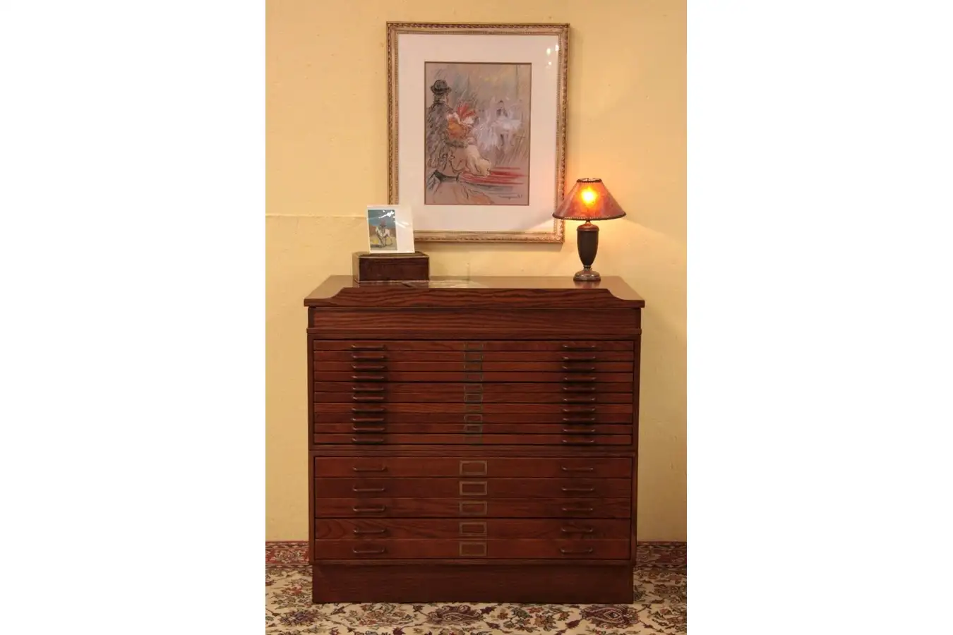 This 15 drawer oak file may have been used for maps, nautical charts, architectural drawings, botanical prints or artwork. The adjustable easel top has a sturdy support mechanism with 14 positions.