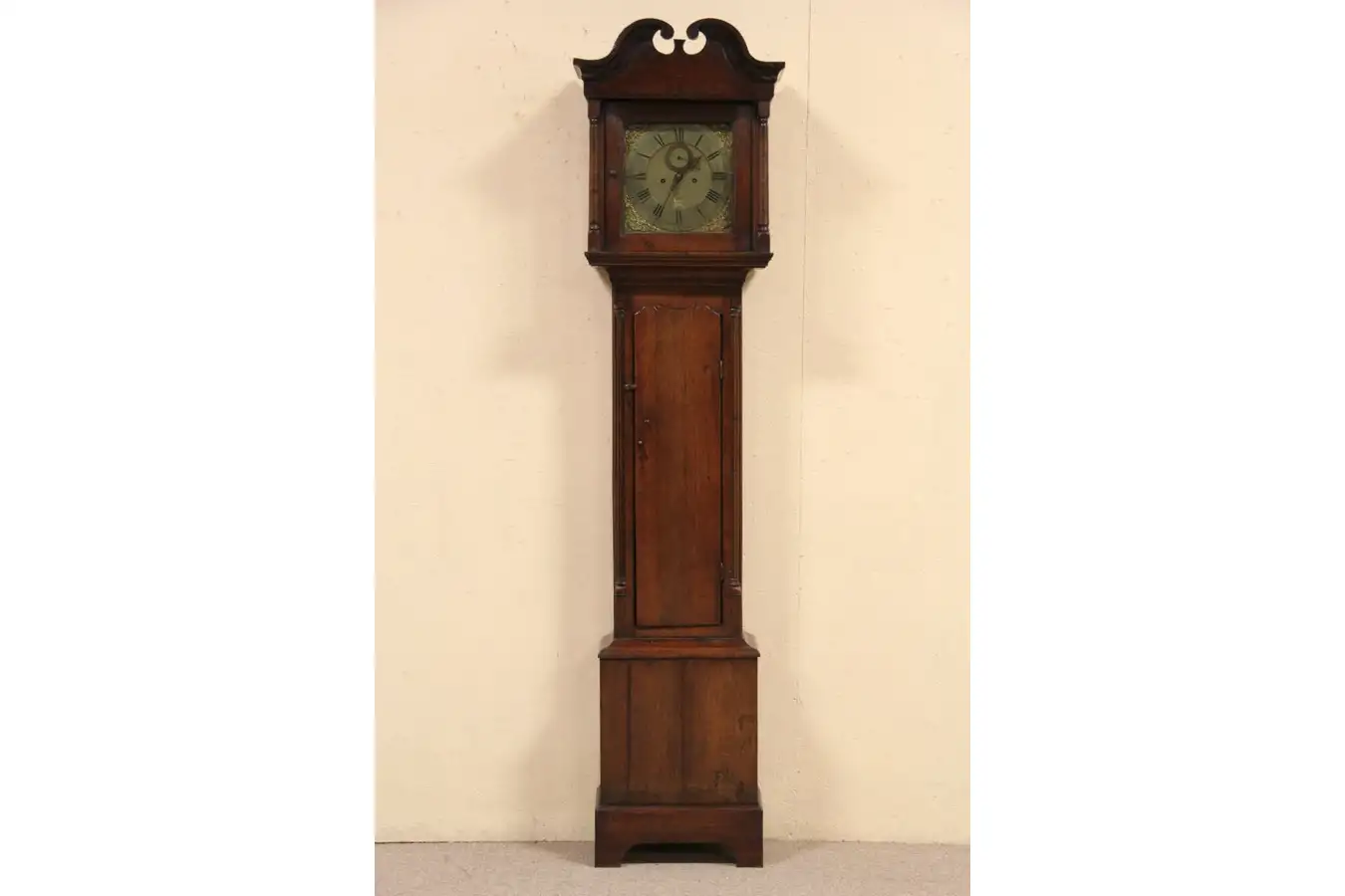 The engraved brass dial is beautiful on this grandfather or long case clock, hand crafted in Marlbro, England about 1825.