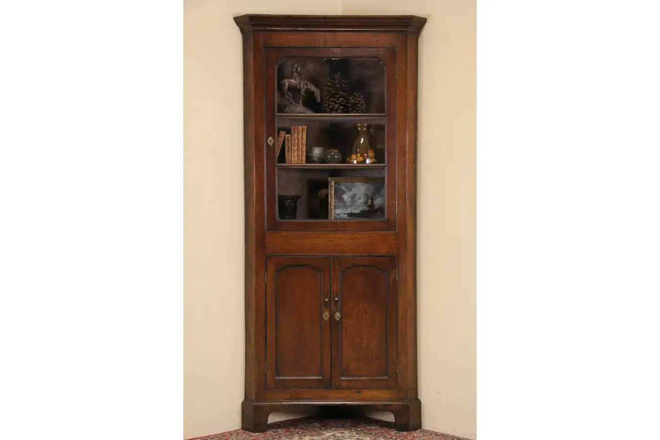 An English corner cupboard from about 1900 is solid fine grained oak. The original finish is very well preserved on this antique furniture.
