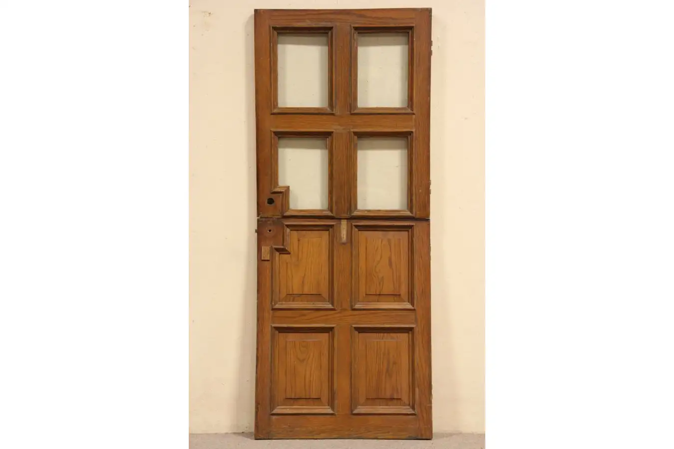 The original finish is worn, top and bottom halves originally swung separately on hinges which are incomplete. Deep moldings are authentic on this historic split door.