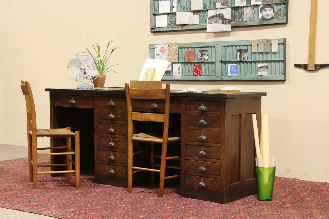Originally made for a school chemistry lab about 1900, an oak double desk or counter could also be a work island, vessel sink vanity or TV console.