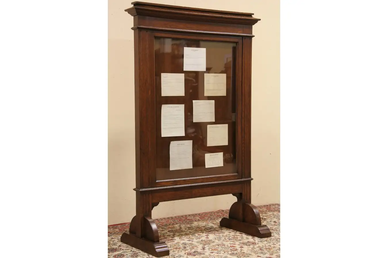 Crafted of solid oak about 1910, this glass window display cabinet would be wonderful for a restaurant menu, church or business bulletin or announcement message board.