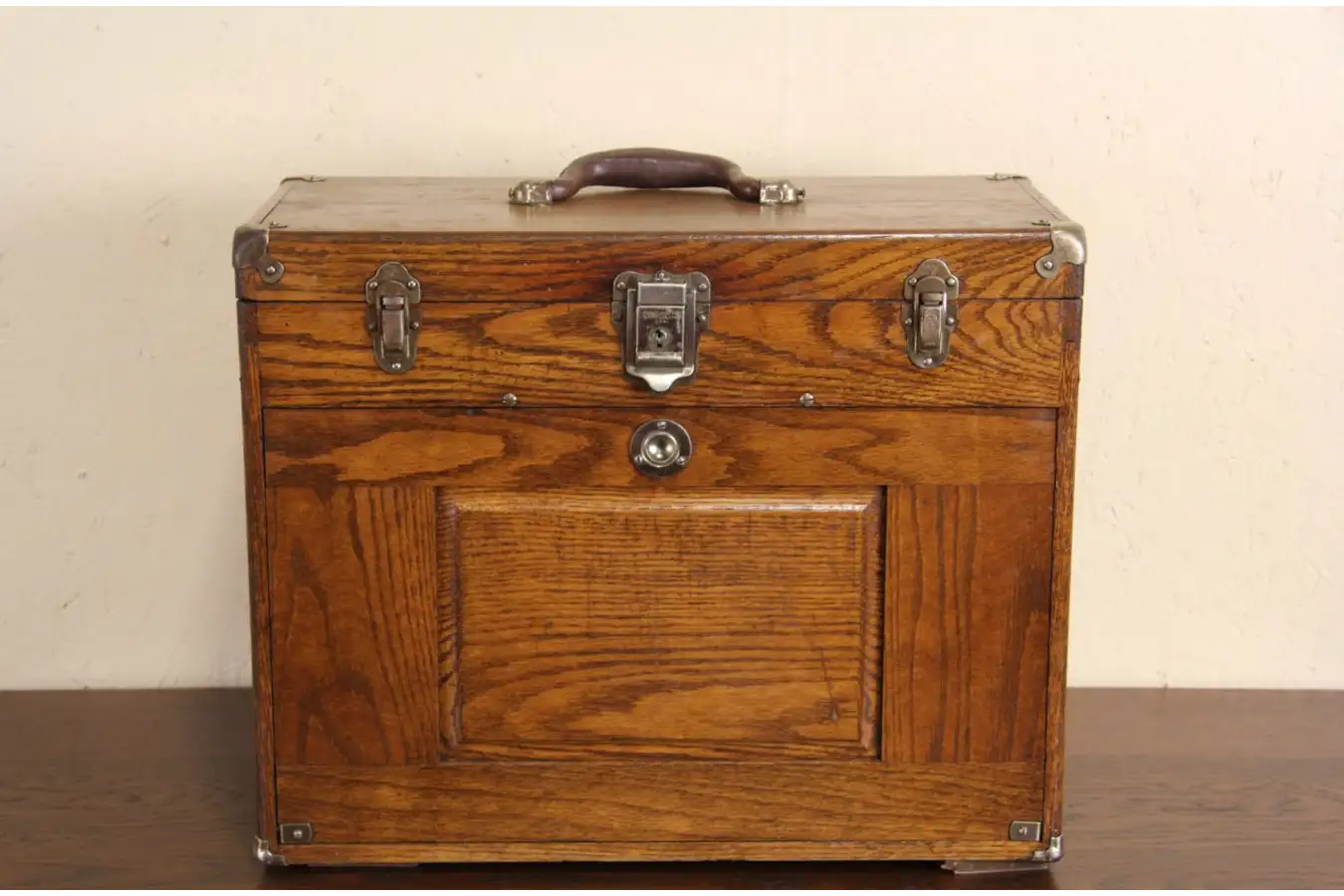 A portable machinist's tool chest from the 1920's makes an interesting jewelry or collector cabinet. Solid oak, the old finish is very well preserved with minor mars for character. There is no key for the lock, signed "Eagle of Connecticut."