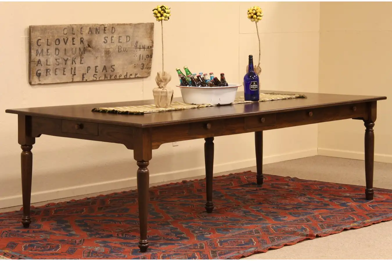 This antique table was used in a Wisconsin boarding school, eight students and a proctor ate meals and studied at this large Victorian period table from the early 1900's, keeping their books in the drawers.