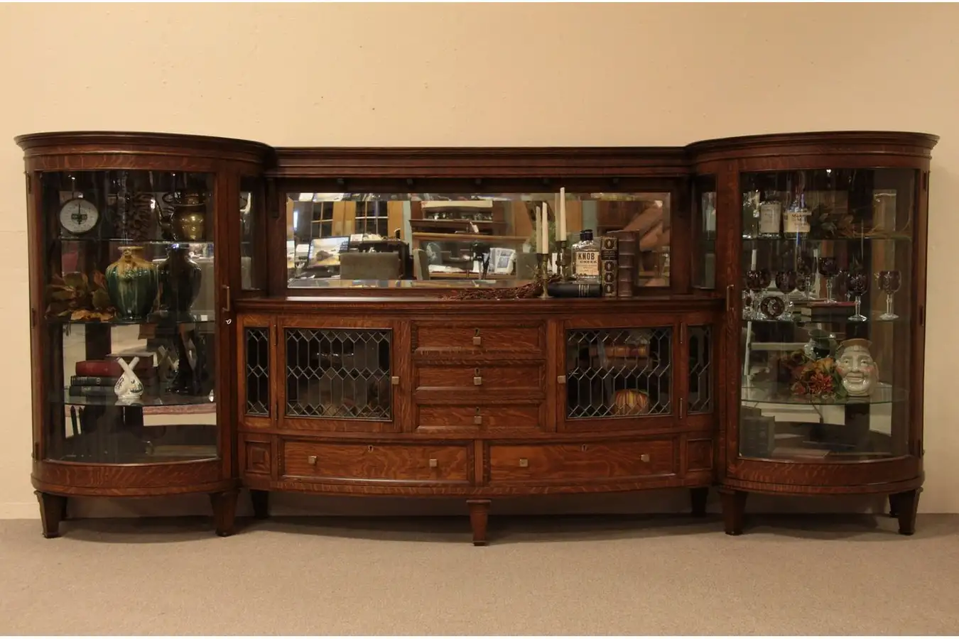 The deep lustrous finish is excellent with just enough patina to show its age. There is some "smoke" to the mirrors, including the large central beveled mirror, which has a narrow gallery above. We see no damage to the curved leaded glass windows or to the old wavy curved glass panes in the curio cabinets at both ends.