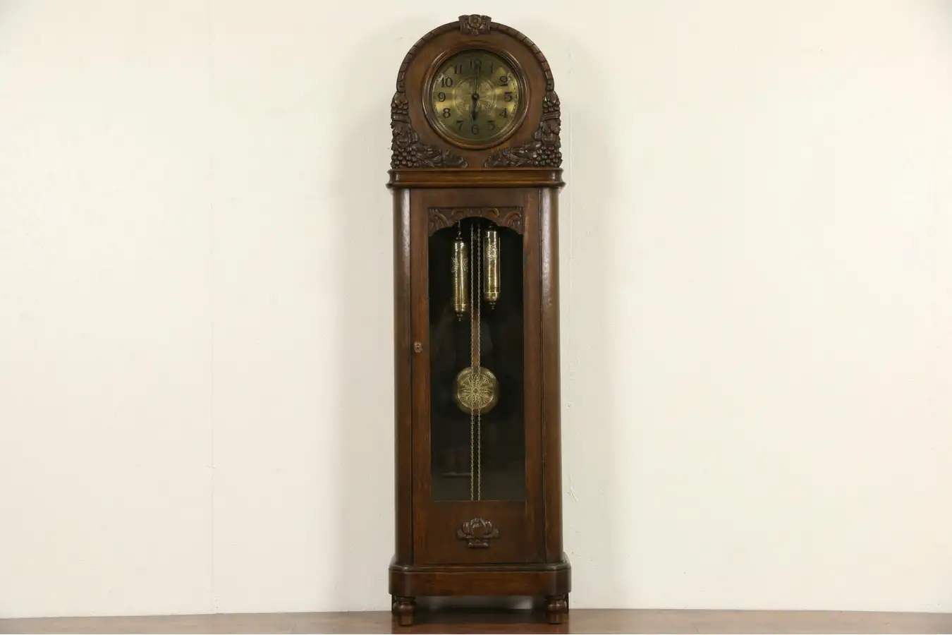 A hand carved German grandfather or tall case clock from the Art Deco period about 1915 has been professionally cleaned and oiled. The brass movement runs for a week on a pull chain winding, and keeps excellent time. A resonant two note chime counts the hour and the half also has a strike. The embossed brass dial, weights and pendulum are original on this antique timepiece.